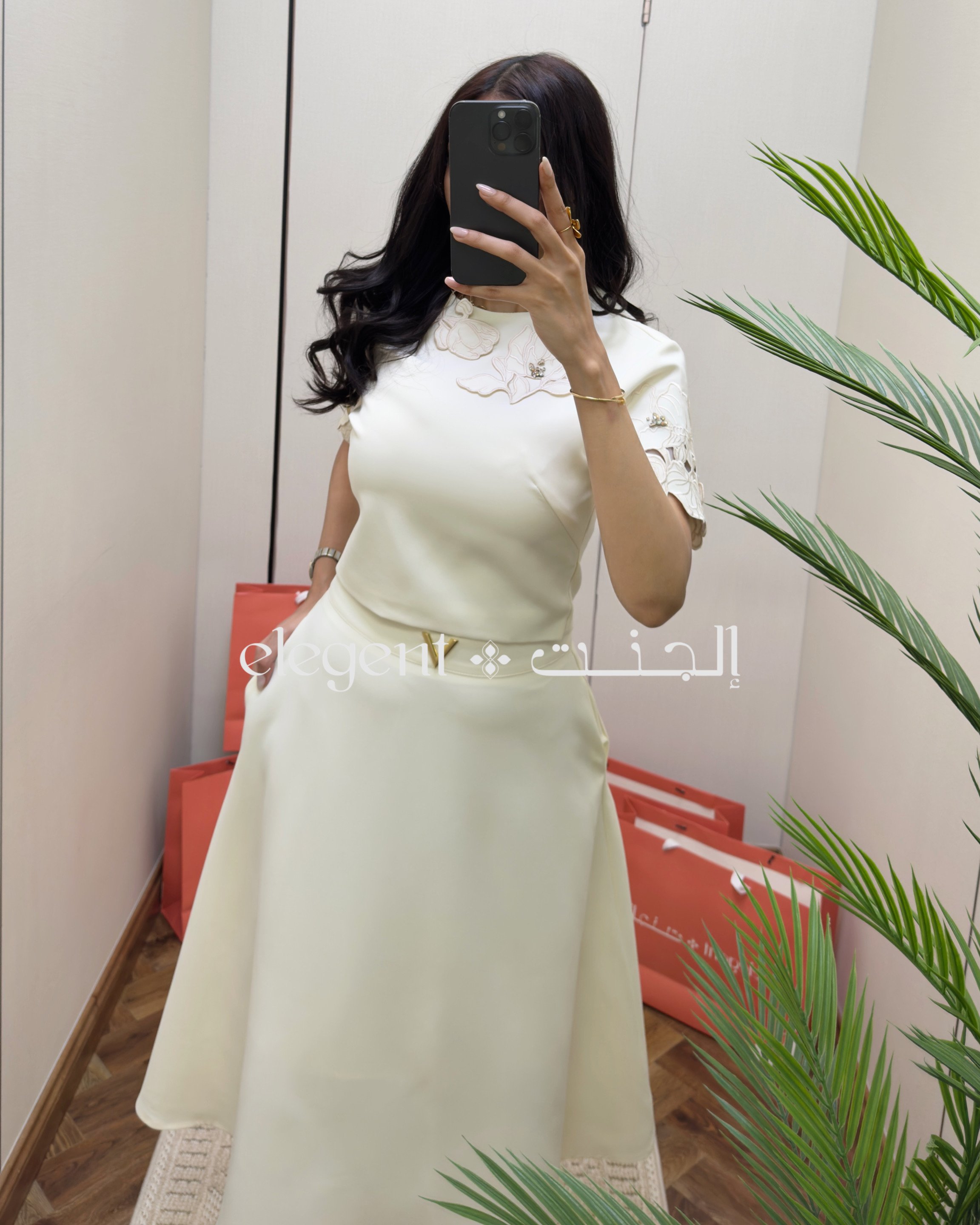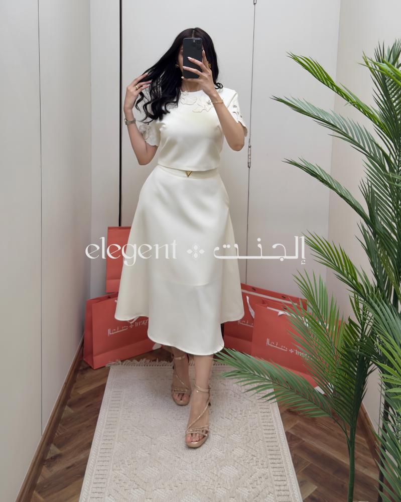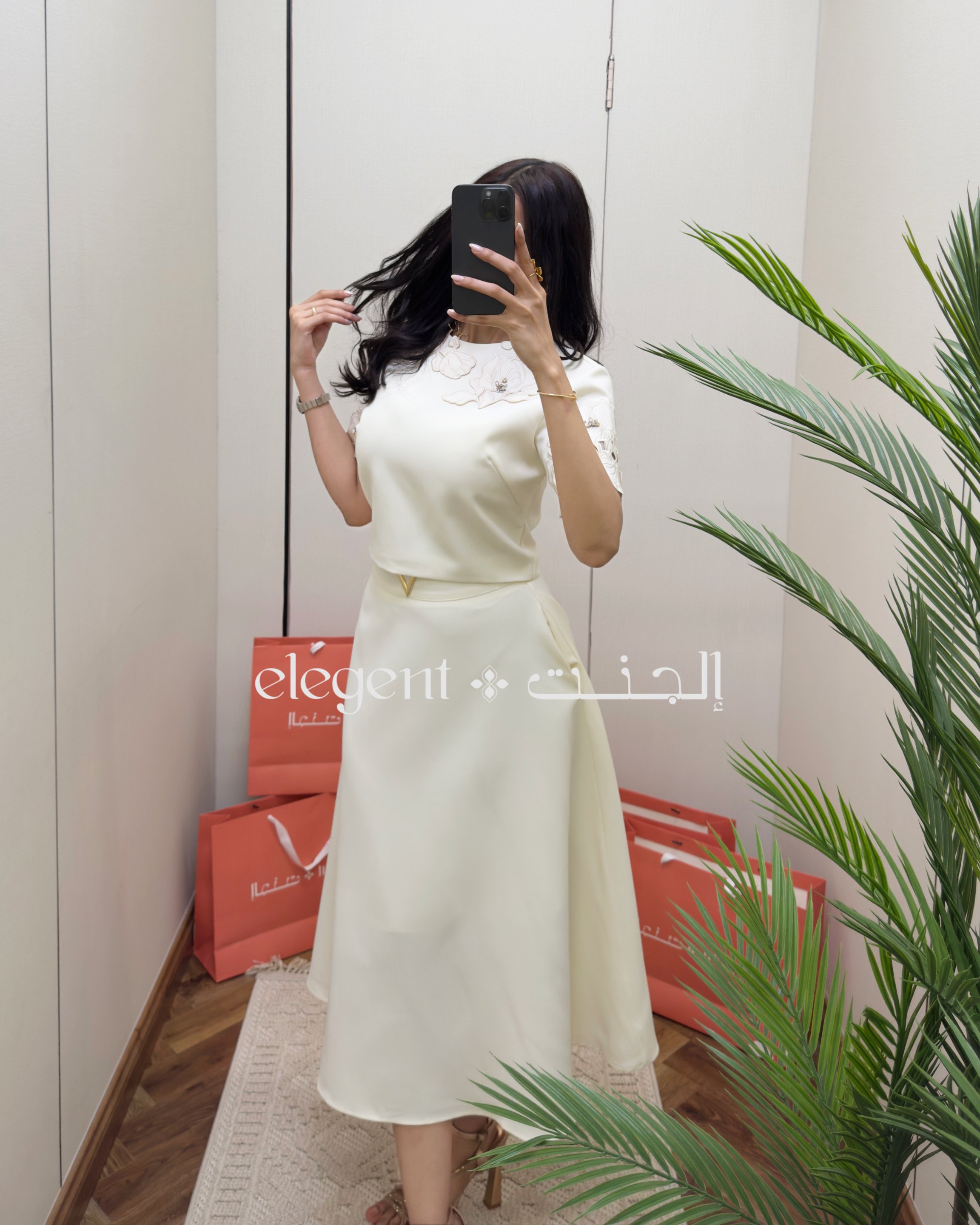يتكون الطقم من بلوزة أنثوية ذات تفاصيل ناعمة، مزينة بتطريز ورد بارز على الأكمام والصدر، مما يضفي عمقاً ثلاثي الأبعاد على التصميم. التنورة تأتي بقصة انسيابية ناعمة تعمل على تعزيز جمال الطقم وتوفير راحة مثالية أثناء ارتدائه. بالإضافة إلى ذلك، فإن القماش القابل للتمدد يضمن لك حرية الحركة في كل الأوقات.