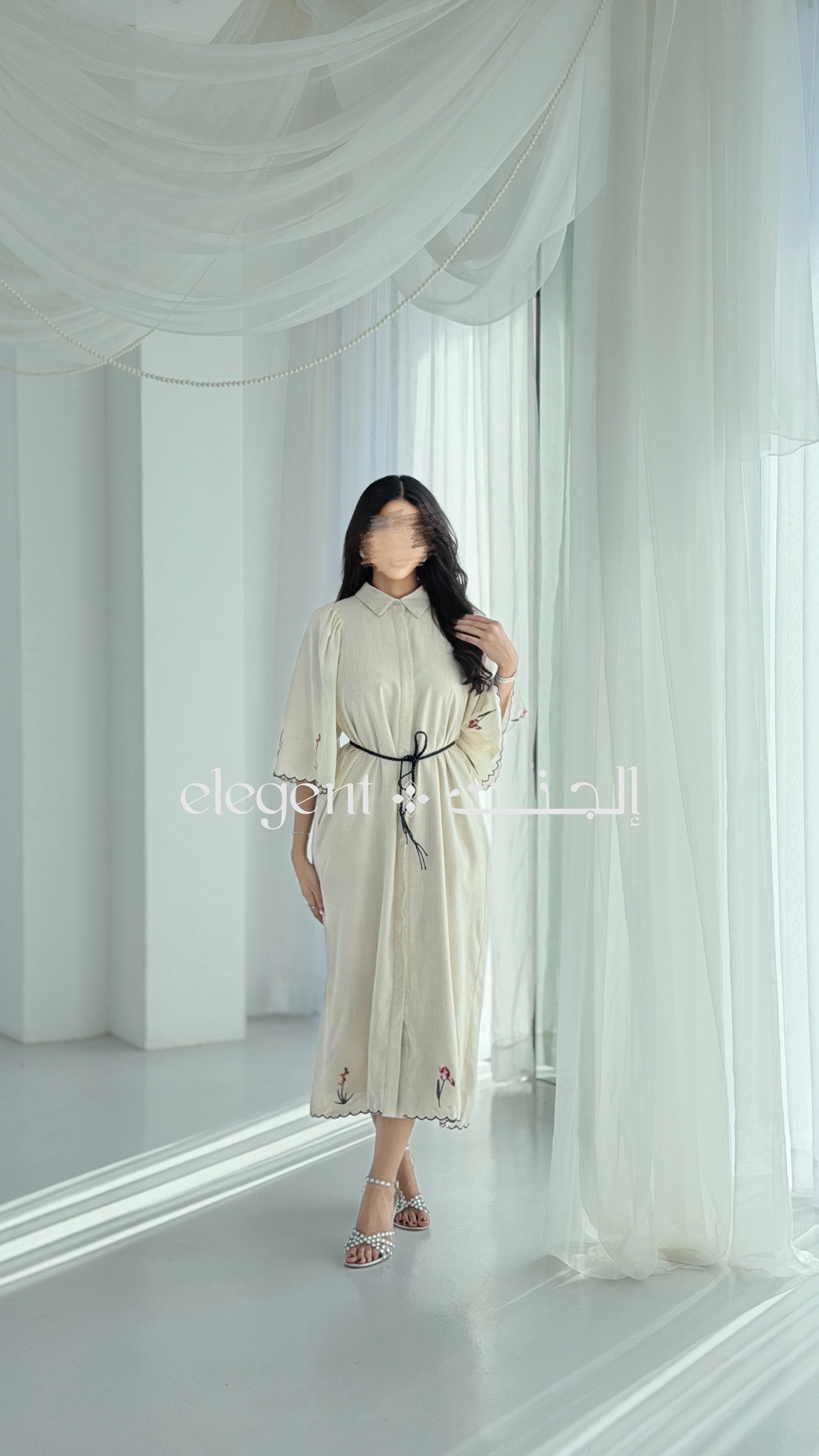 جلابية لينن مطرّزة أنيقة بتطريزات ورد ناعمة وأكمام واسعة