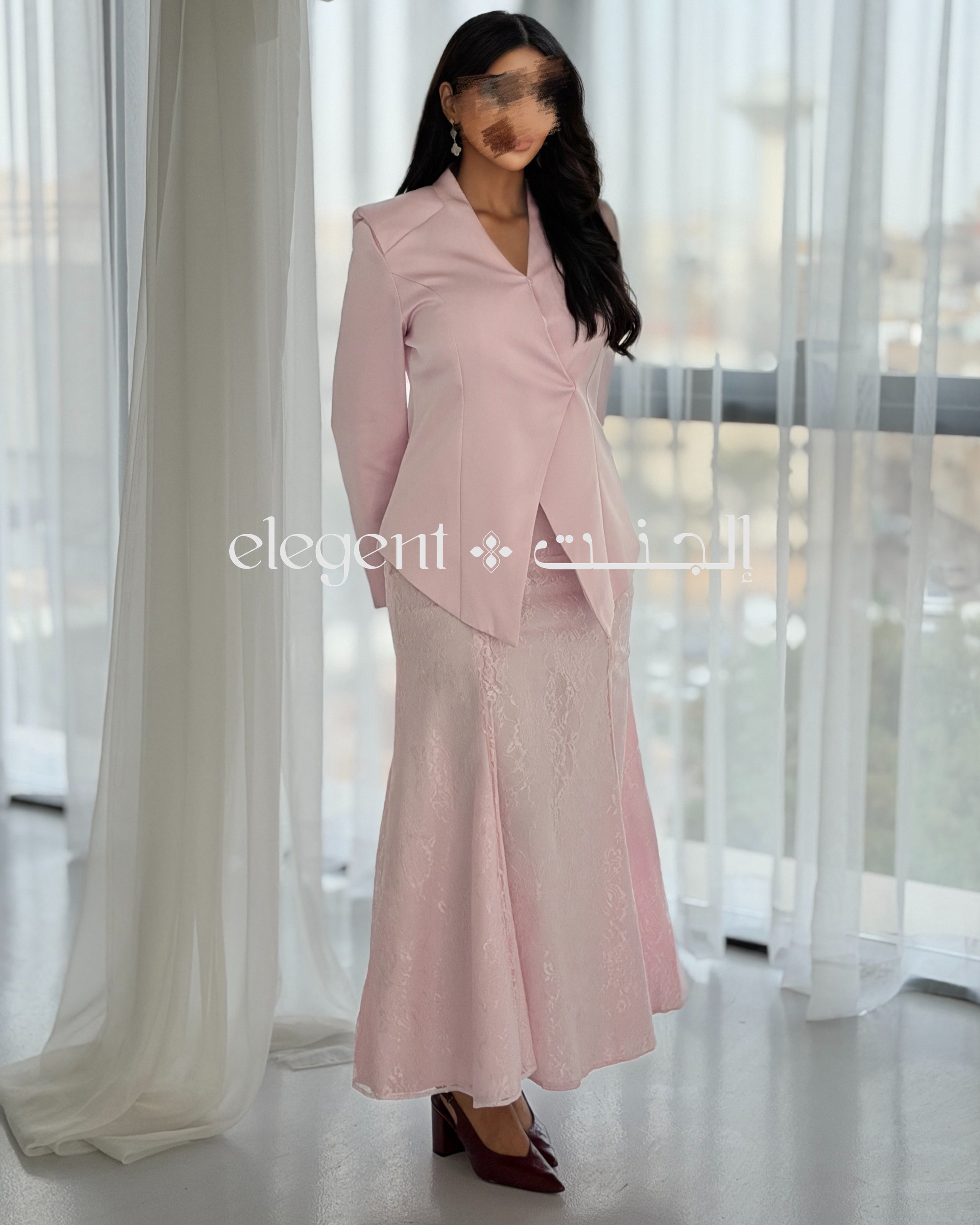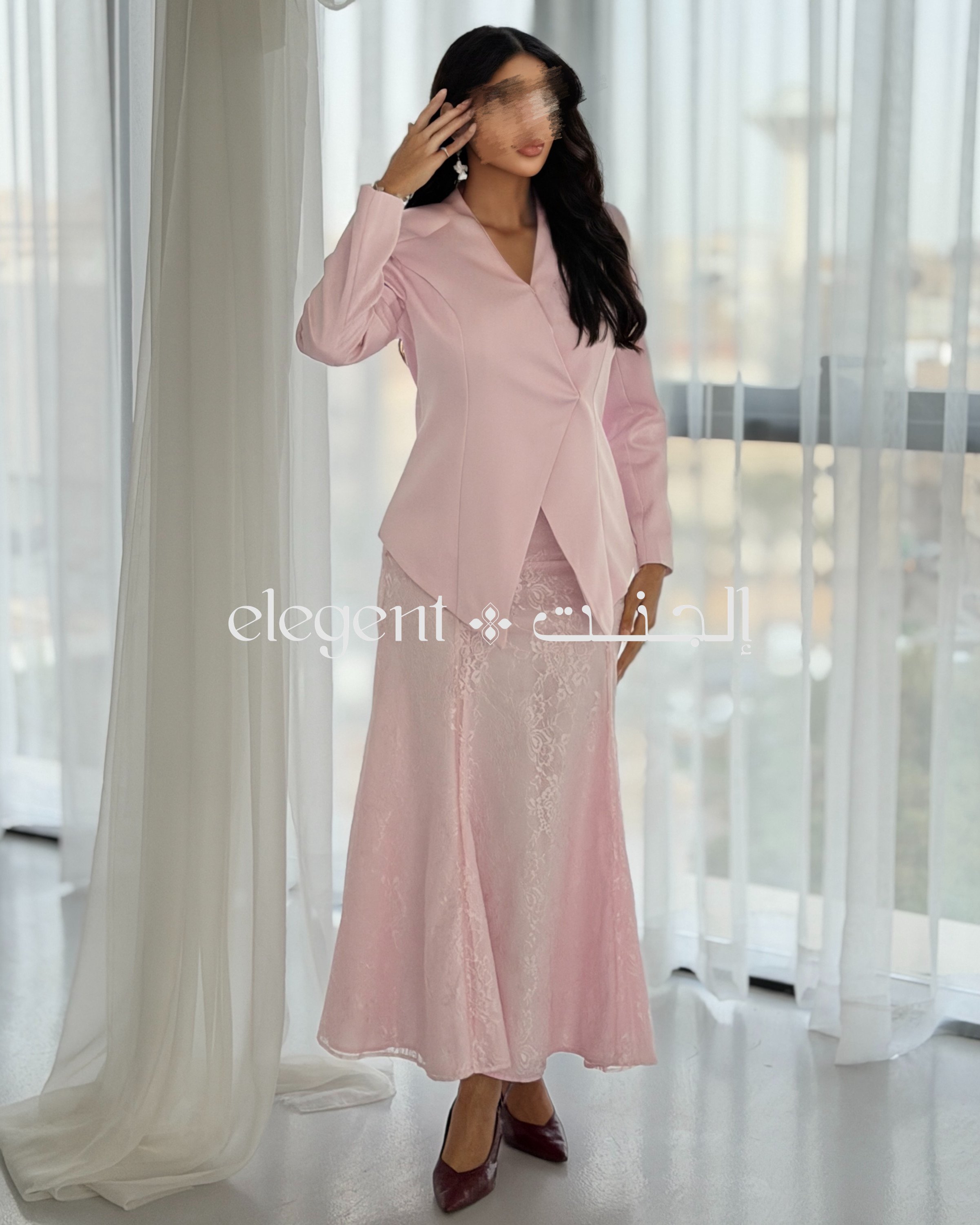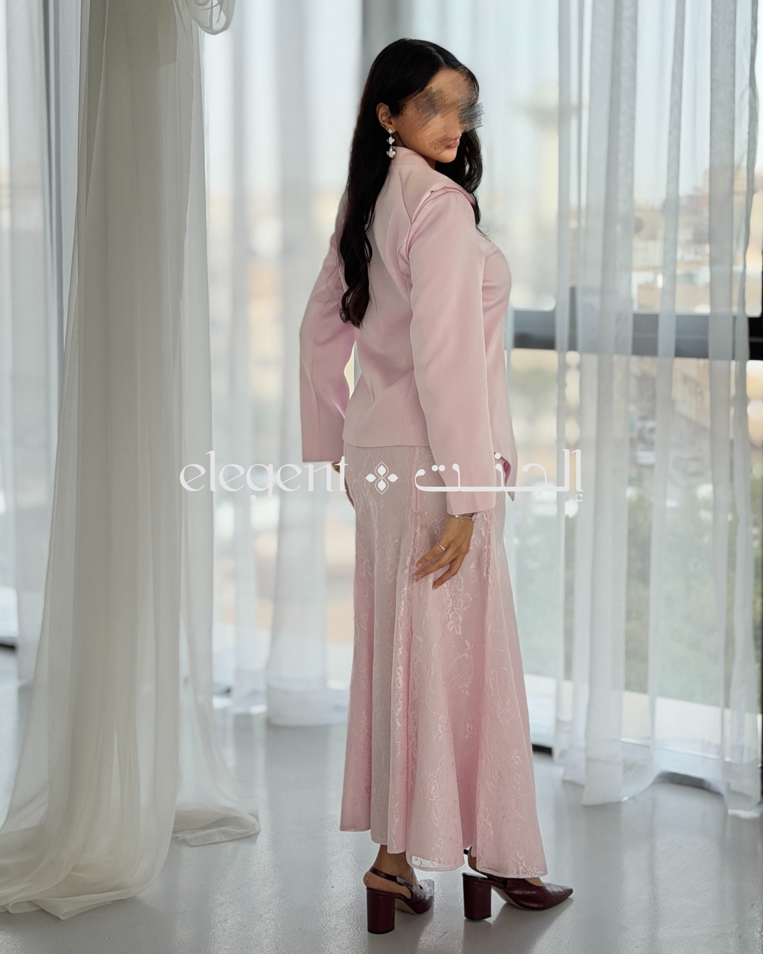 أما التنورة الدانتيل الكاملة، فهي تجسد الأناقة بعمقها وتفاصيلها الدقيقة، حيث تضفي لمسة من الرقي على الطقم. اللون الوردي الهادئ يعزز من جمال التصميم، مما يجعله خياراً مثالياً للمناسبات الراقية، مثل حفلات العشاء والاجتماعات، حيث تحتاجين إلى إطلالة تجمع بين الفخامة والرقي.