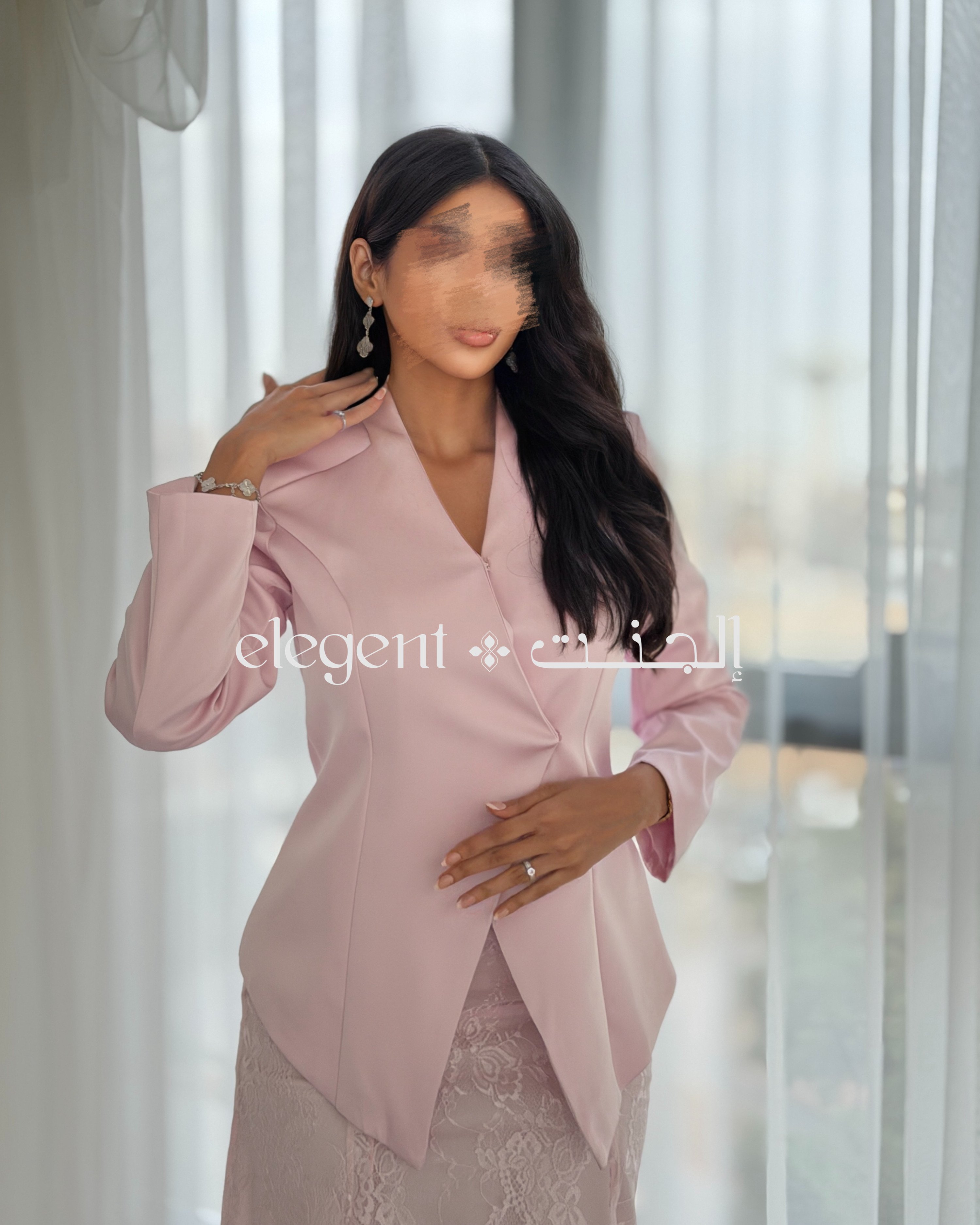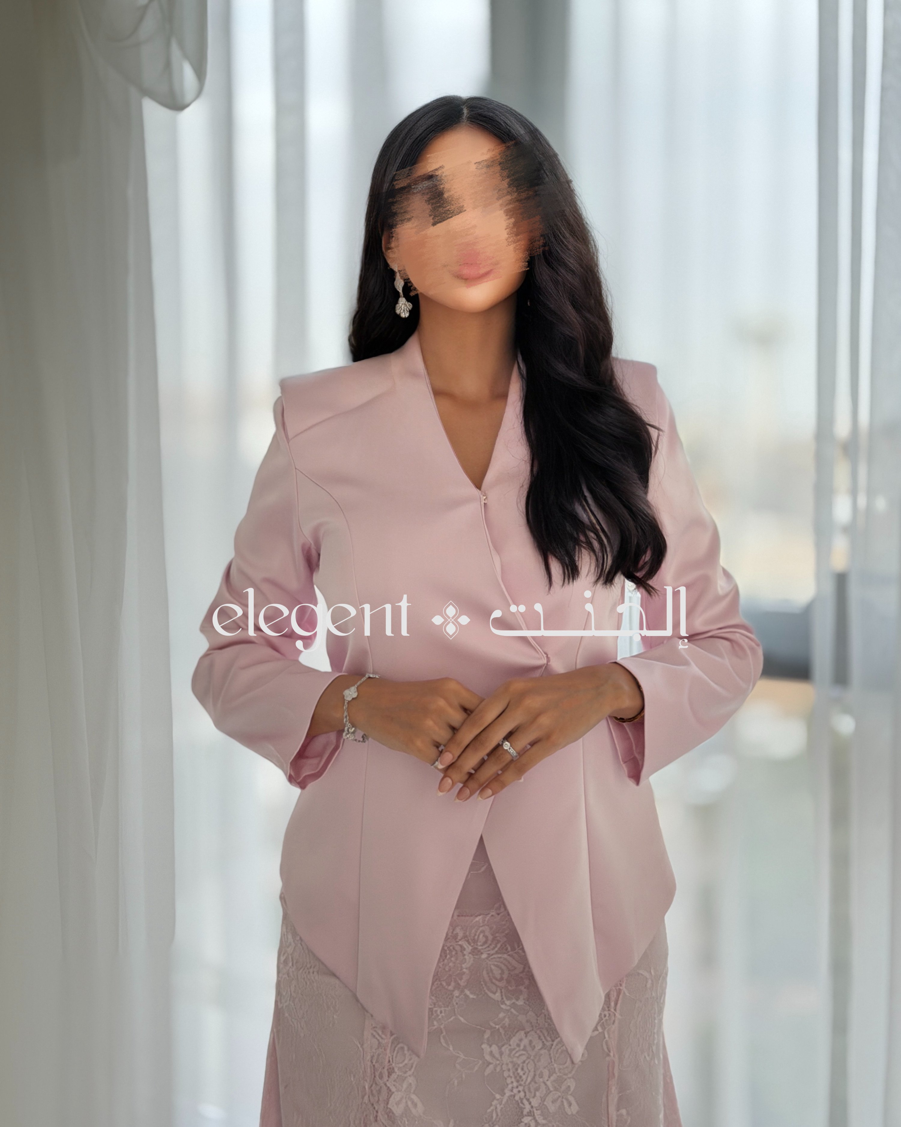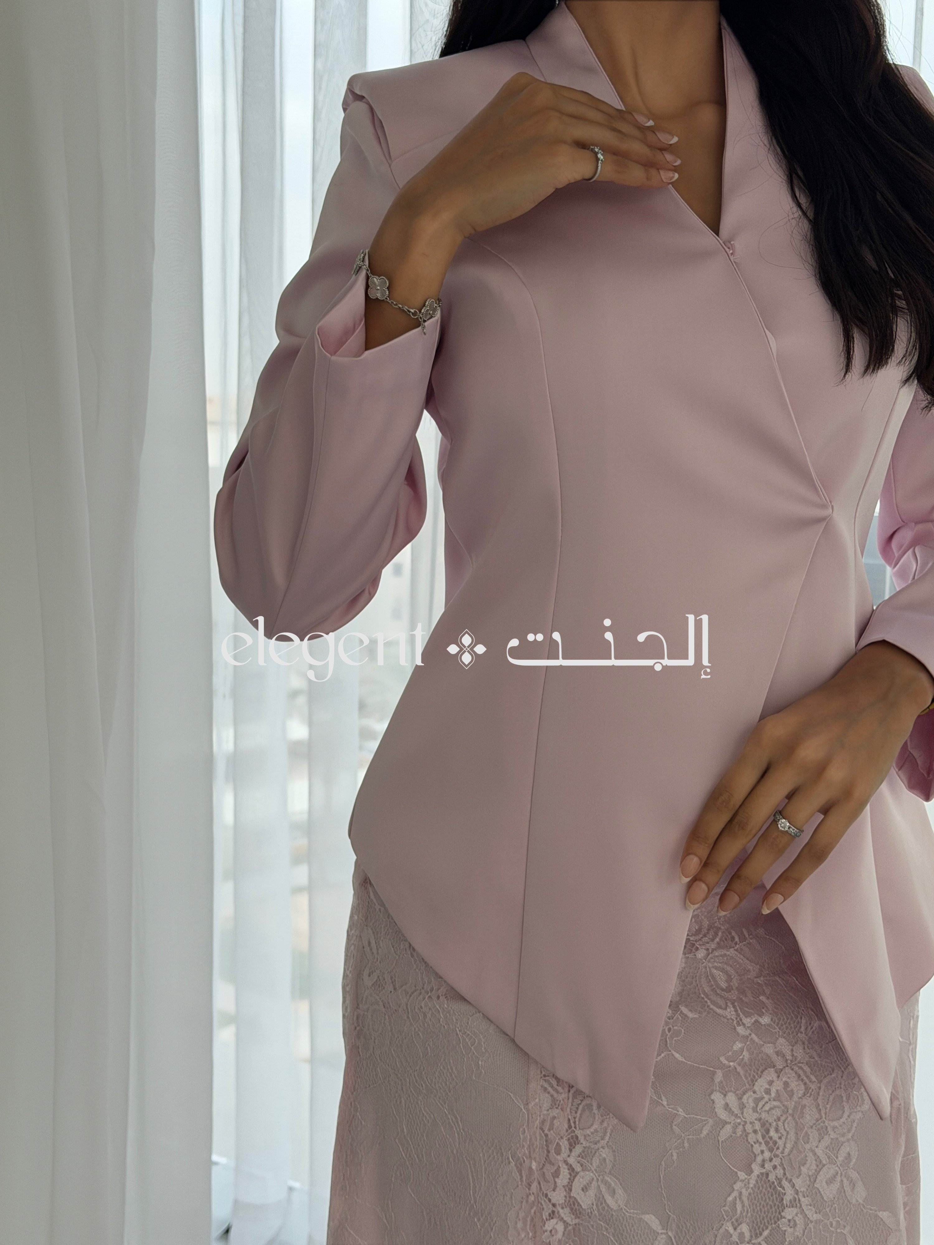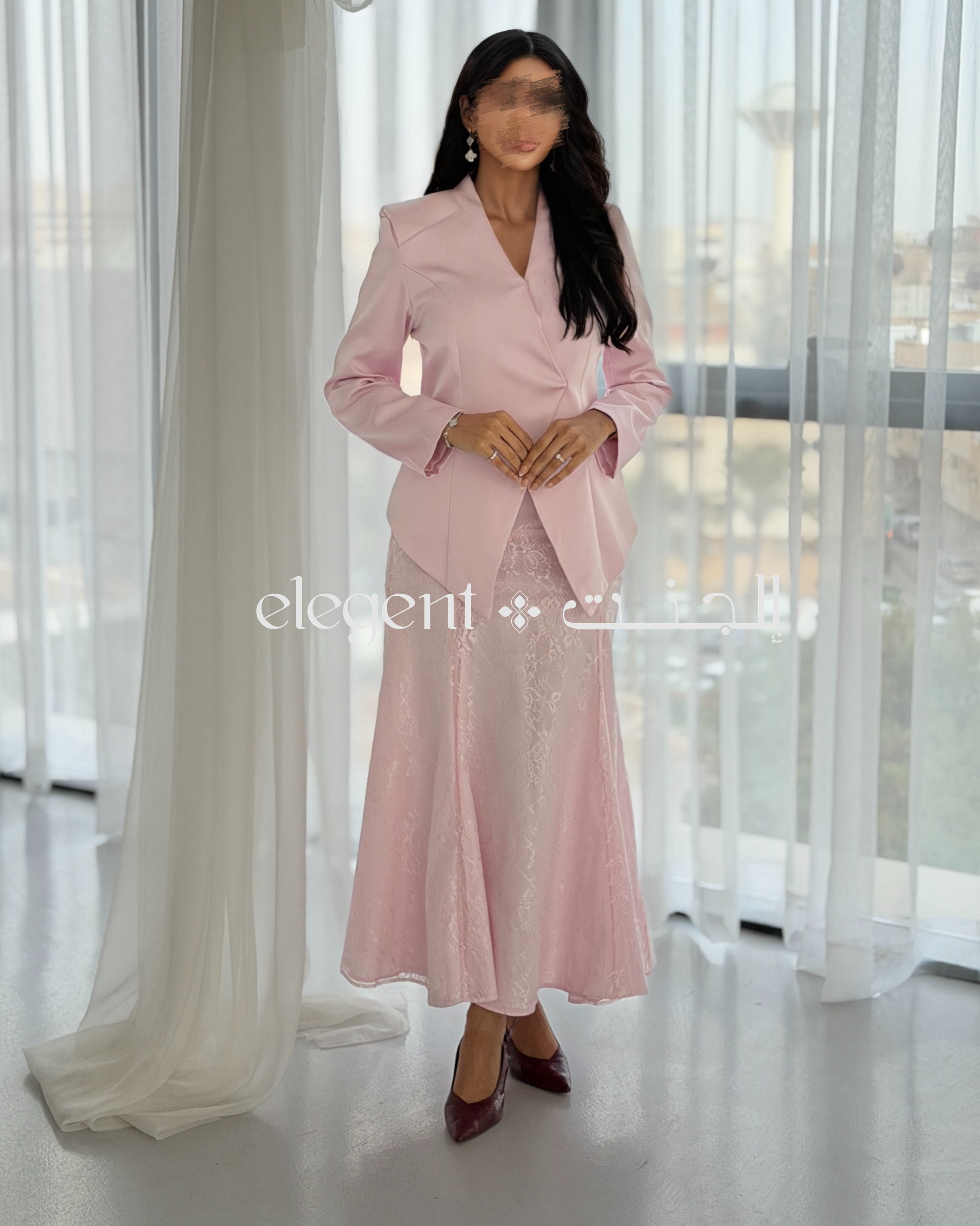 أما التنورة الدانتيل الكاملة، فهي تجسد الأناقة بعمقها وتفاصيلها الدقيقة، حيث تضفي لمسة من الرقي على الطقم. اللون الوردي الهادئ يعزز من جمال التصميم، مما يجعله خياراً مثالياً للمناسبات الراقية، مثل حفلات العشاء والاجتماعات، حيث تحتاجين إلى إطلالة تجمع بين الفخامة والرقي.
