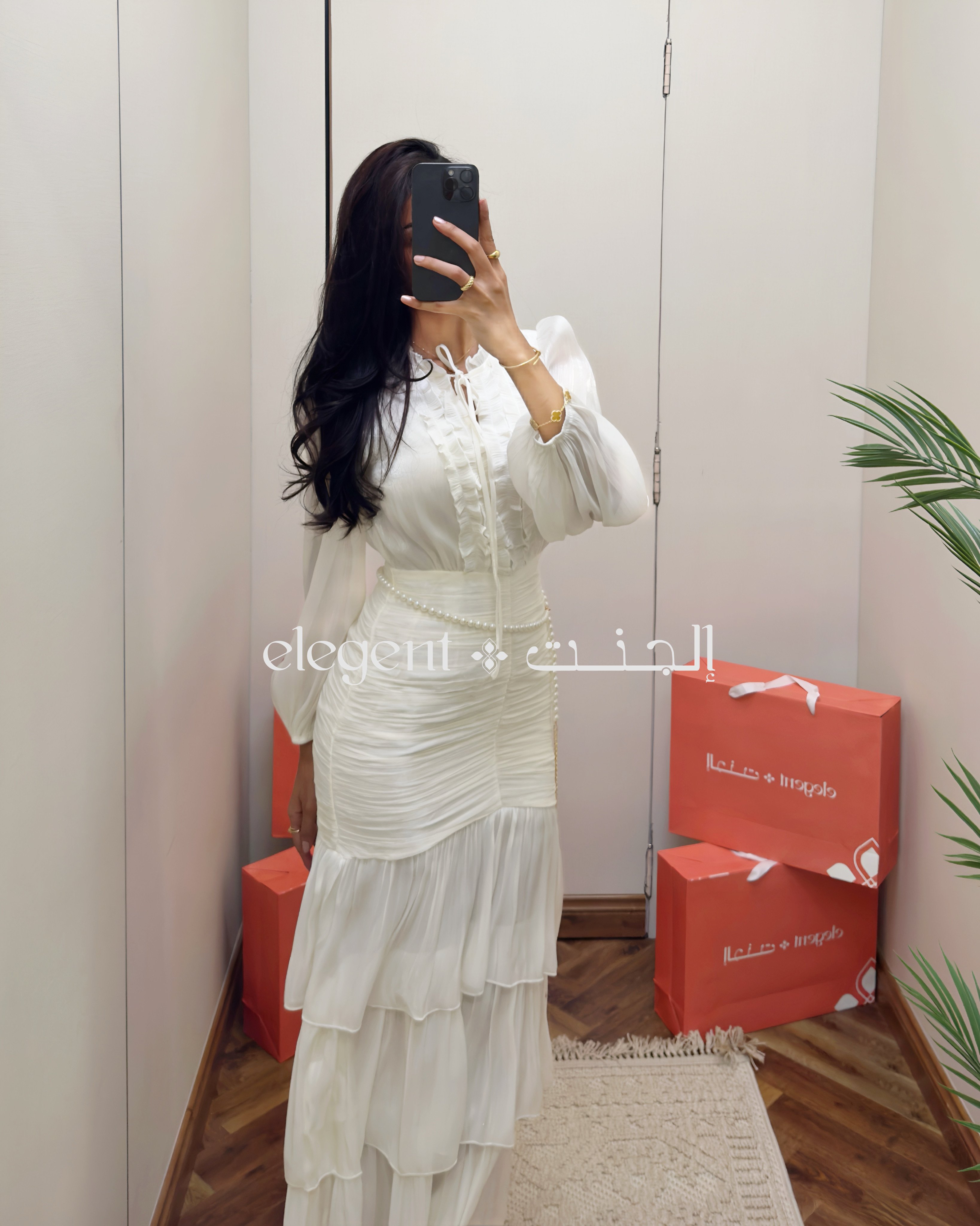 فستان أبيض بكسرات وطبقات أورجنزا ناعمة