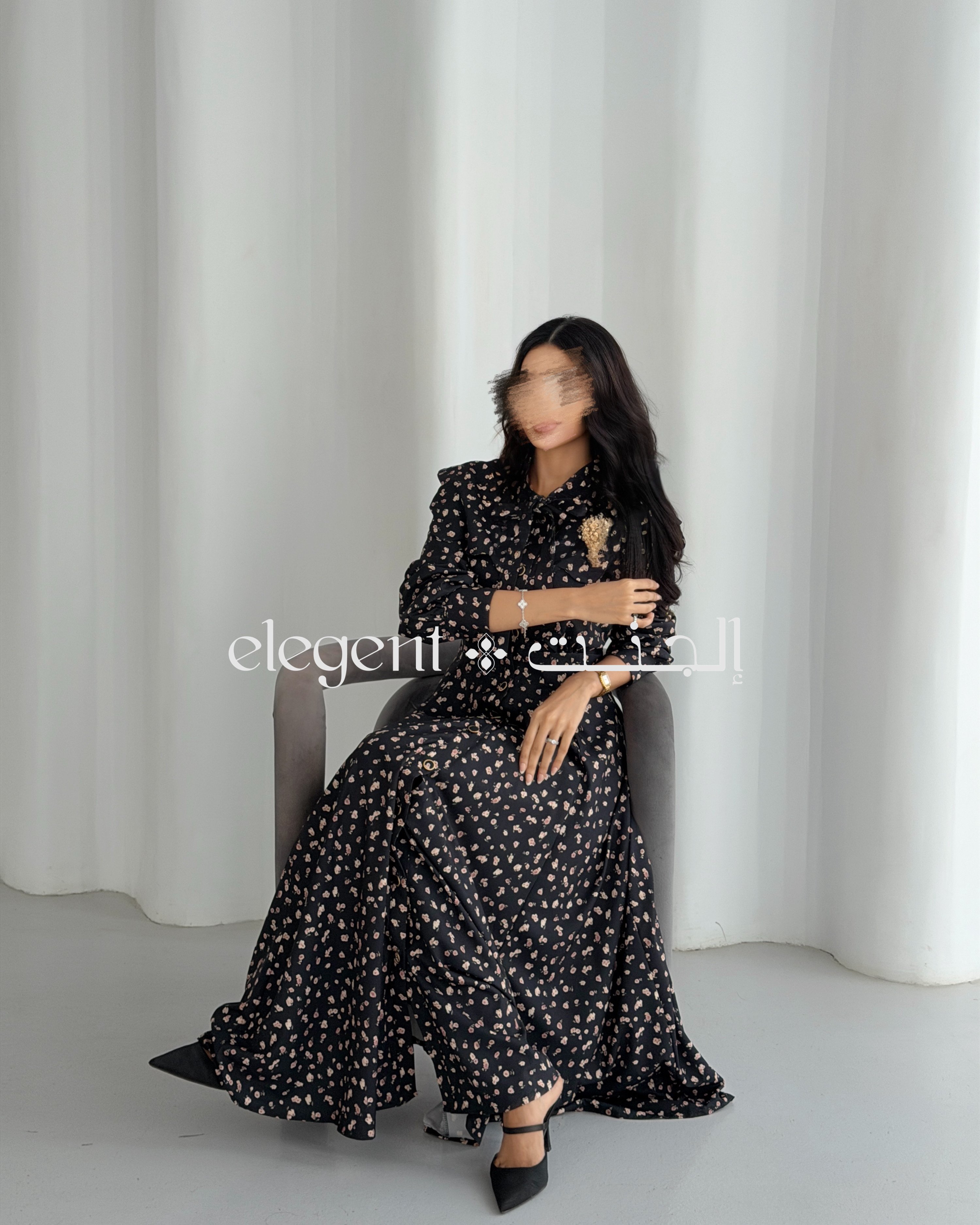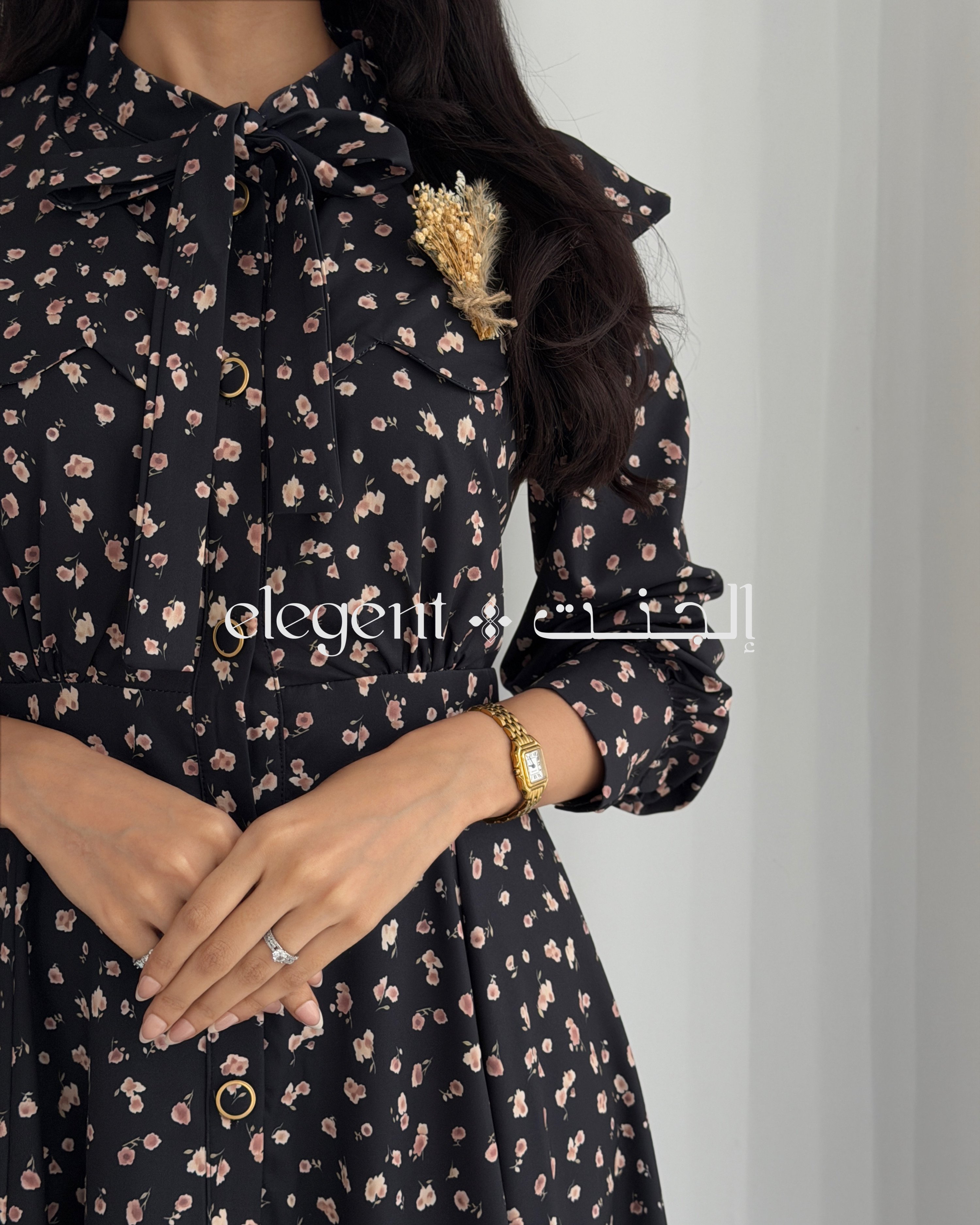 يأتي الفستان مزوّدًا بربطة عنق أنثوية تضيف لمسة من الأناقة، بالإضافة إلى صف أزرار كامل يمتد من الأعلى إلى الأسفل، مما يسهل عملية الارتداء ويعزز من مظهره الأنيق. النقشة الزهرية الصغيرة تضفي روحًا مرحة وراقية، مما يجعله خيارًا مثاليًا للمناسبات المختلفة، سواء كانت زيارات عائلية أو مشاوير يومية.