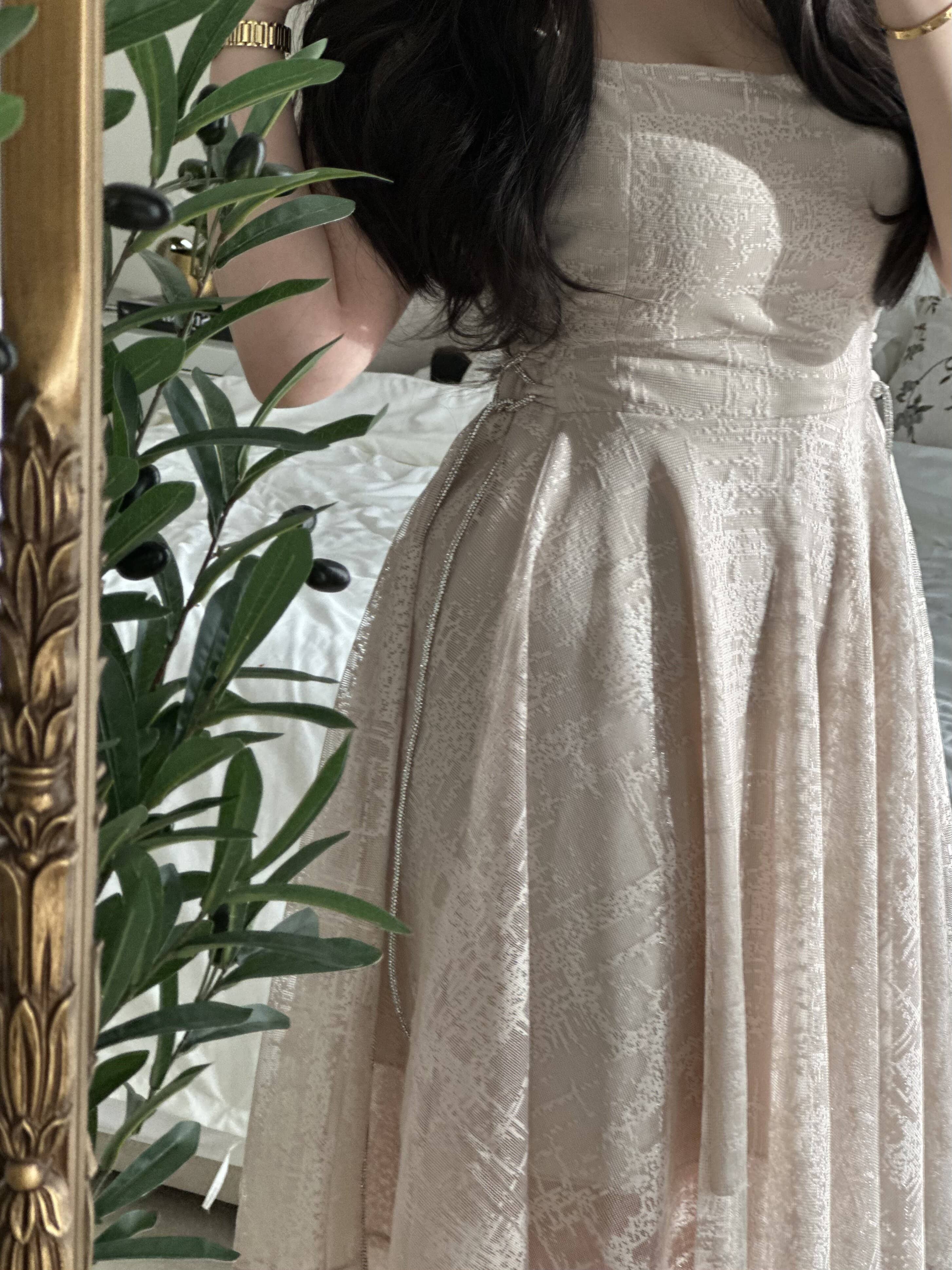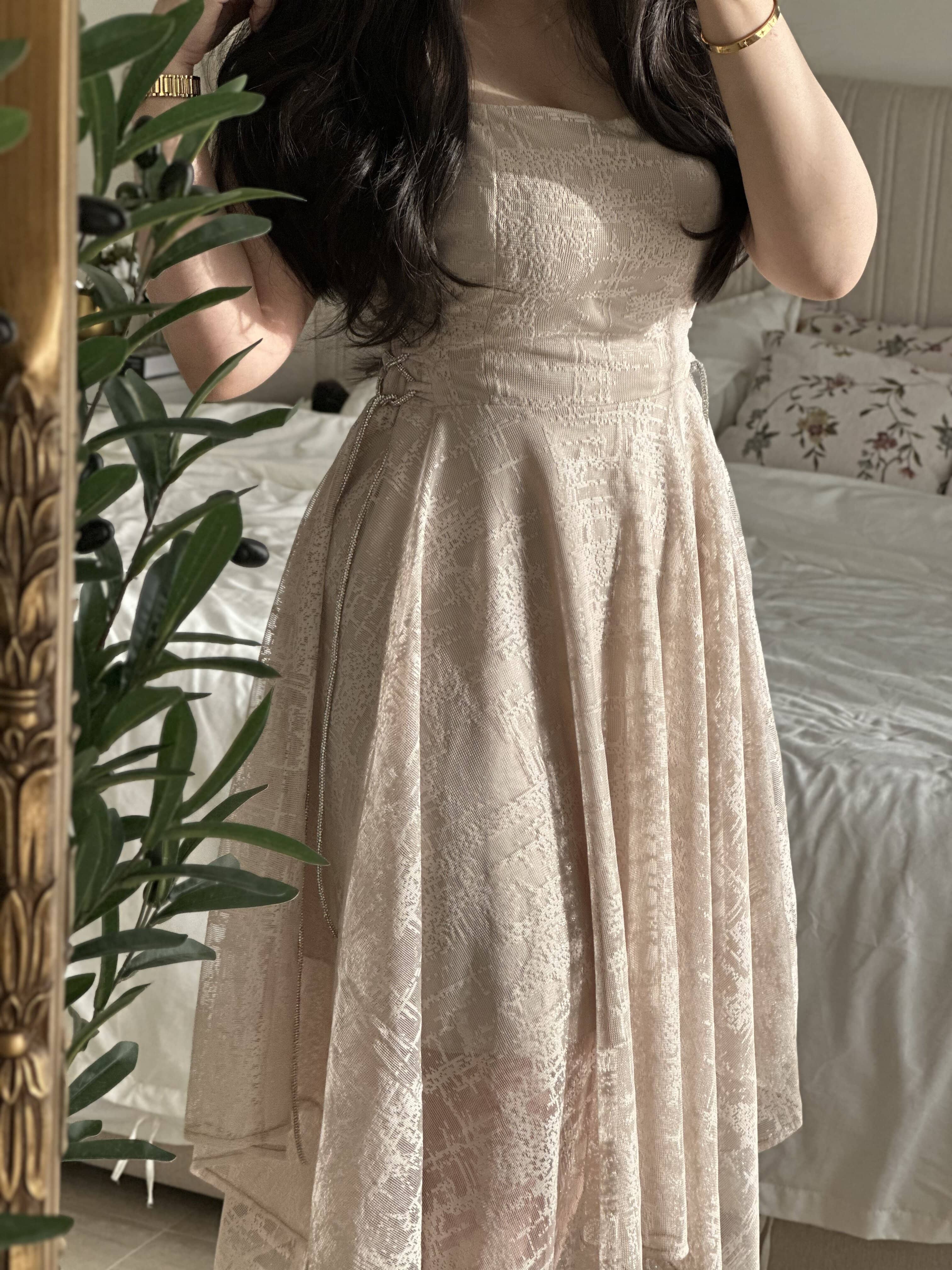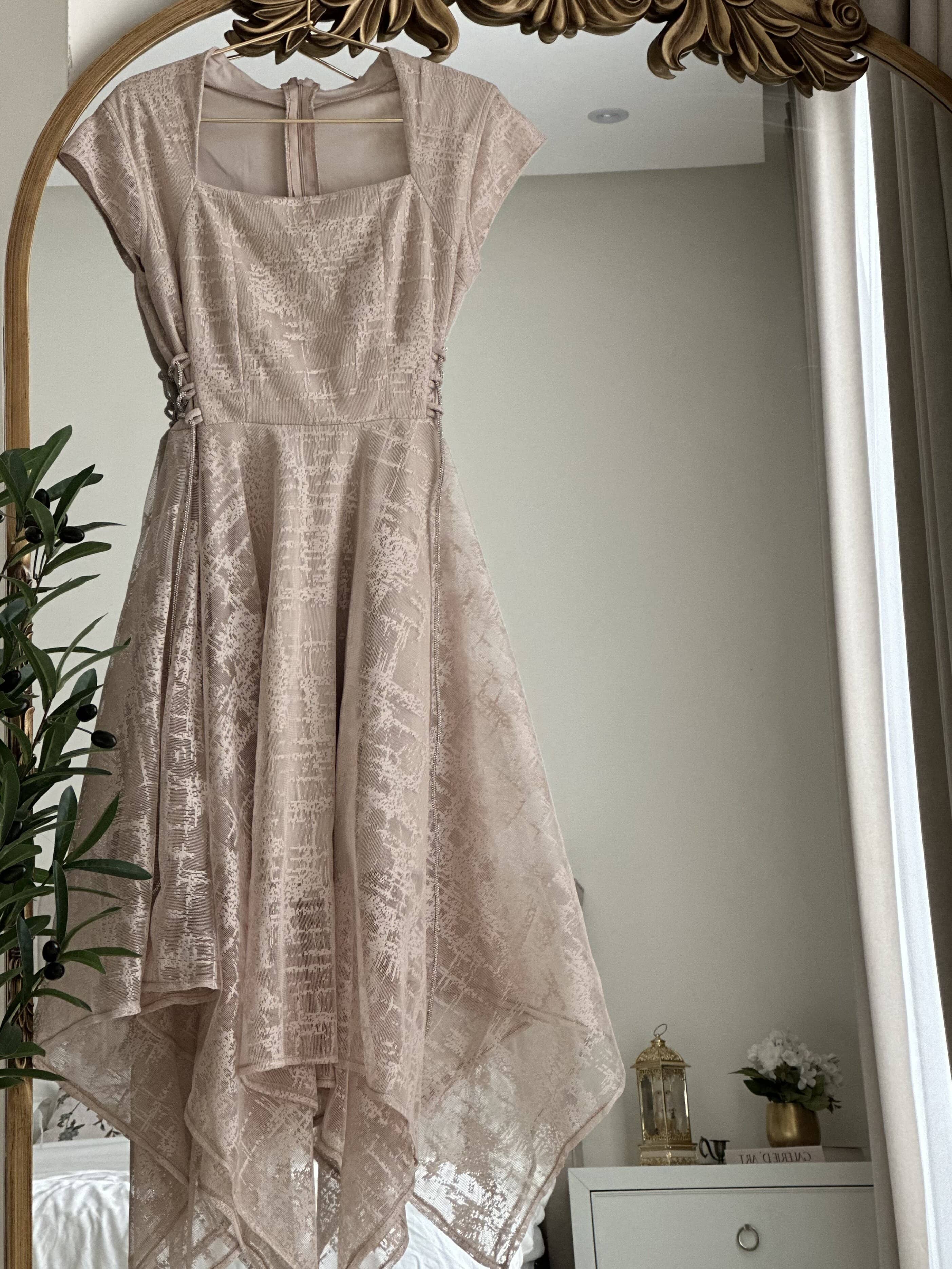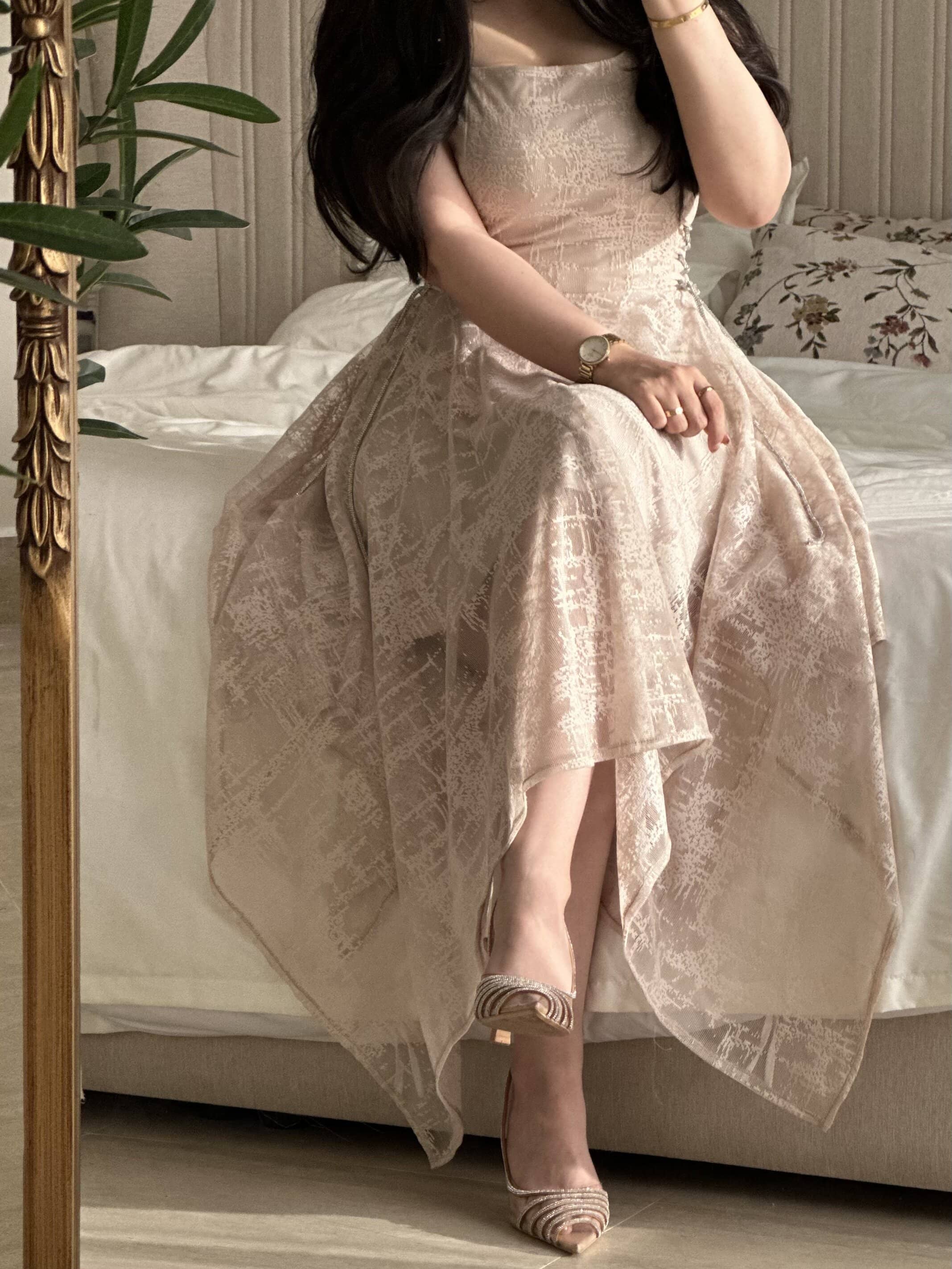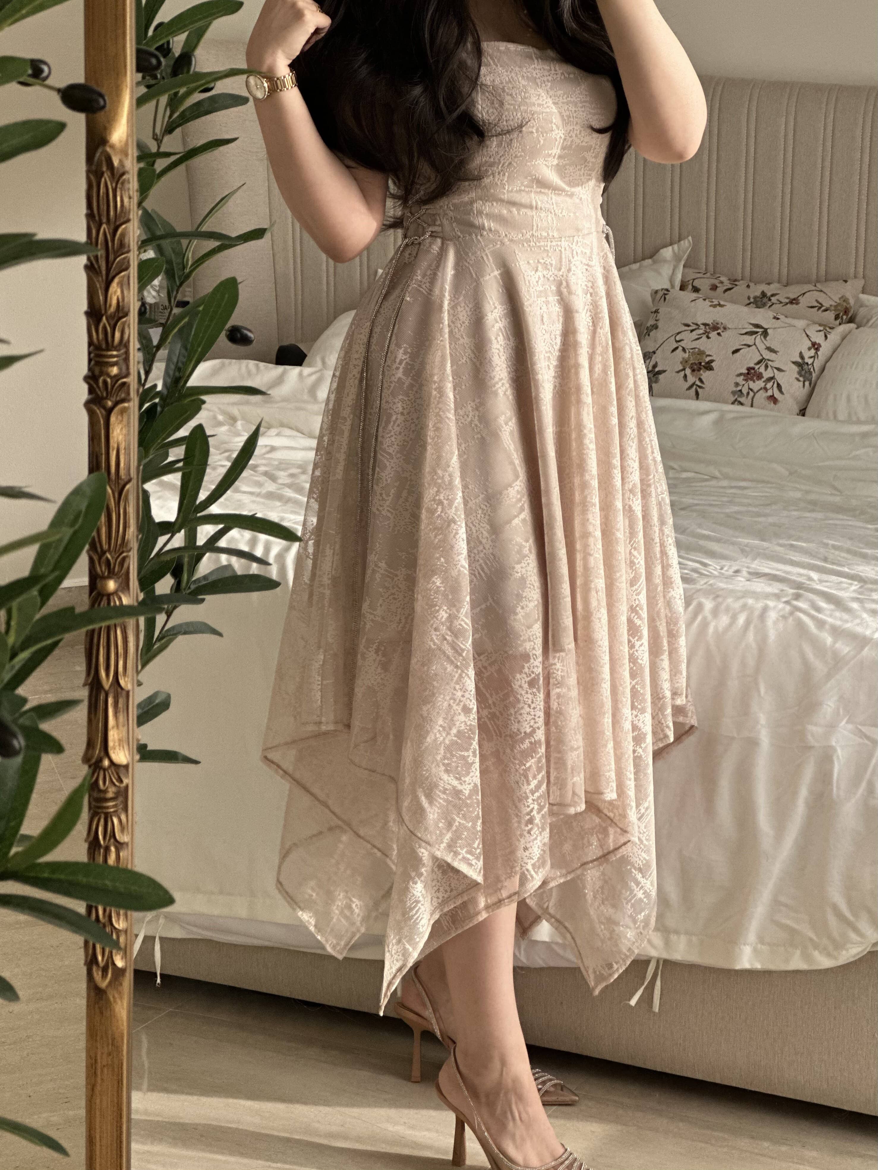 يتميز الفستان بقصة غير متماثلة بأسلوب “هاندكيرشف”، مما يمنحك إطلالة فريدة وجذابة. طول الفستان يبلغ 135 سم، مما يجعله مناسباً لمختلف الأطوال، حيث يمكن أن يظهر بشكل رائع سواء كنت ترتدين أحذية بكعب عالٍ أو مسطحة. كما أن لونه البيج الفاتح يضفي هدوءاً وأناقة، ويجعل من السهل تنسيقه مع مختلف الألوان والإكسسوارات.