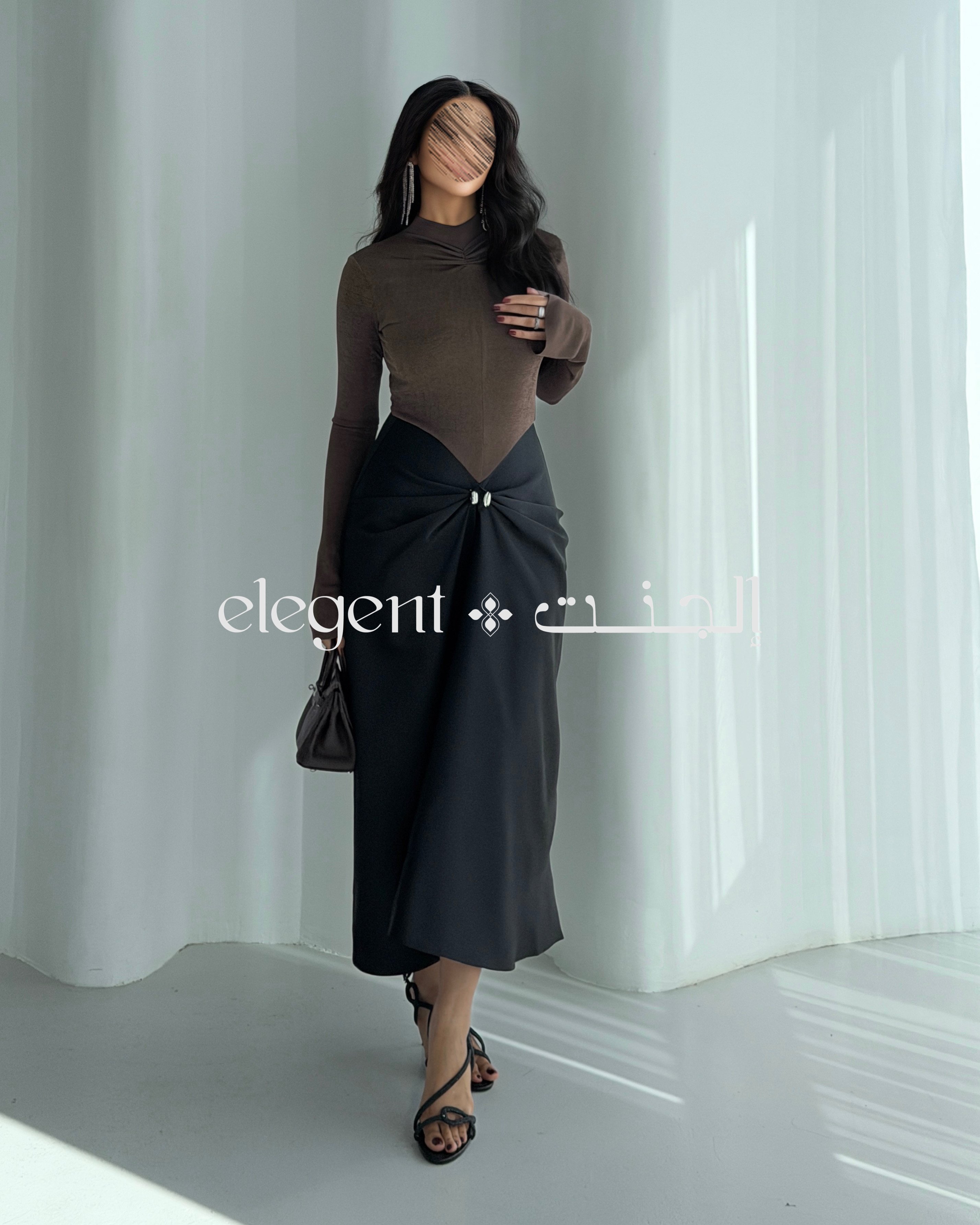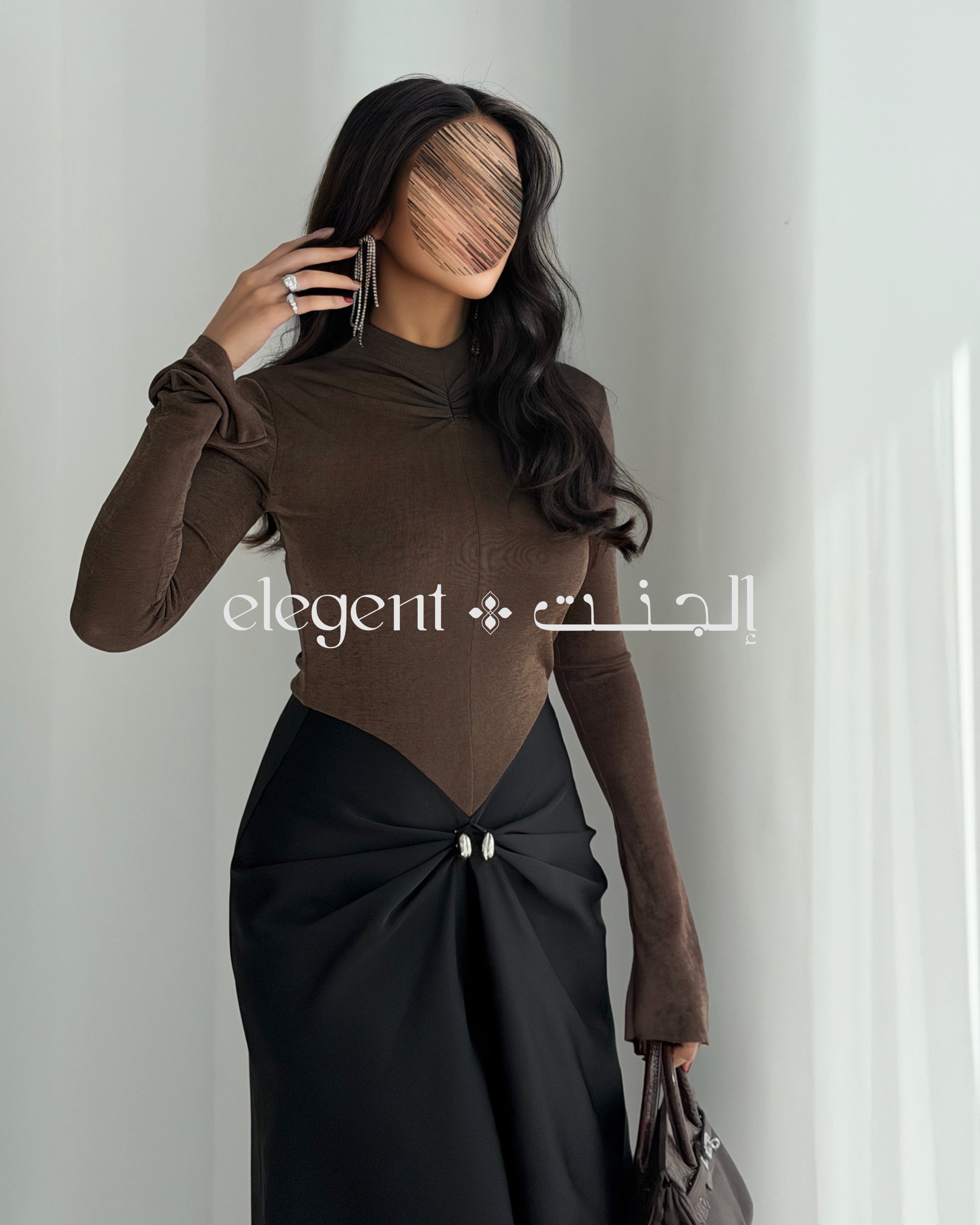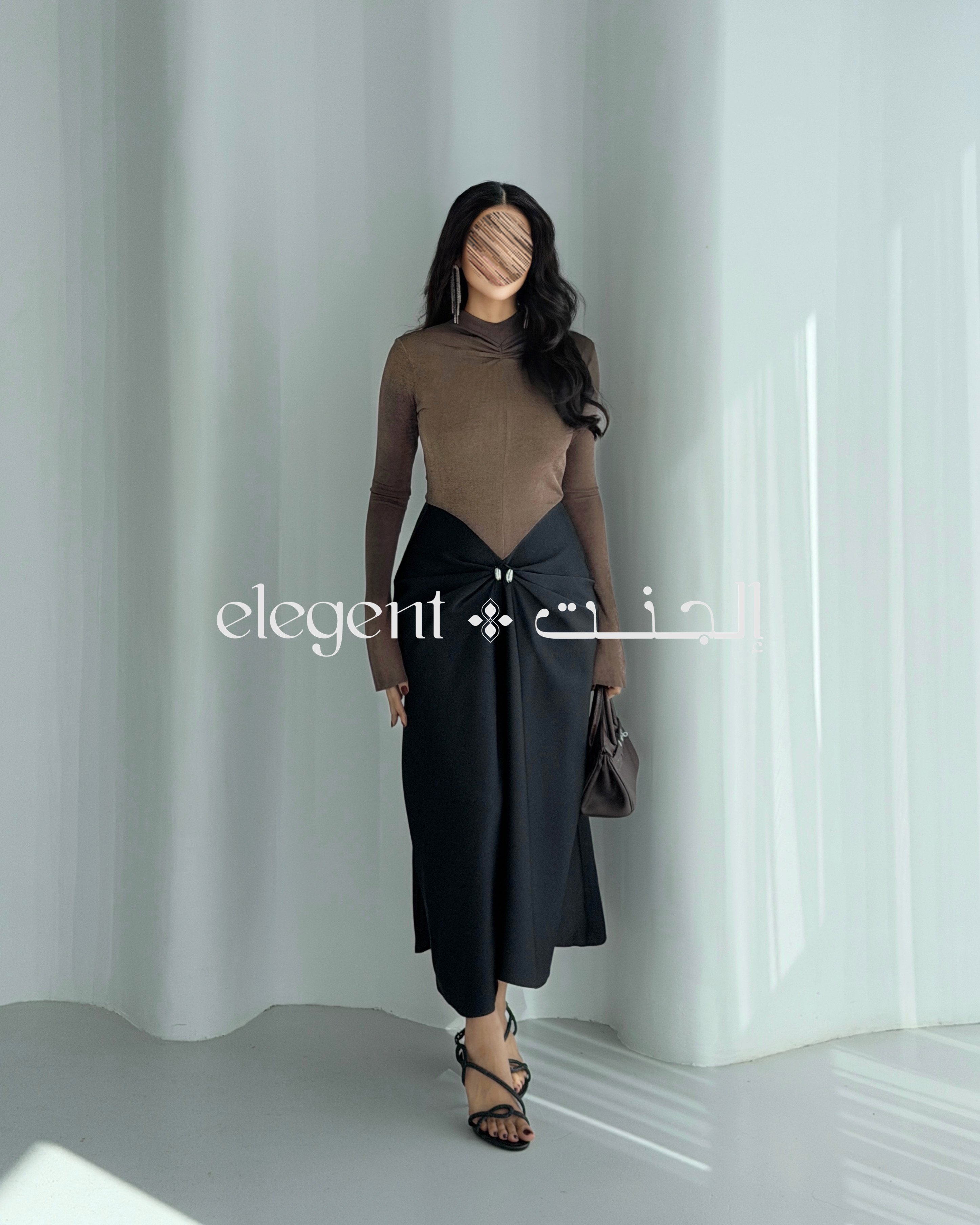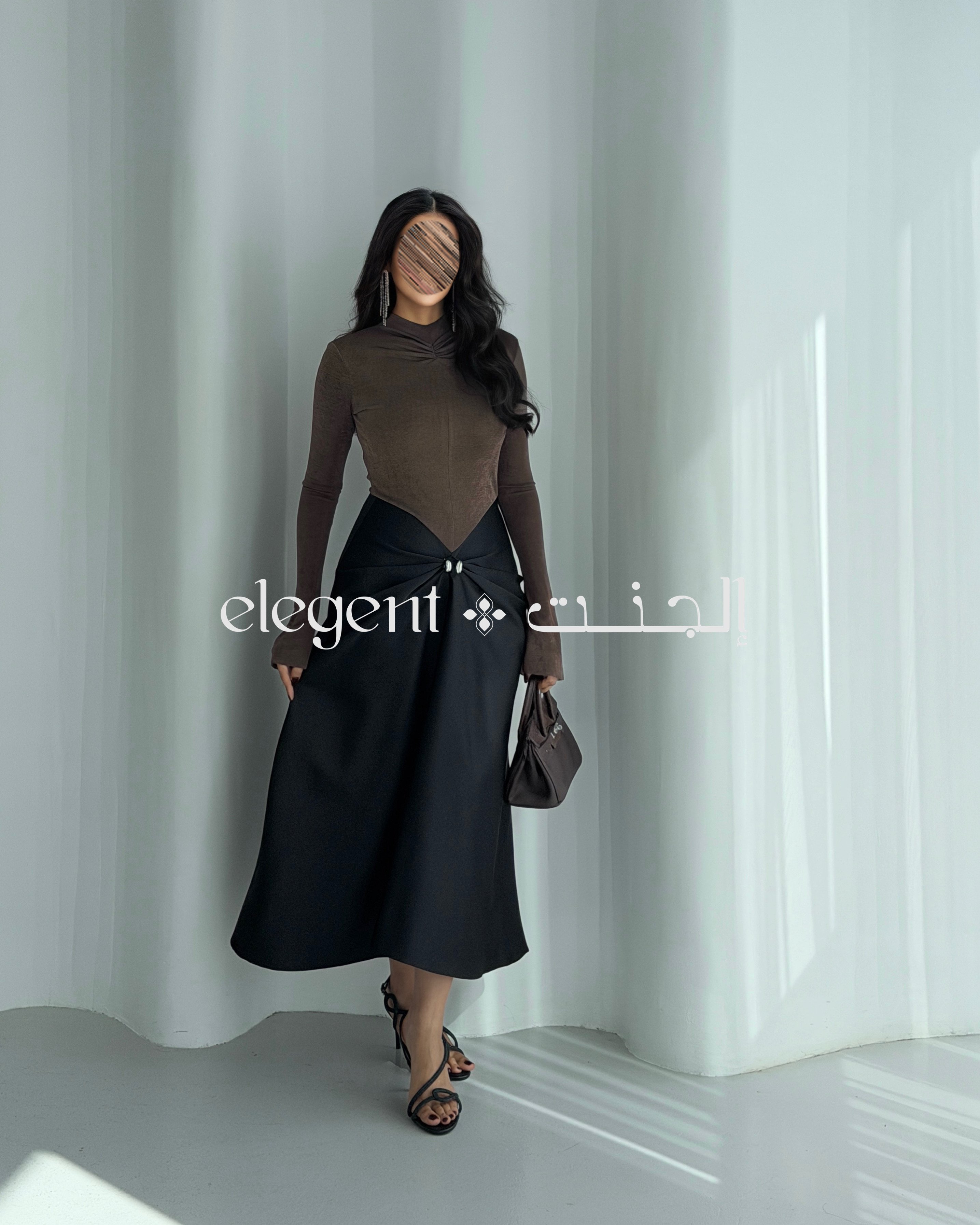 اختاري الفخامة مع فستان استرتش بني وميكادو أسود بتفصيلة لؤلؤية. يتميز هذا الفستان بتصميمه الفريد الذي يجمع بين الخامة العصرية واللمسات الراقية، مما يجعله الخيار المثالي لسهراتك الخاصة.