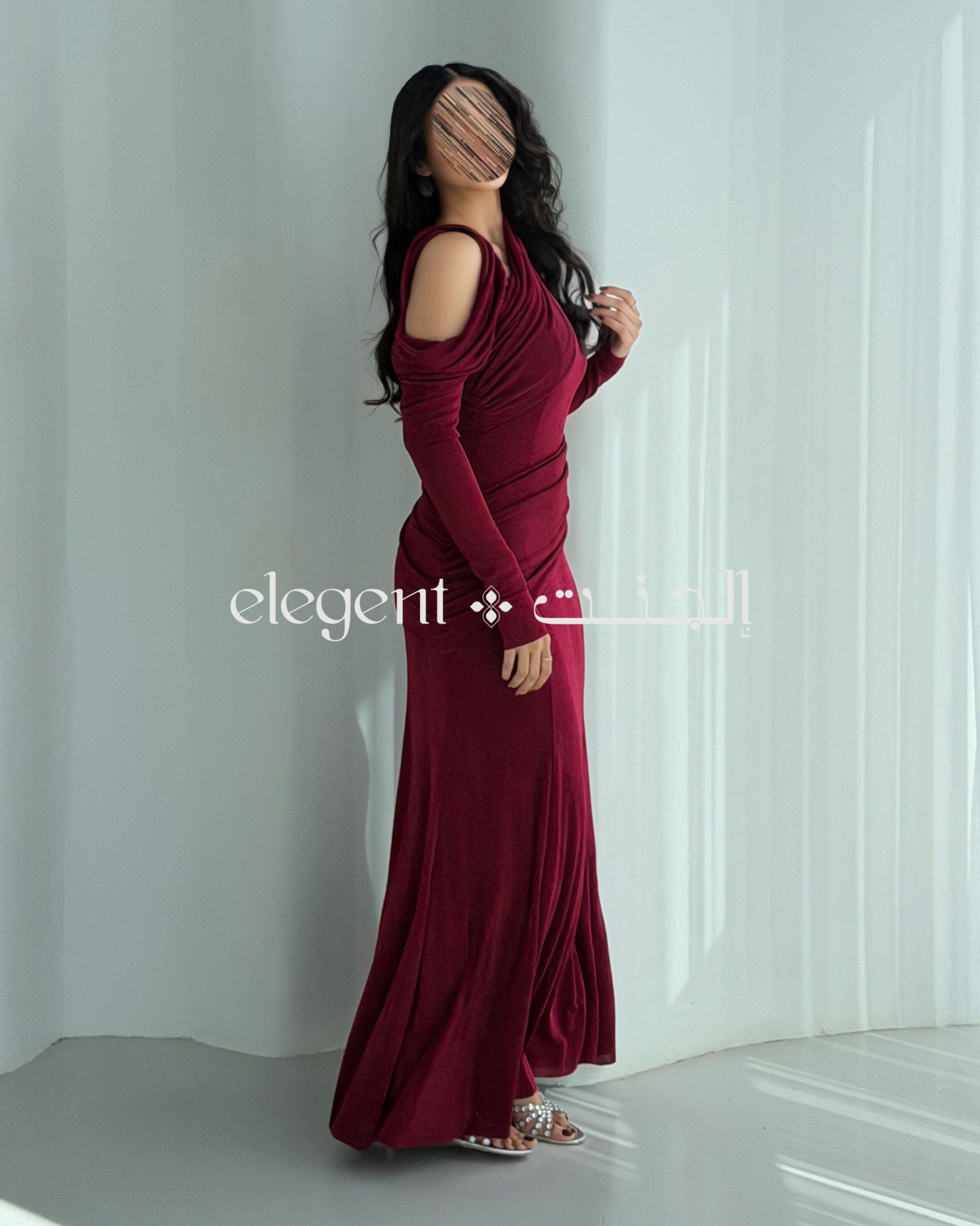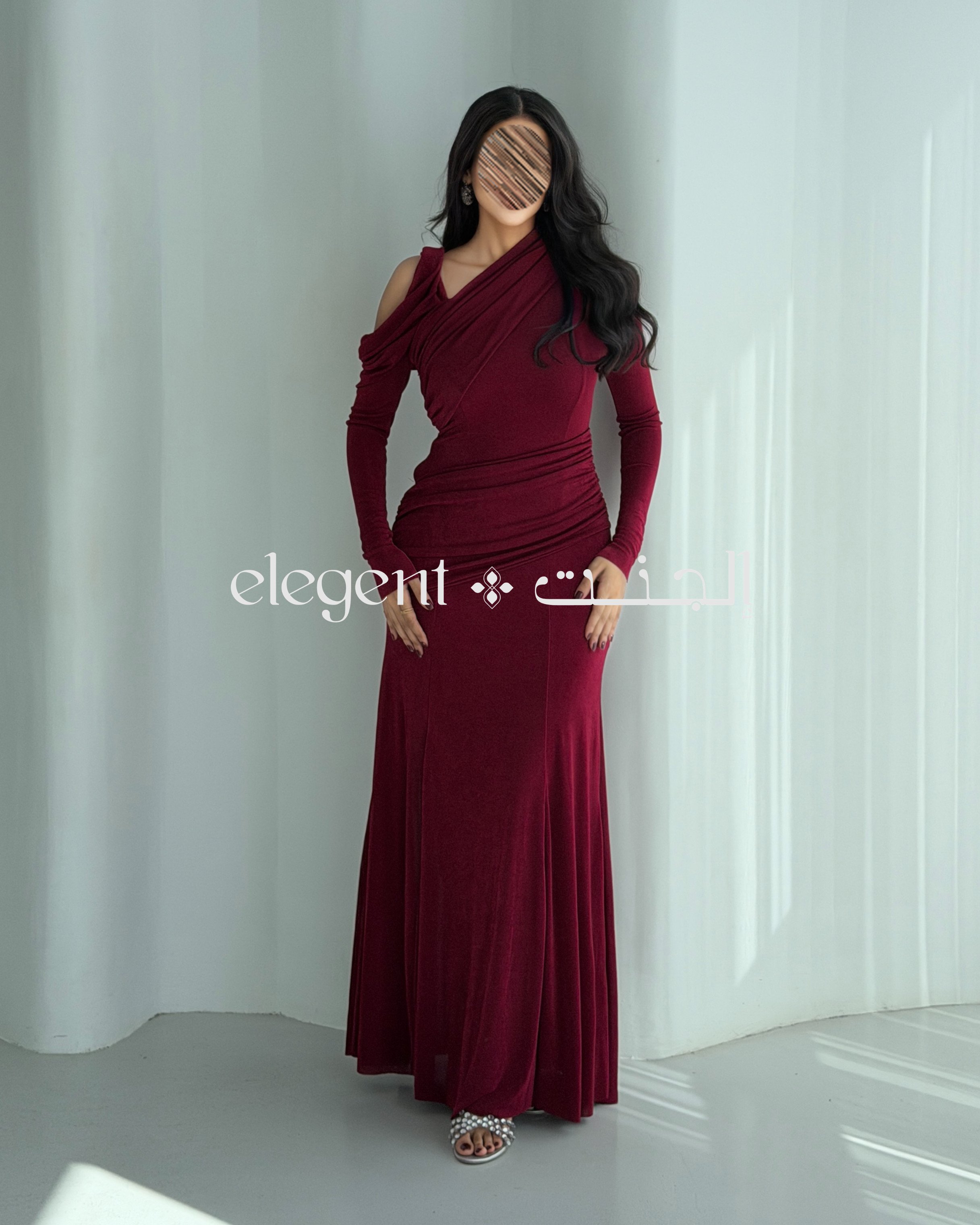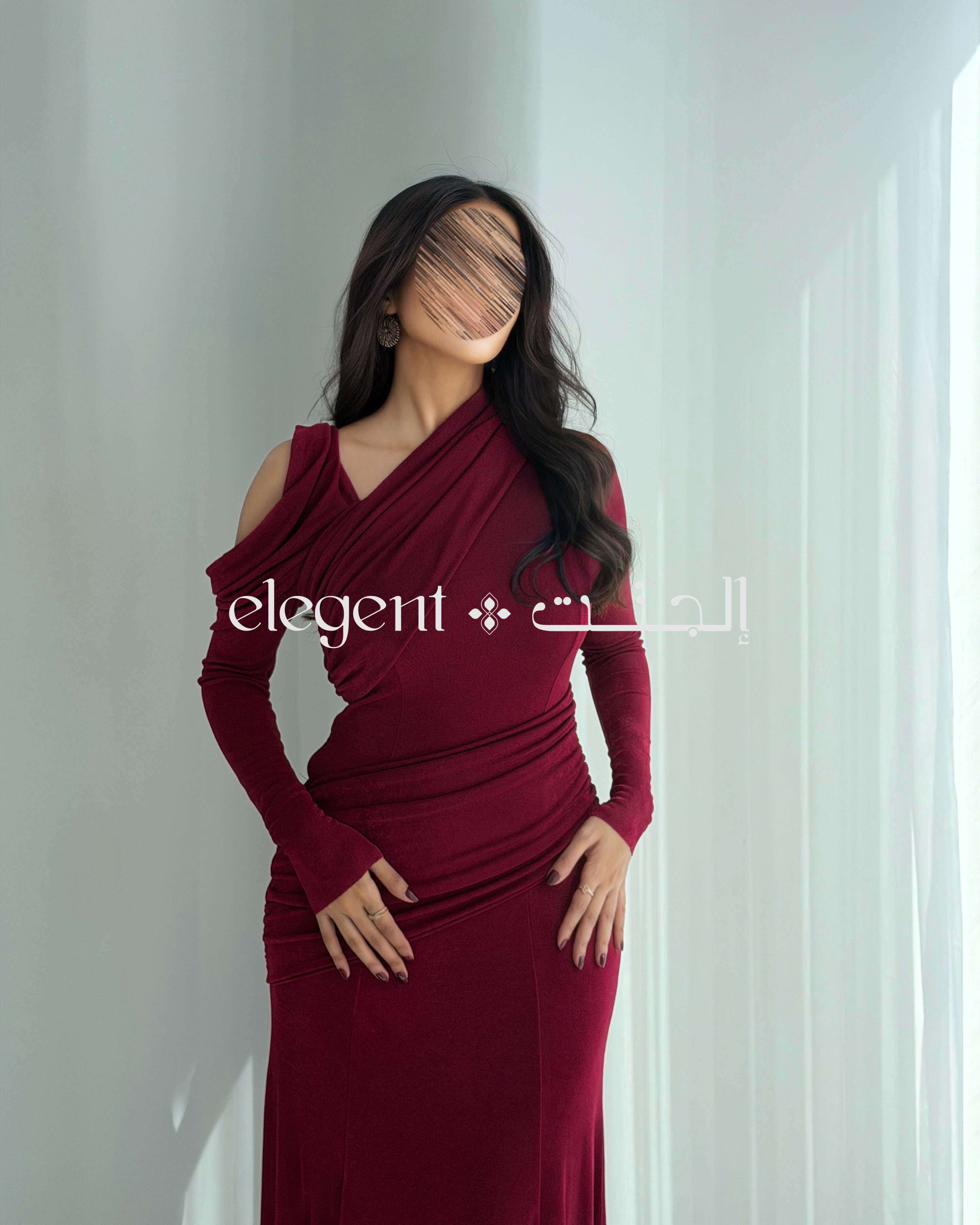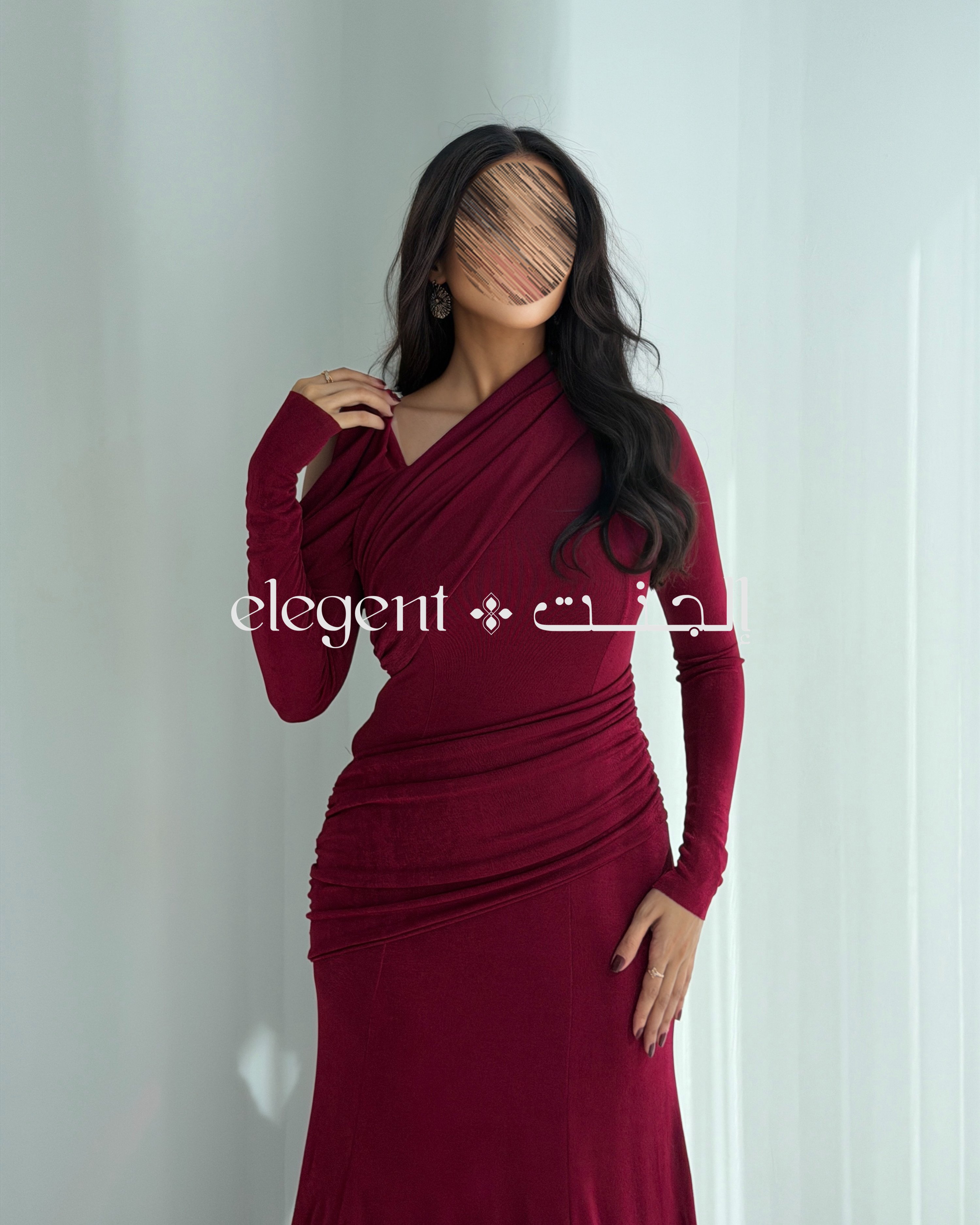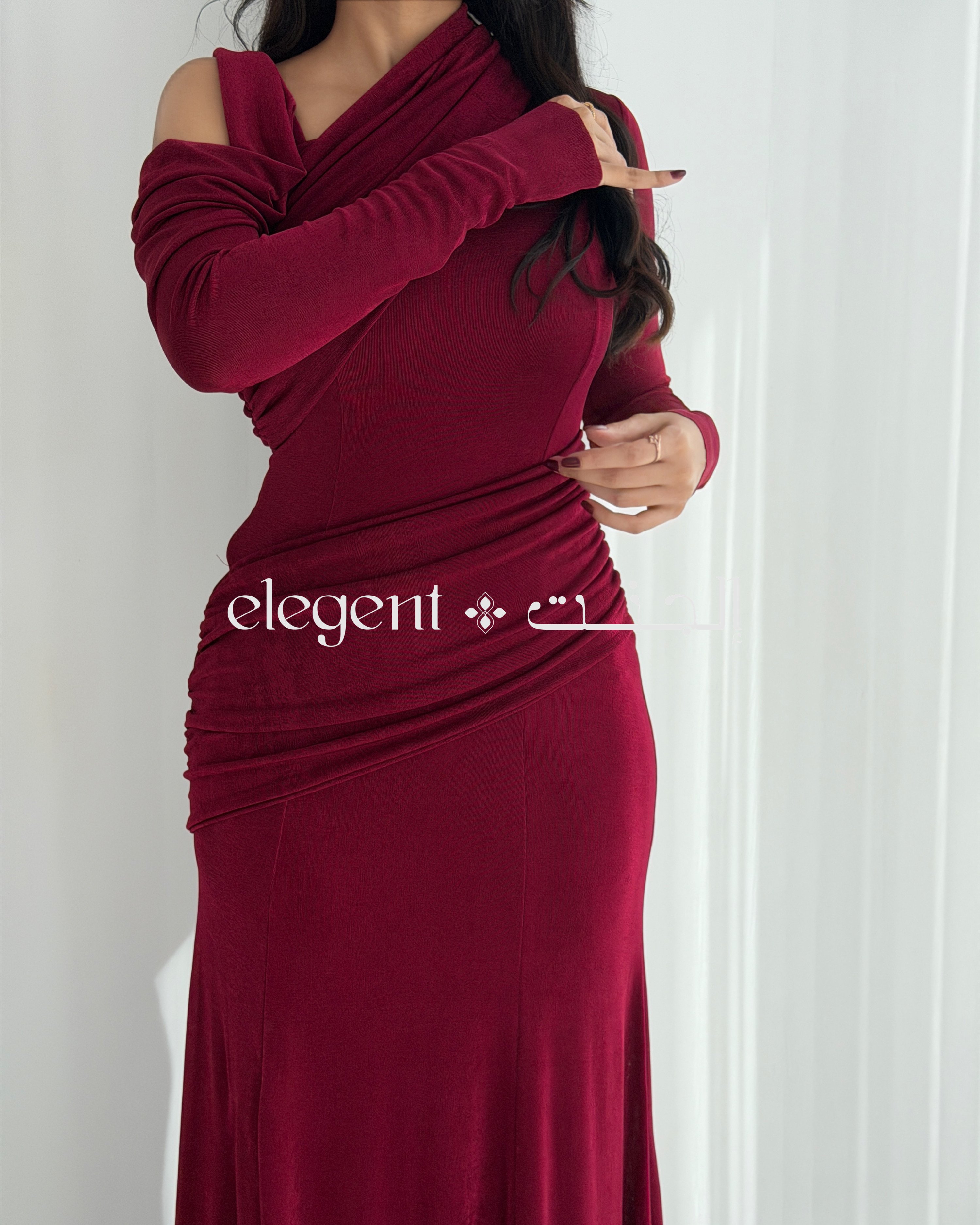 الفستان يأتي بلون برغندي عميق، يضفي لمسة من الأناقة والجاذبية. تصميم الكتف الساقط يمنحك إطلالة عصرية، بينما الأكمام الطويلة تضيف لمسة من الرقي. كما أن القصّة الضيقة مع الدرامية الناعمة تعزز جمال القوام وتبرز أنوثتك.