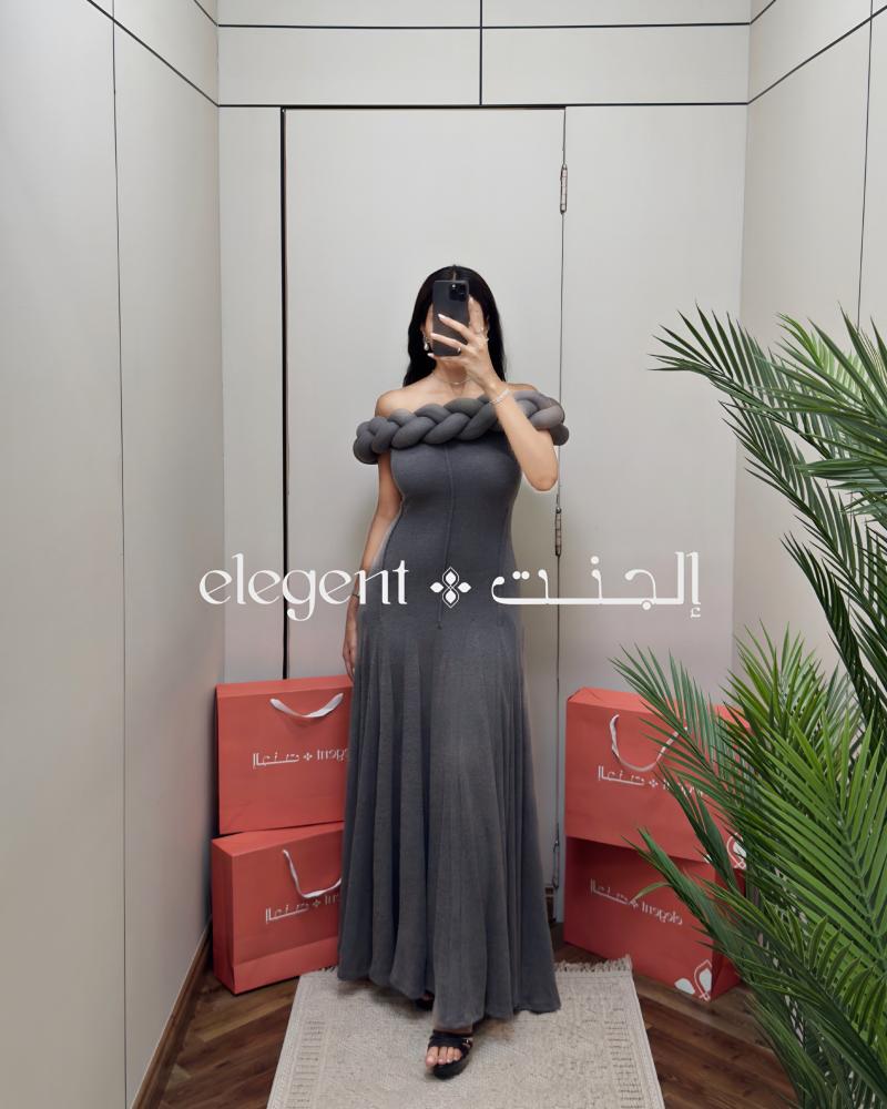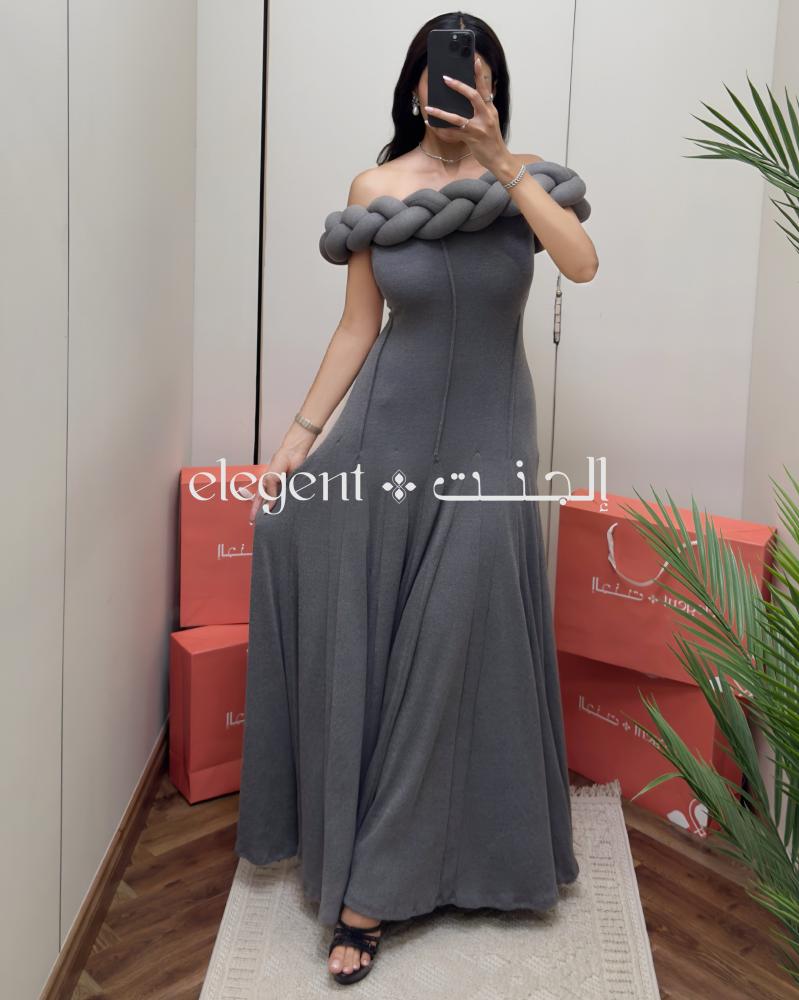 فستان سهرة رمادي أوف شولدر بتفاصيل مضفًرة أنيقة
