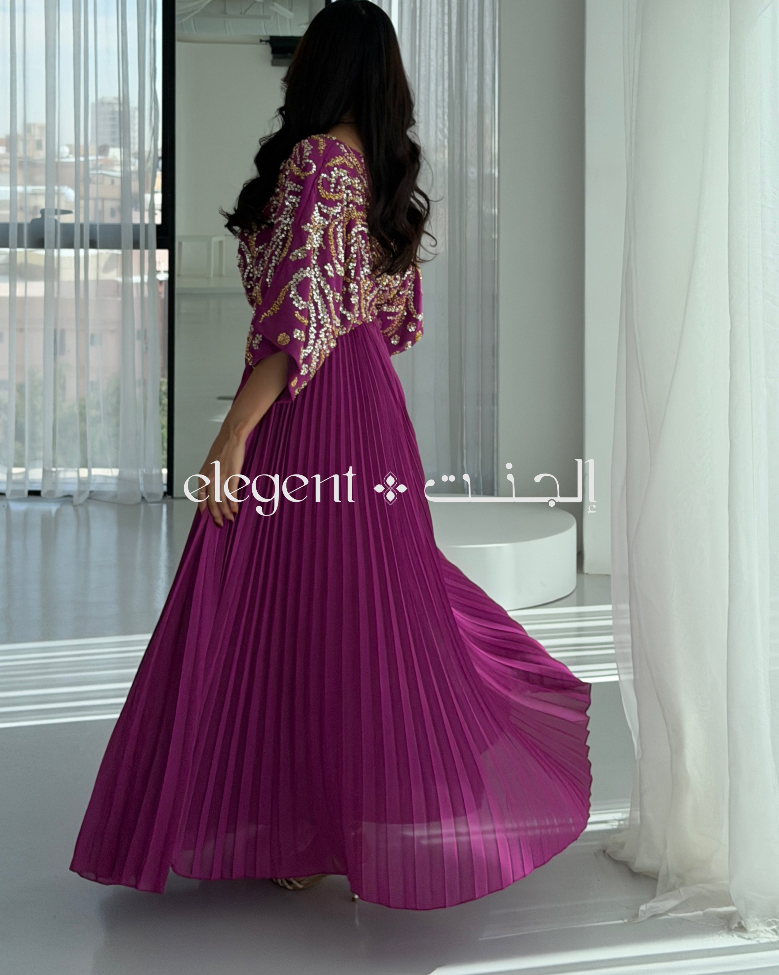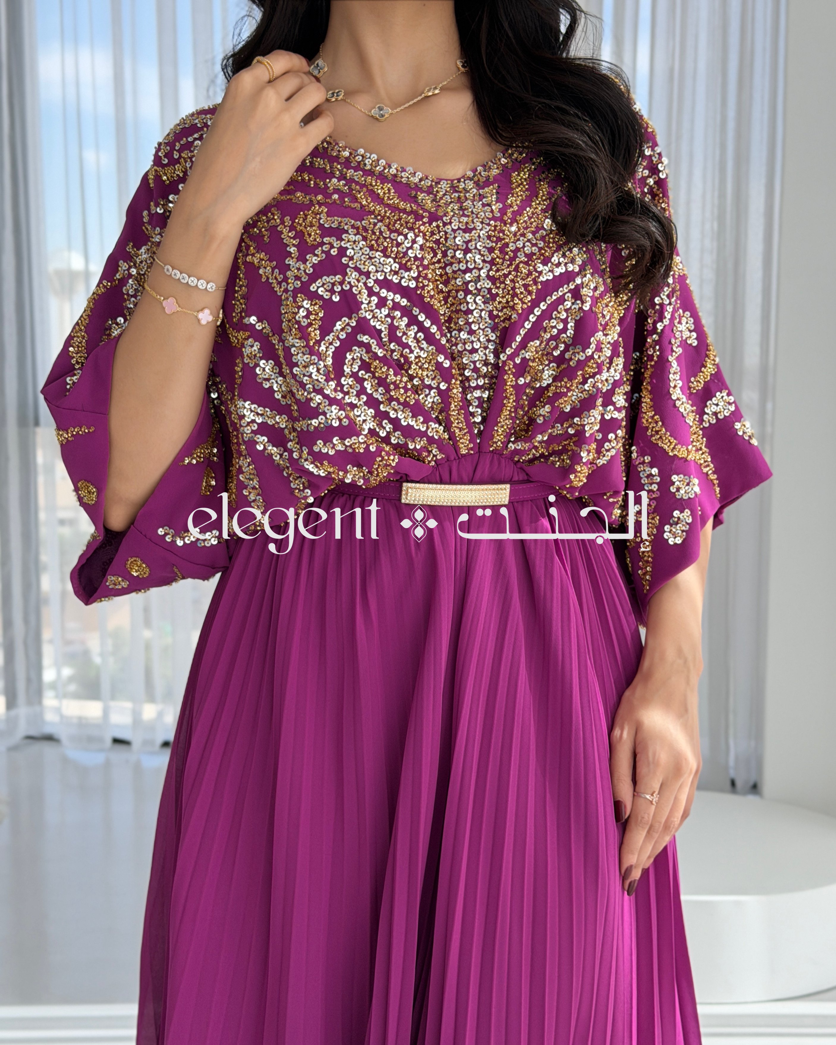 استمتعي بإطلالة ساحرة مع فستان سهرة فوشي بتطريز ذهبي لامع وقصة مكسرة. هذا الفستان الأنيق يتميز بلون فوشي ملكي يلفت الأنظار، مع تطريز ذهبي يغطي منطقة الصدر والأكمام، مما يضيف لمسة فخمة وبارزة. تصميمه الفريد يجمع بين الأناقة والراحة، حيث يأتي بقصة واسعة في الأعلى وأكمام مريحة، مما يجعله خيارًا مثاليًا لمناسباتك الخاصة.