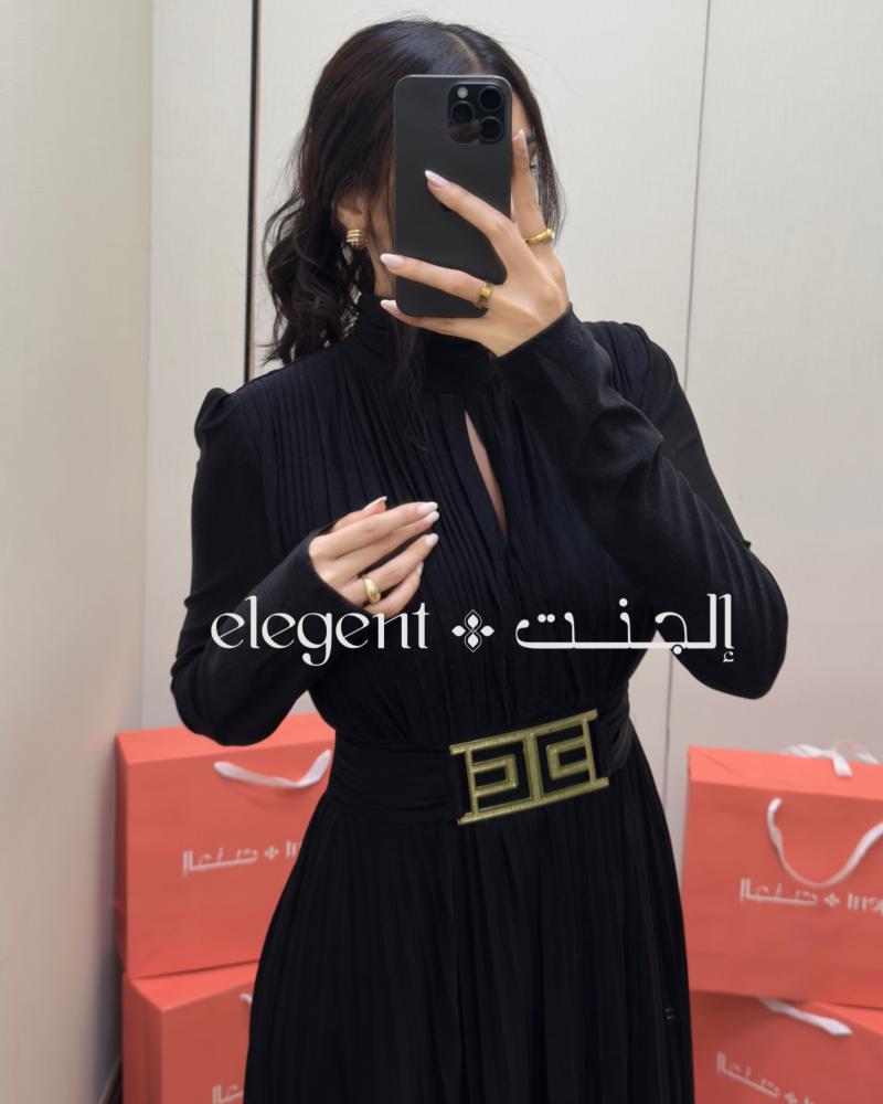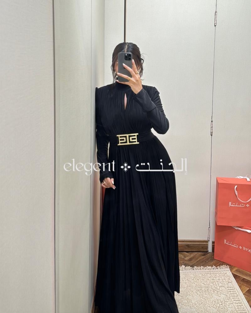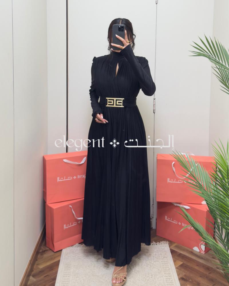 استعدّي لإطلالة ساحرة مع فستان أسود بليسيه بحزام ذهبي - تصميم أنيق للمناسبات. يتميز هذا الفستان بتفصيل بليسيه جذاب يمنحك حركة ورشاقة لا مثيل لها، مما يجعله خيارًا مثاليًا لكل مناسبة فاخرة. قصة الفستان المحتشمة برقبة عالية وفتحة أمامية رقيقة توازن بين الجاذبية والحياء، مما يجعلك تتألقين بثقة في كل مناسبة.