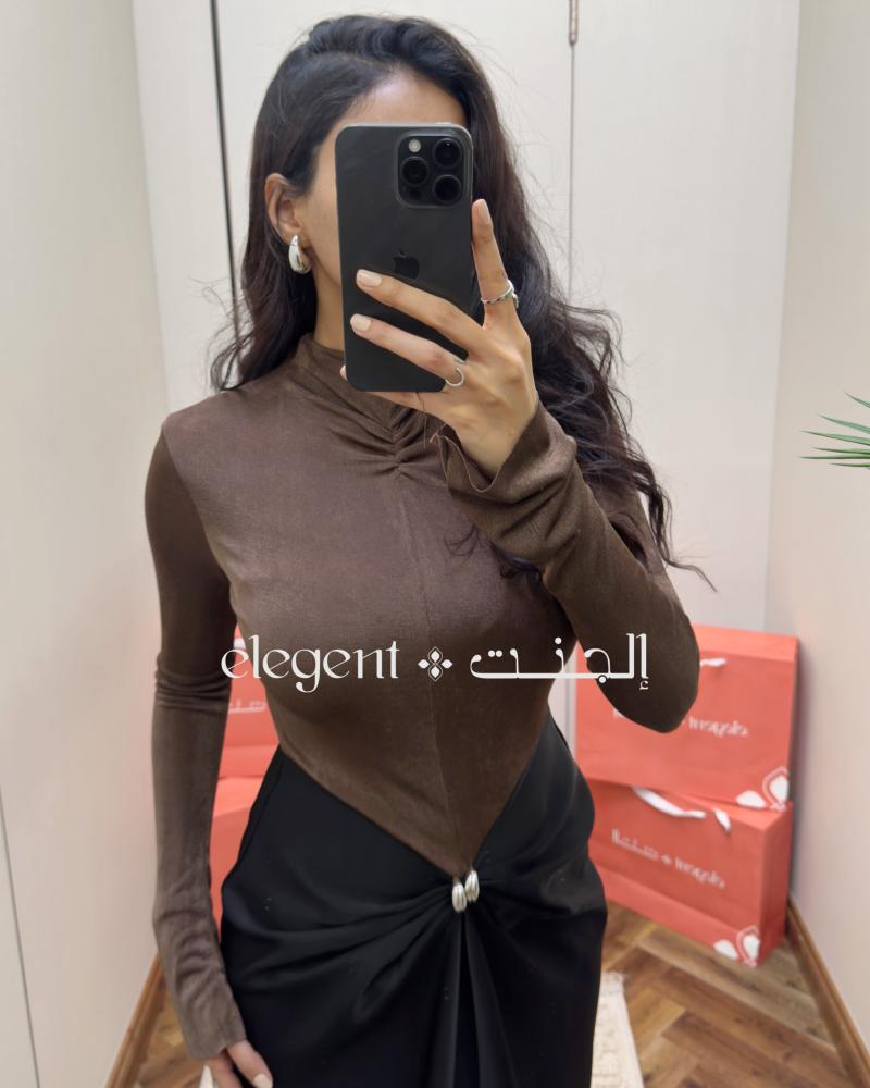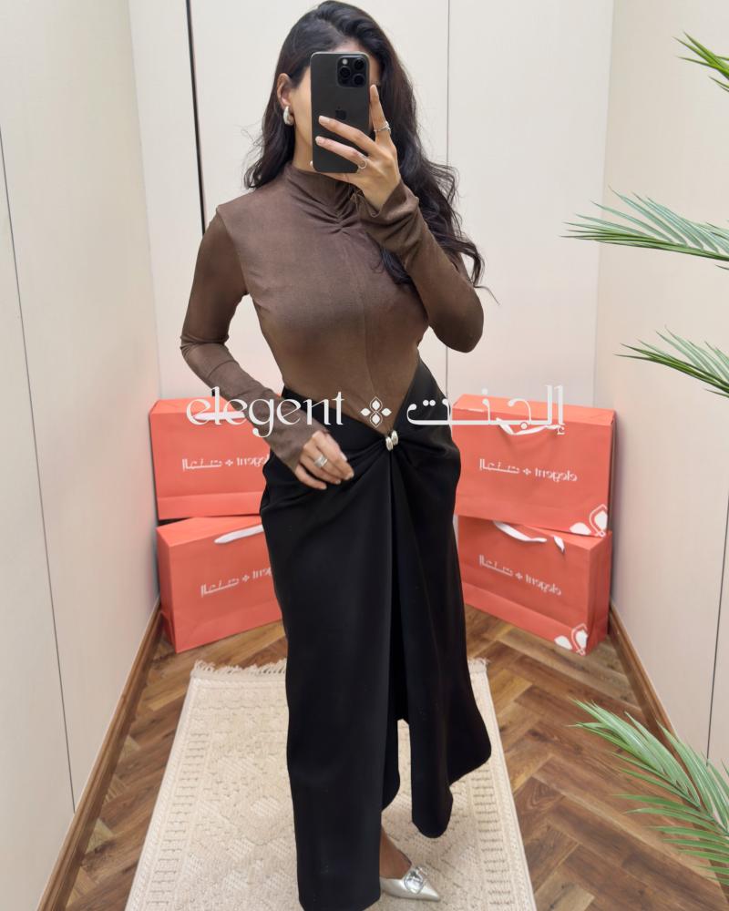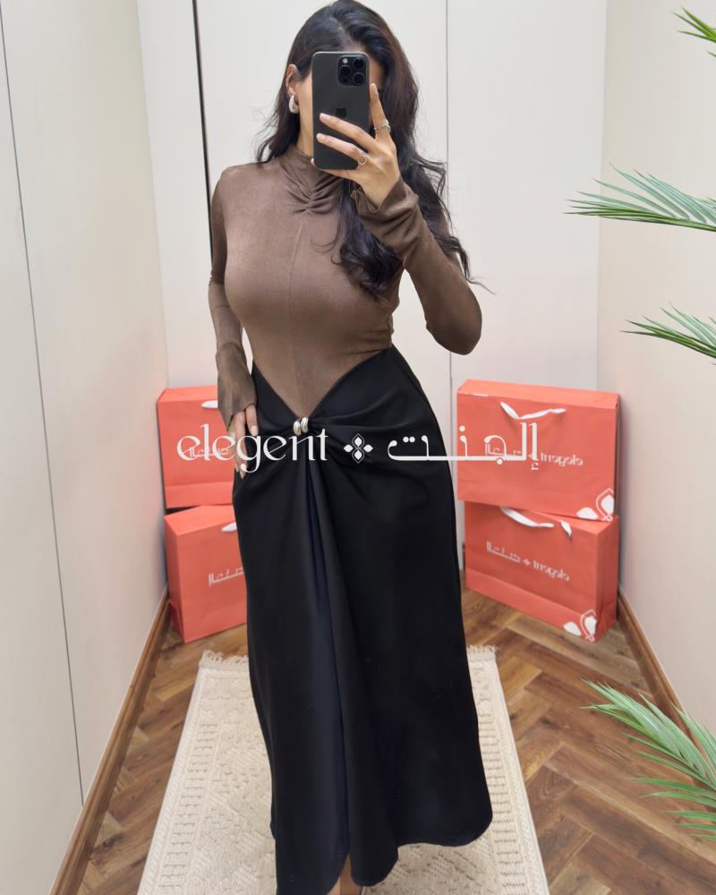 اختاري الفخامة مع فستان استرتش بني وميكادو أسود بتفصيلة لؤلؤية. يتميز هذا الفستان بتصميمه الفريد الذي يجمع بين الخامة العصرية واللمسات الراقية، مما يجعله الخيار المثالي لسهراتك الخاصة.
