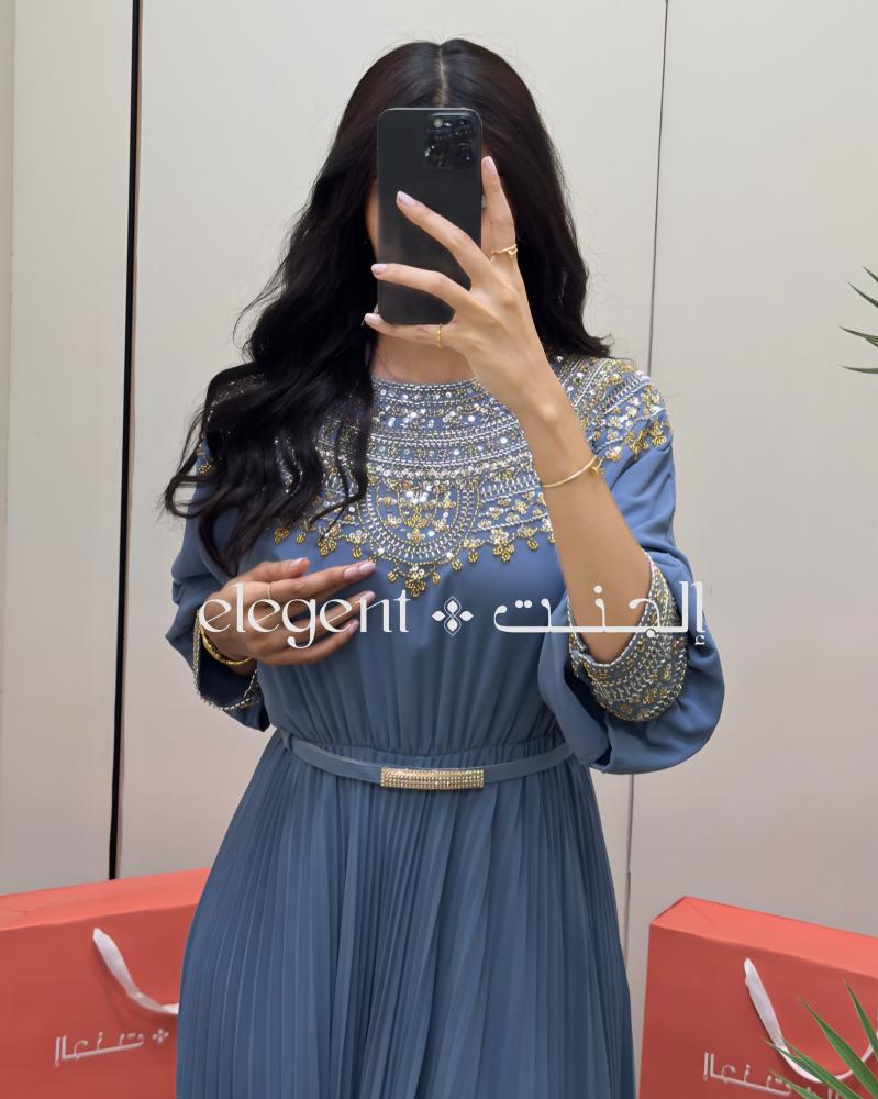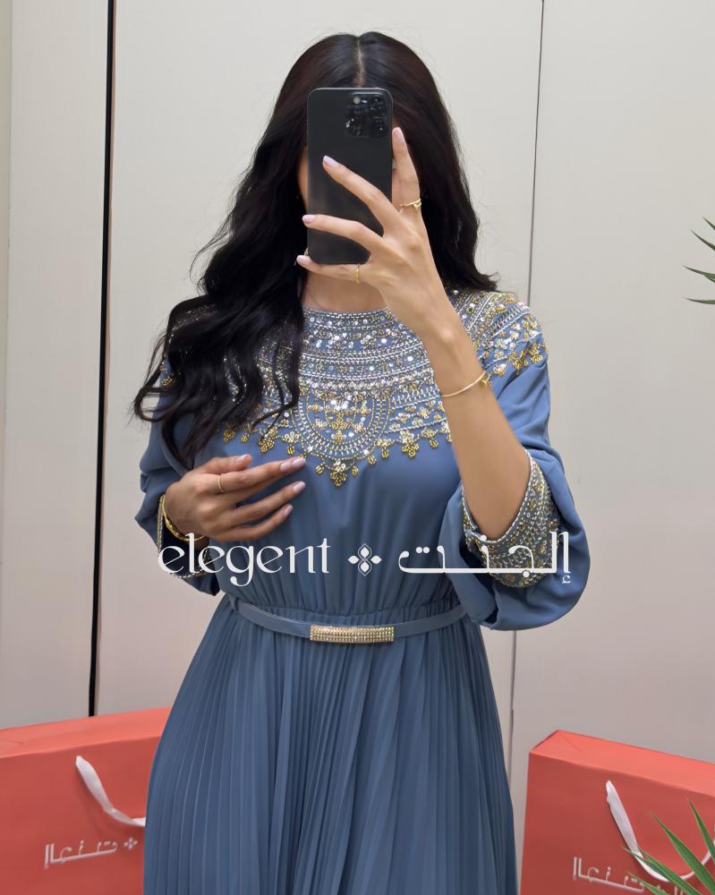 تألقي بإطلالة ملكية مع فستان أزرق ملكي دخاني شيفون مطرز – تصميم ملكي للمناسبات. يتميز هذا الفستان بلونه الأزرق الدخاني العميق الذي يضفي لمسة من الفخامة والرقي. صُنع من خامة الشيفون الفاخر، مما يمنحه ملمساً ناعماً ومريحاً على البشرة.