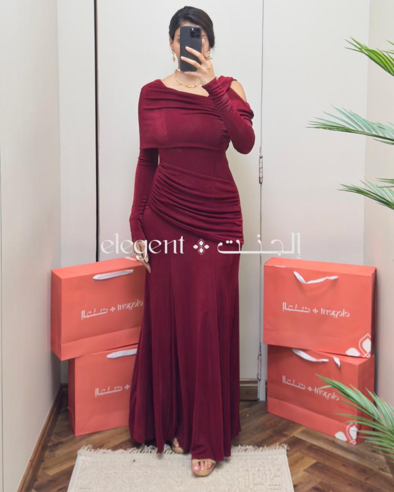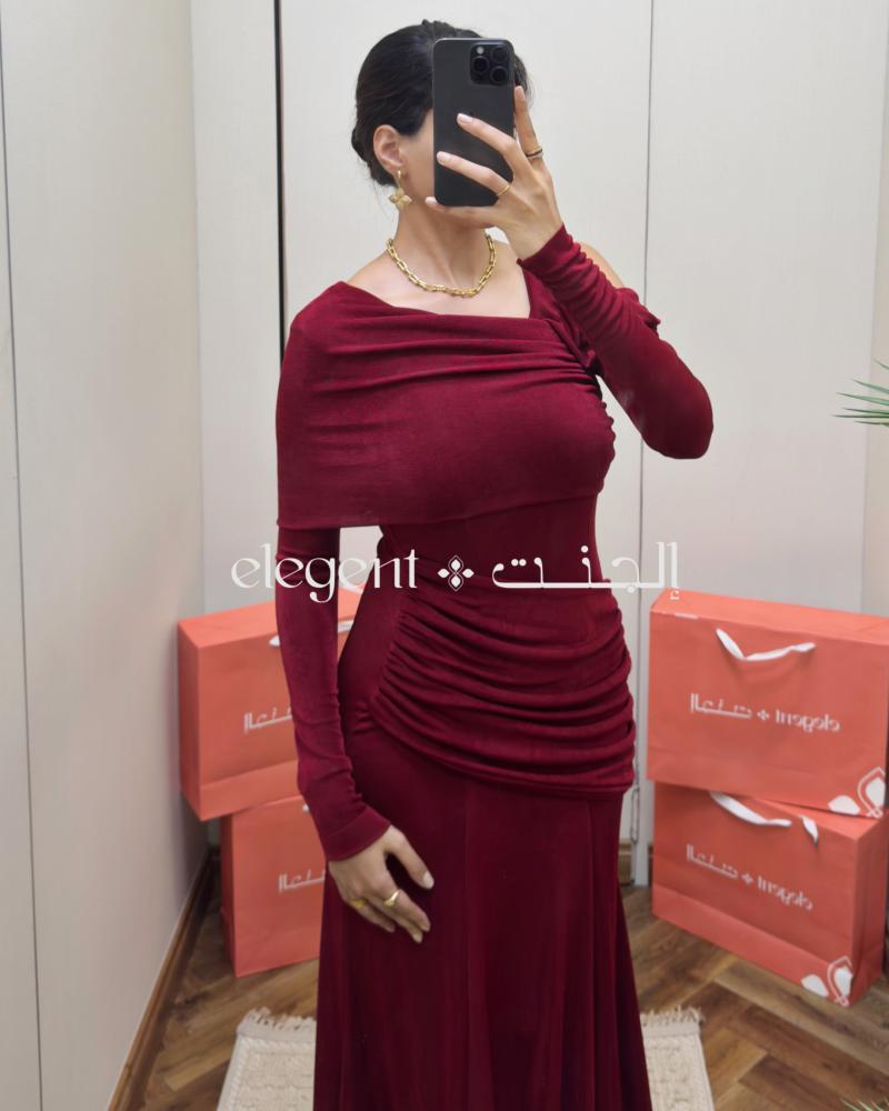 الفستان يأتي بلون برغندي عميق، يضفي لمسة من الأناقة والجاذبية. تصميم الكتف الساقط يمنحك إطلالة عصرية، بينما الأكمام الطويلة تضيف لمسة من الرقي. كما أن القصّة الضيقة مع الدرامية الناعمة تعزز جمال القوام وتبرز أنوثتك.
