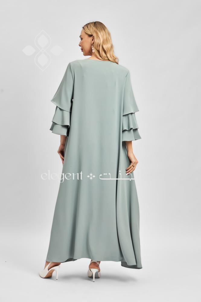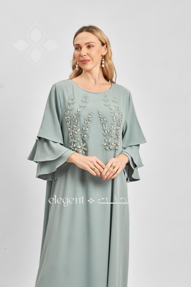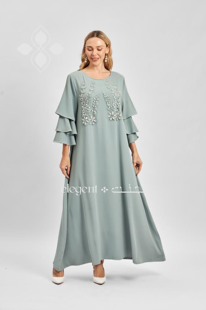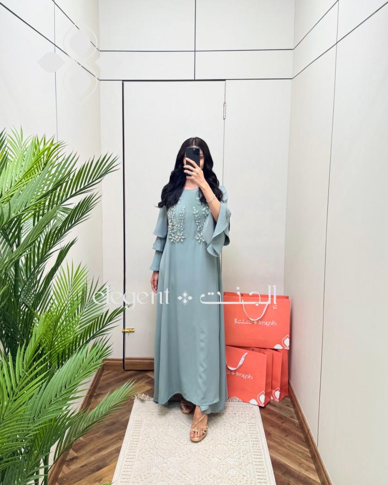 تتميز الجلابية بتطريز ناعم في منطقة الصدر، مما يضفي لمسة فاخرة على التصميم ويجعلكِ تتألقين في كل مناسبة. الأكمام الكشكش تضيف لمسة من الأنوثة والتميز، مما يجعلها خيارًا مثاليًا للسهرات والمناسبات الخاصة.
