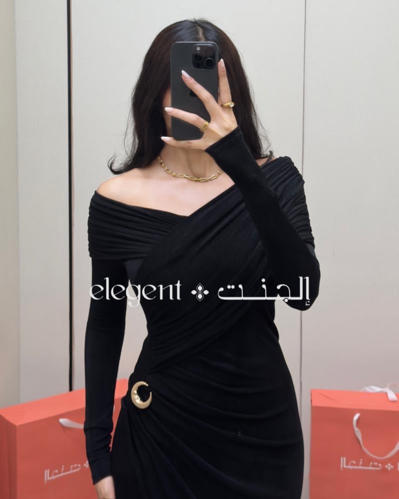 ارتدي الجاذبية بكامل تفاصيلها مع فستان سهرة اسود طويل مزموم بكتف مكشوف وتفصيلة بروش ذهبي. يتميز هذا الفستان بقصته الأنيقة التي تبرز أنوثتك بلمسة راقية، حيث يأتي بتصميم مزموم ينسدل بانسيابية على الجسم، مما يمنحك إطلالة ساحرة في كل مناسبة.