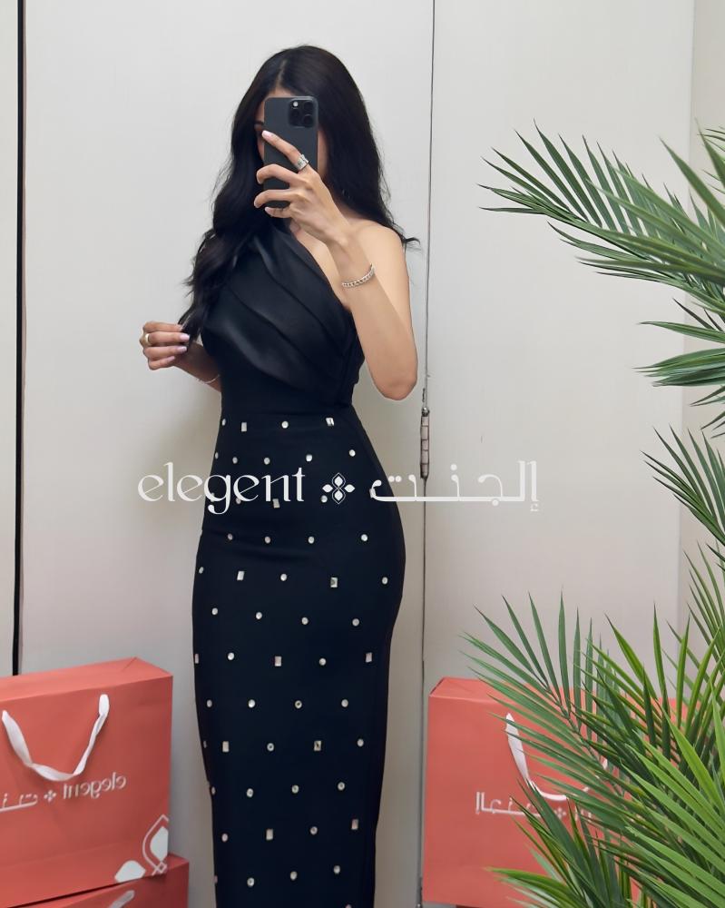 يتميز الفستان بلون أسود عميق، مع لمسات من الكريستال المتناثر بعناية، مما يضفي لمعة جذابة تضئ إطلالتك. القماش المستخدم هو نوع فخم قابل للتمدد، مما يضمن الراحة والتميز في كل حركة، بينما يمنحك التصميم العصري بكتف واحد مظهرًا أنيقًا وفريدًا.