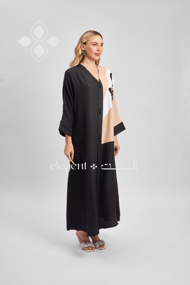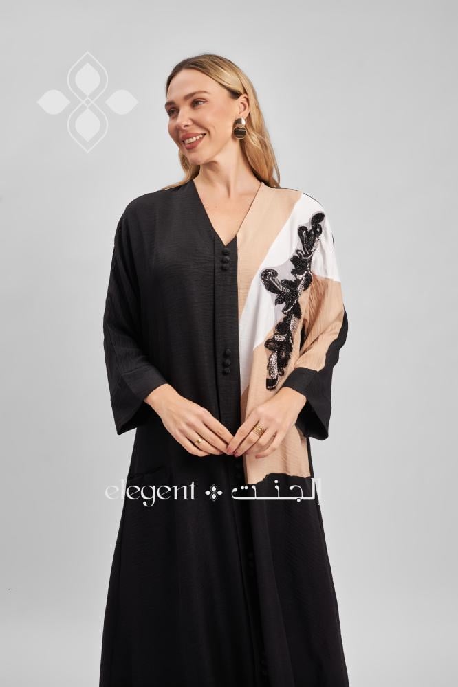 جلابية بتطريز أنيق، تصميم هندسي يجمع الأسود والبيج، مثالية للظهور المميز. تتميز هذه الجلابية بتصميم فريد يجمع بين الجرأة والنعومة، حيث يظهر التطريز الأسود البارز على الكتف ليضفي لمسة أنثوية راقية.