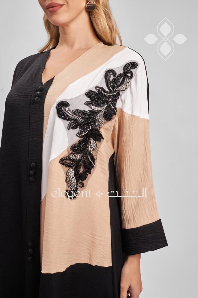 جلابية بتطريز هندسي أنيق بالأسود والبيج