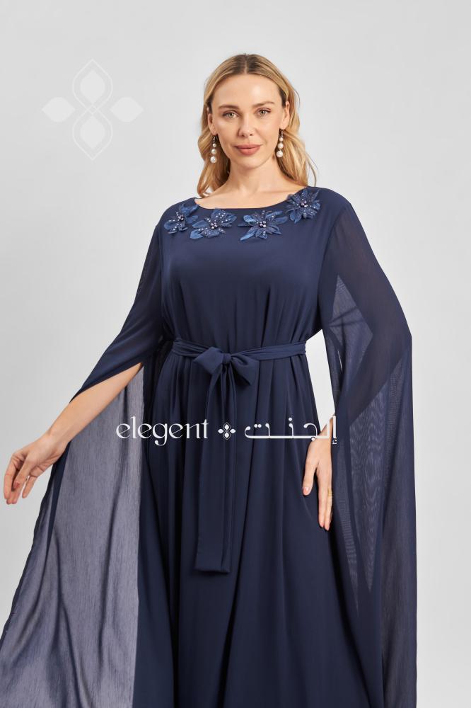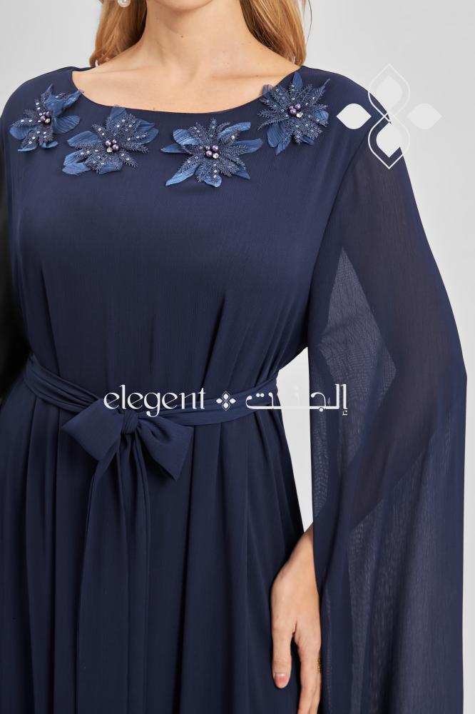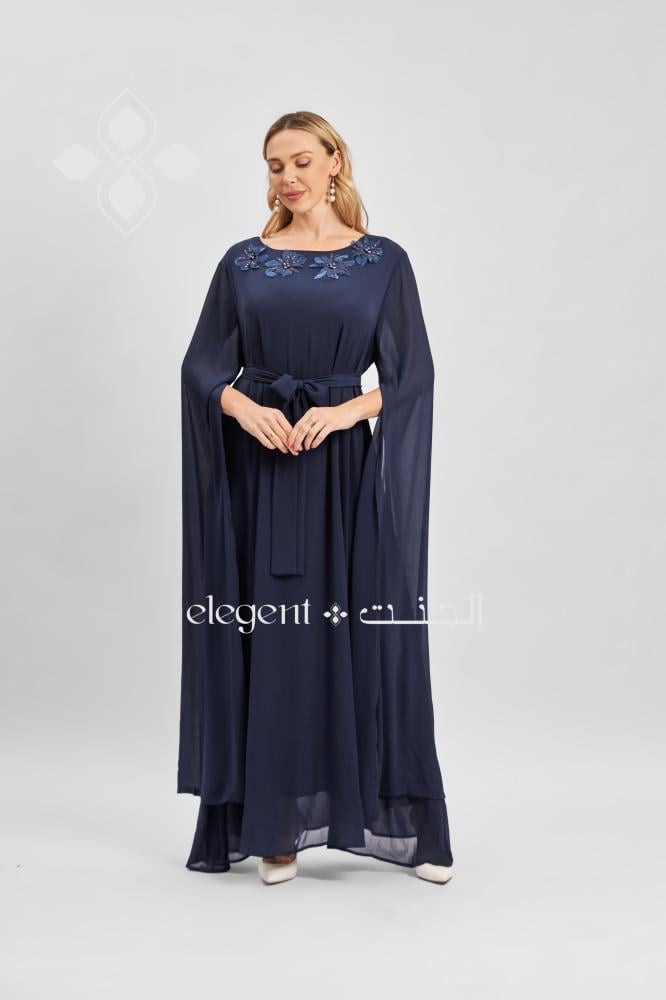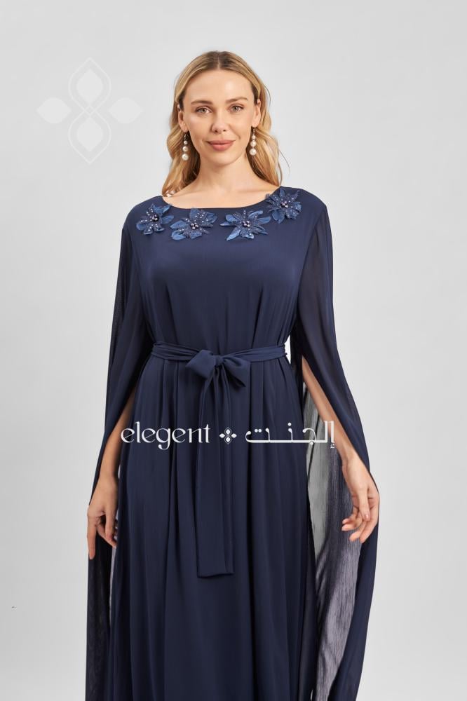 جلابية شيفون كحلي مطرزة بالزهور مع حزام خصر أنيق