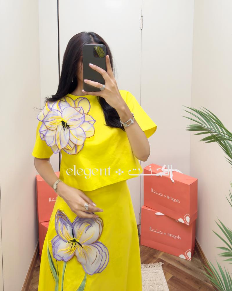 طقم مفعم بالحياة بتصميم زهري ثلاثي الأبعاد، يدمج بين بساطة القصّة وأناقة اللون الأصفر الزاهي. يتكوّن من بلوزة قصيرة بفتحة خلفية أنيقة، وتنورة بستايل ناعم وطويل مزينة بوردة أوركيد على الخصر، ليعكس لمسة جريئة وأنثوية بنفس الوقت. مثالي للمناسبات الصباحية والمسائية .