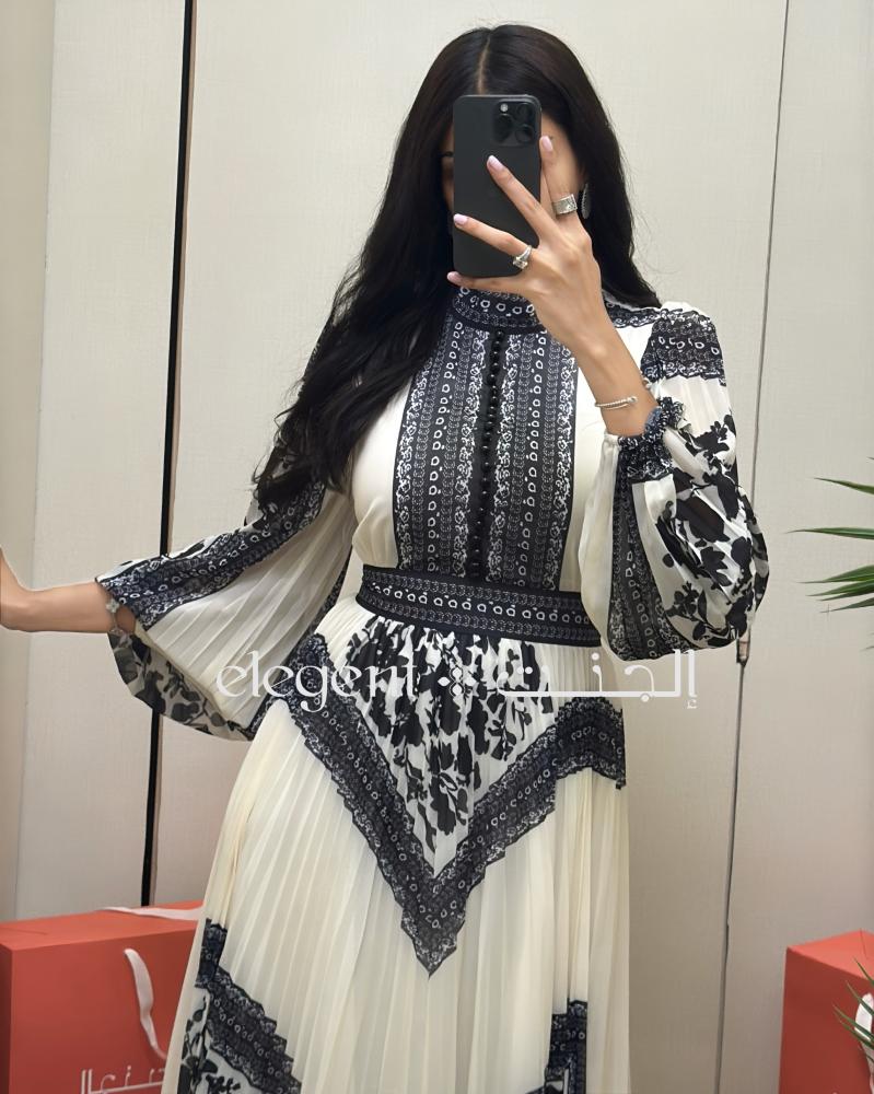 تألقي بإطلالة ملفتة مع هذا الفستان الأبيض الطويل المزين بنقشة سوداء فنية تضيف لمسة من الرقي والجاذبية. يتميز بتصميم محتشم بأكمام منفوخة وياقة مرتفعة، مع قصة واسعة مريحة وقماش شيفون مطوي يمنحك حركة انسيابية فاخرة. خيار مثالي للمناسبات النهارية أو الأمسيات الراقية