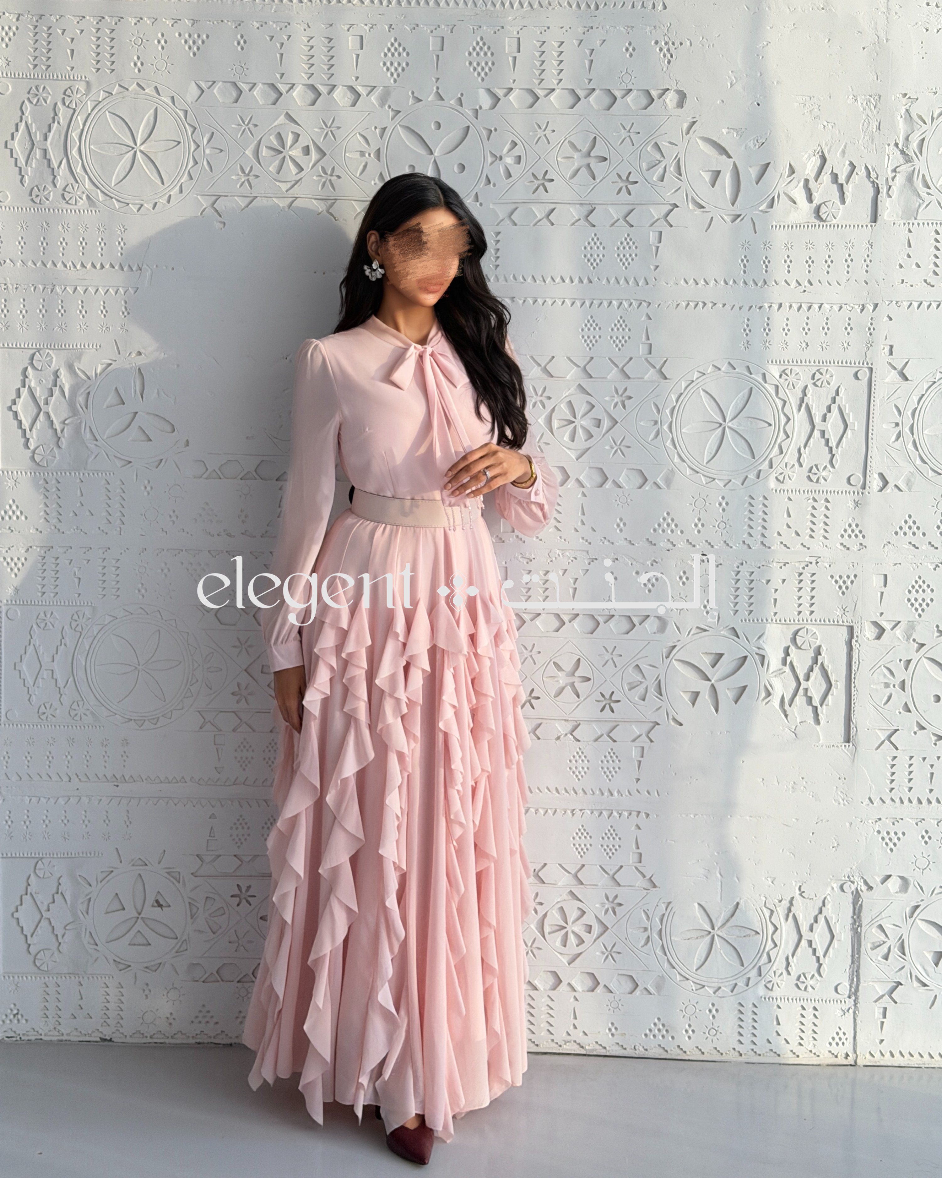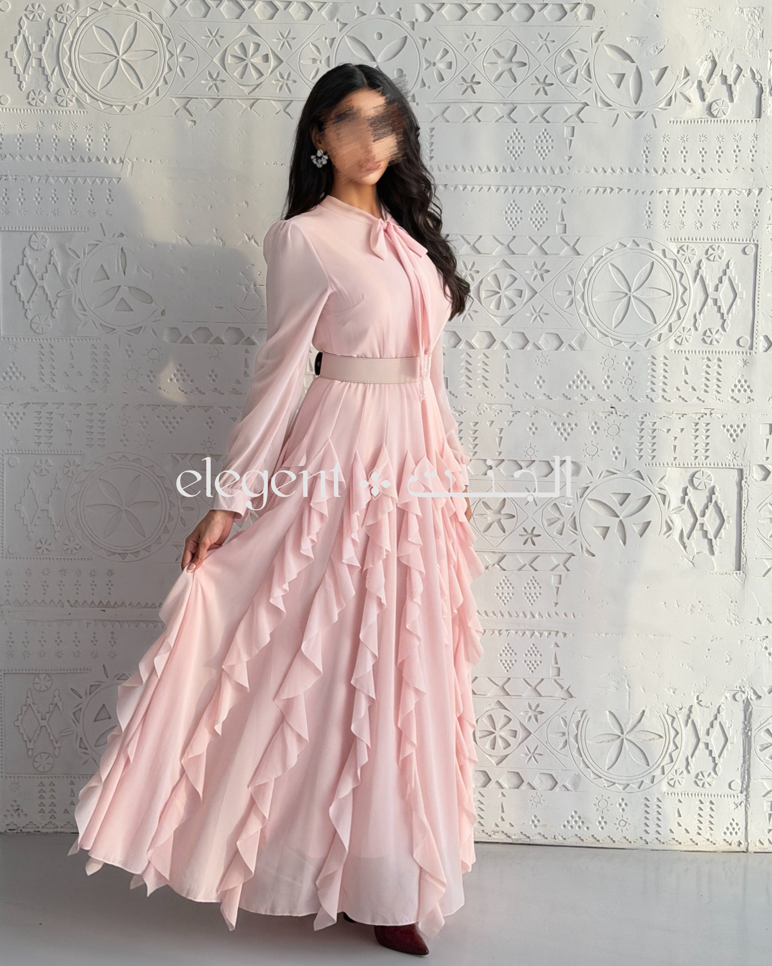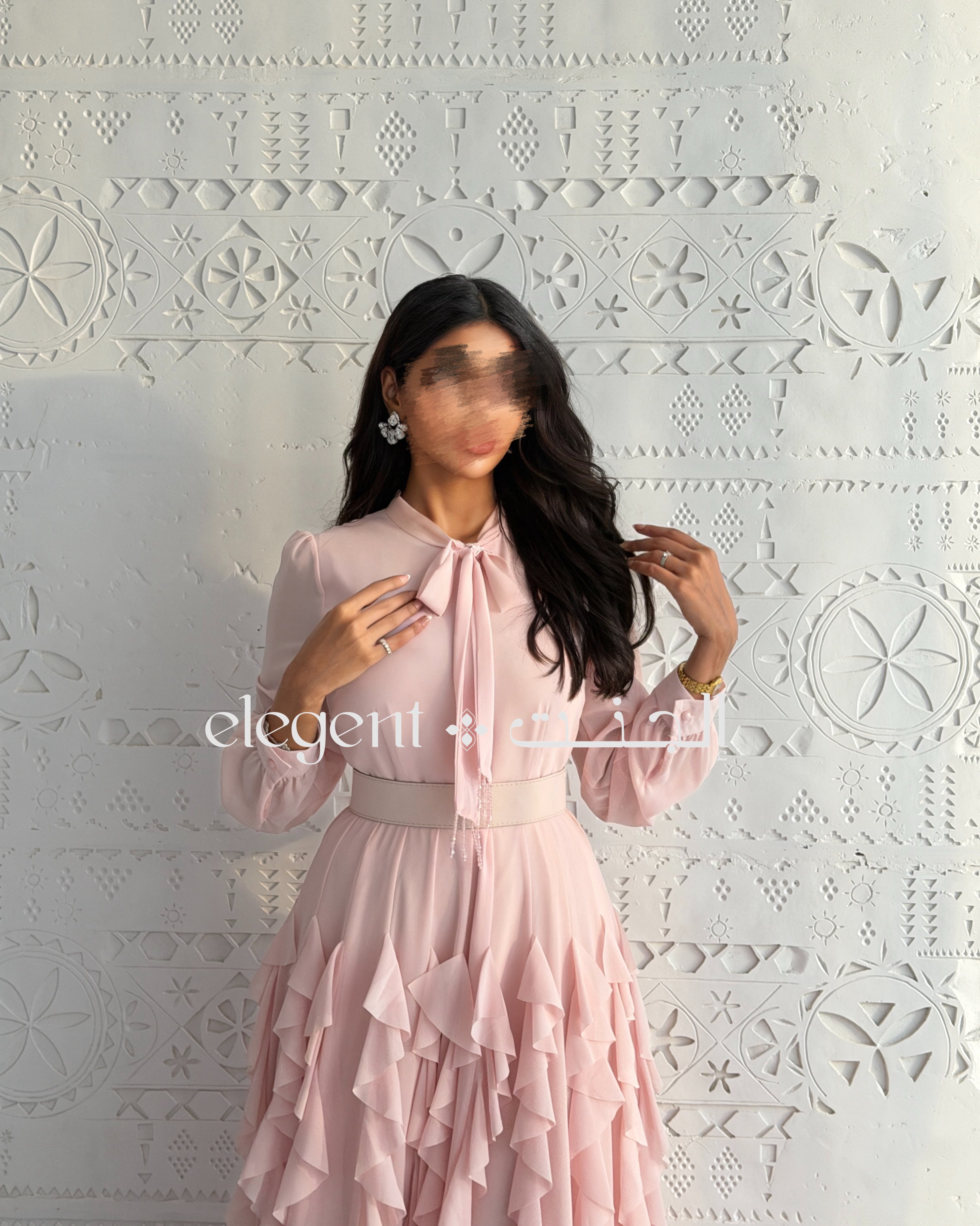 الطبقات الرفلية المتدرجة في التنورة تمنح حجماً أنثوياً جذاباً وحركة ساحرة، بينما يأتي معه حزام باللون نفسه لشد الخصر وإبراز جمال القوام بشكل أنيق دون مبالغة. اللون الوردي الهادئ يجعل الفستان مثالياً للمناسبات الراقية، حفلات الاستقبال، الخطوبات المنزلية، والتجمعات الفخمة التي تحتاج منك إطلالة ناعمة ومبهرة في آن واحد.