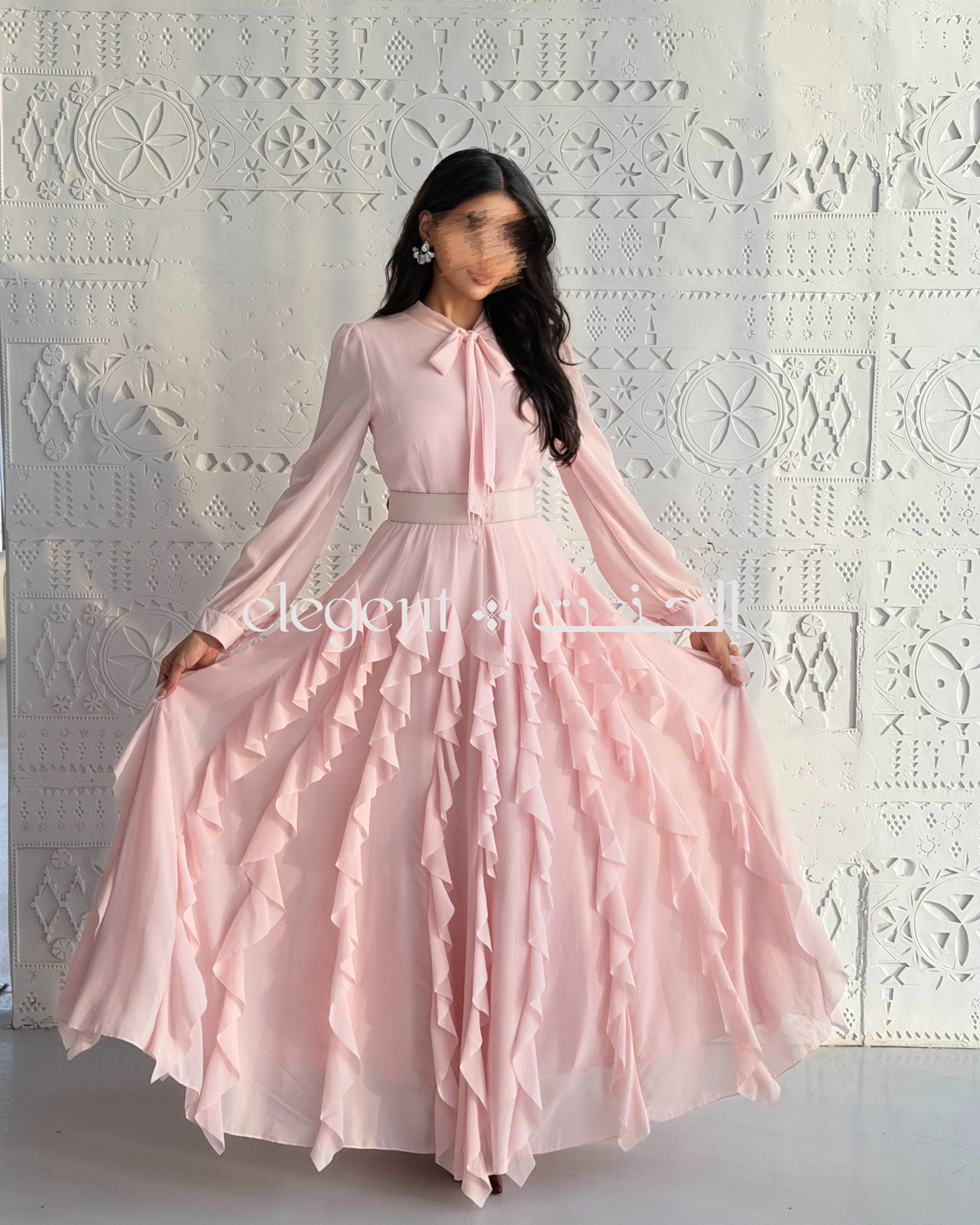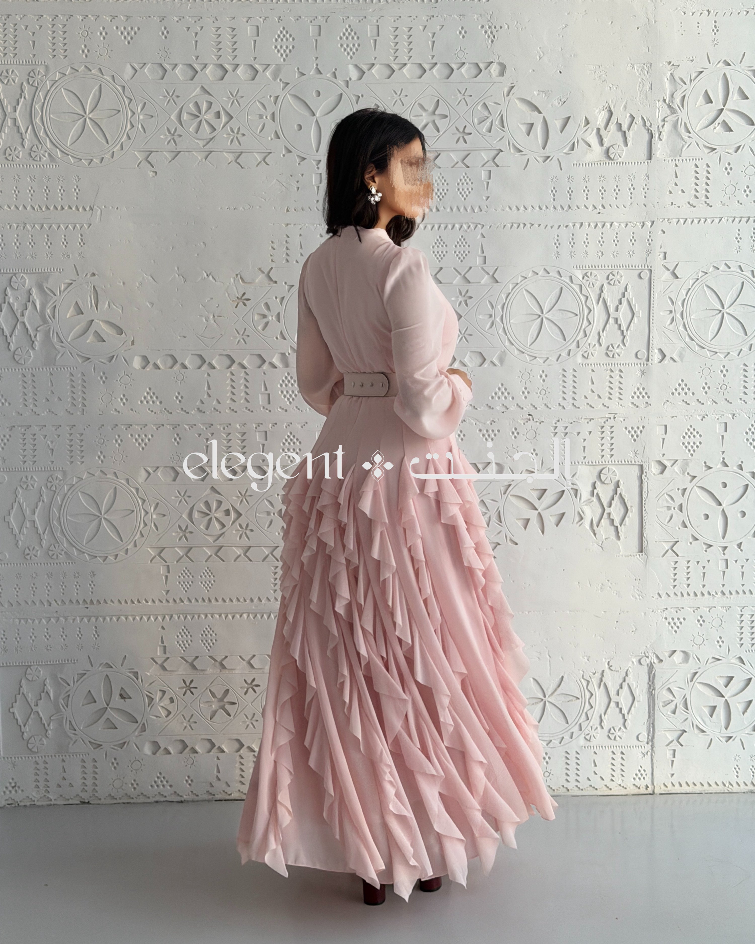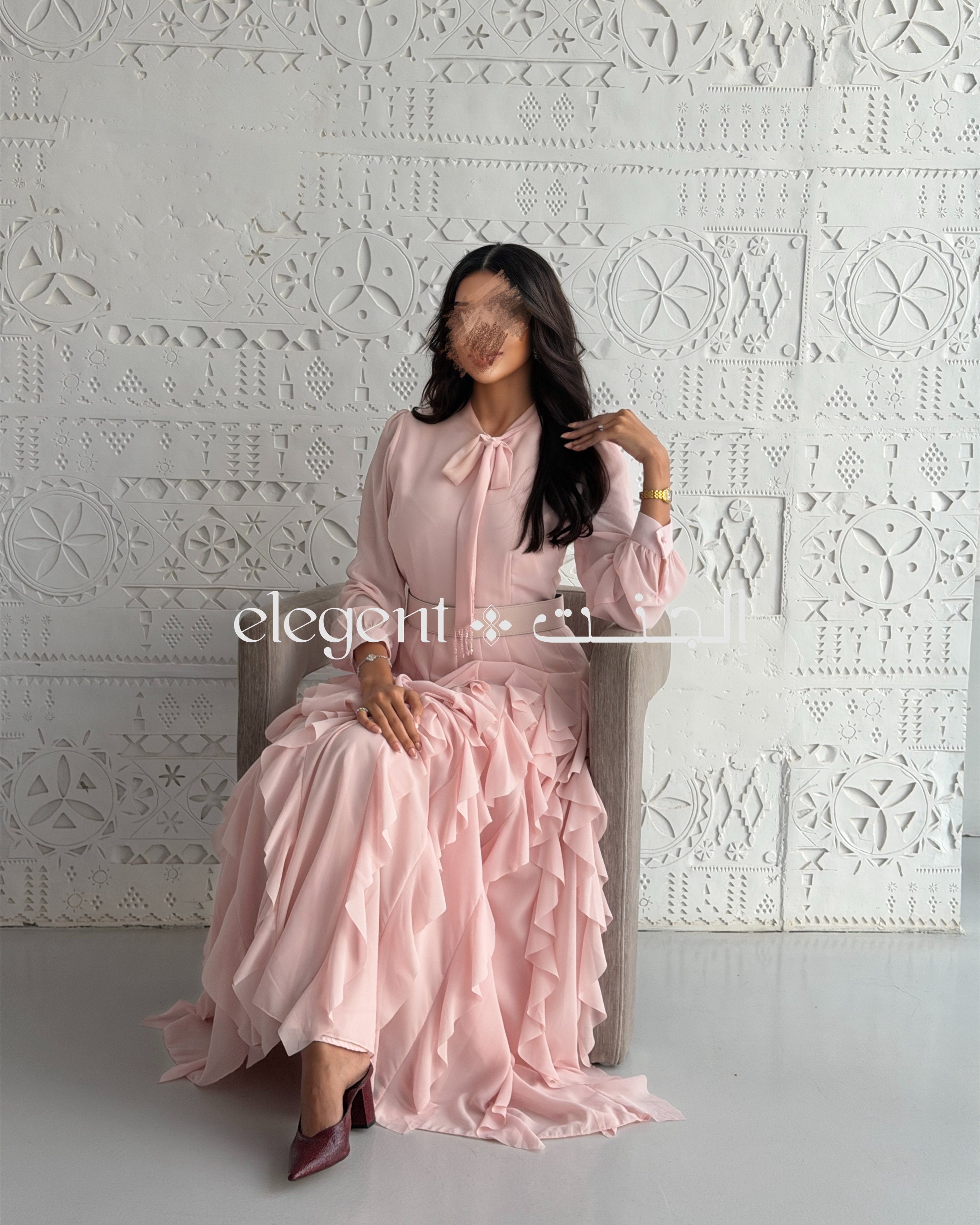 الطبقات الرفلية المتدرجة في التنورة تمنح حجماً أنثوياً جذاباً وحركة ساحرة، بينما يأتي معه حزام باللون نفسه لشد الخصر وإبراز جمال القوام بشكل أنيق دون مبالغة. اللون الوردي الهادئ يجعل الفستان مثالياً للمناسبات الراقية، حفلات الاستقبال، الخطوبات المنزلية، والتجمعات الفخمة التي تحتاج منك إطلالة ناعمة ومبهرة في آن واحد.