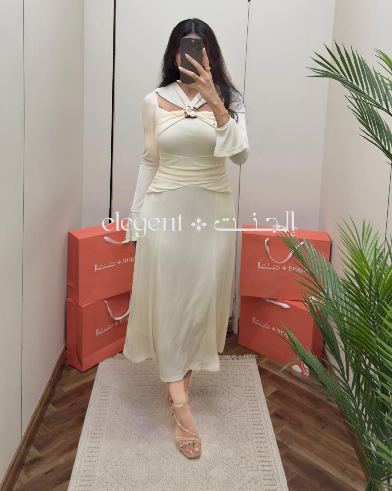 فستان بيج فاتح استرتش بتصميم أنثوي وعصري