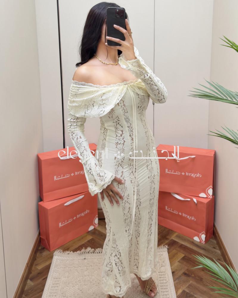 فستان دانتيل أوف شولدر أبيض ناعم بأكمام طويلة – تصميم سهرة أنيق