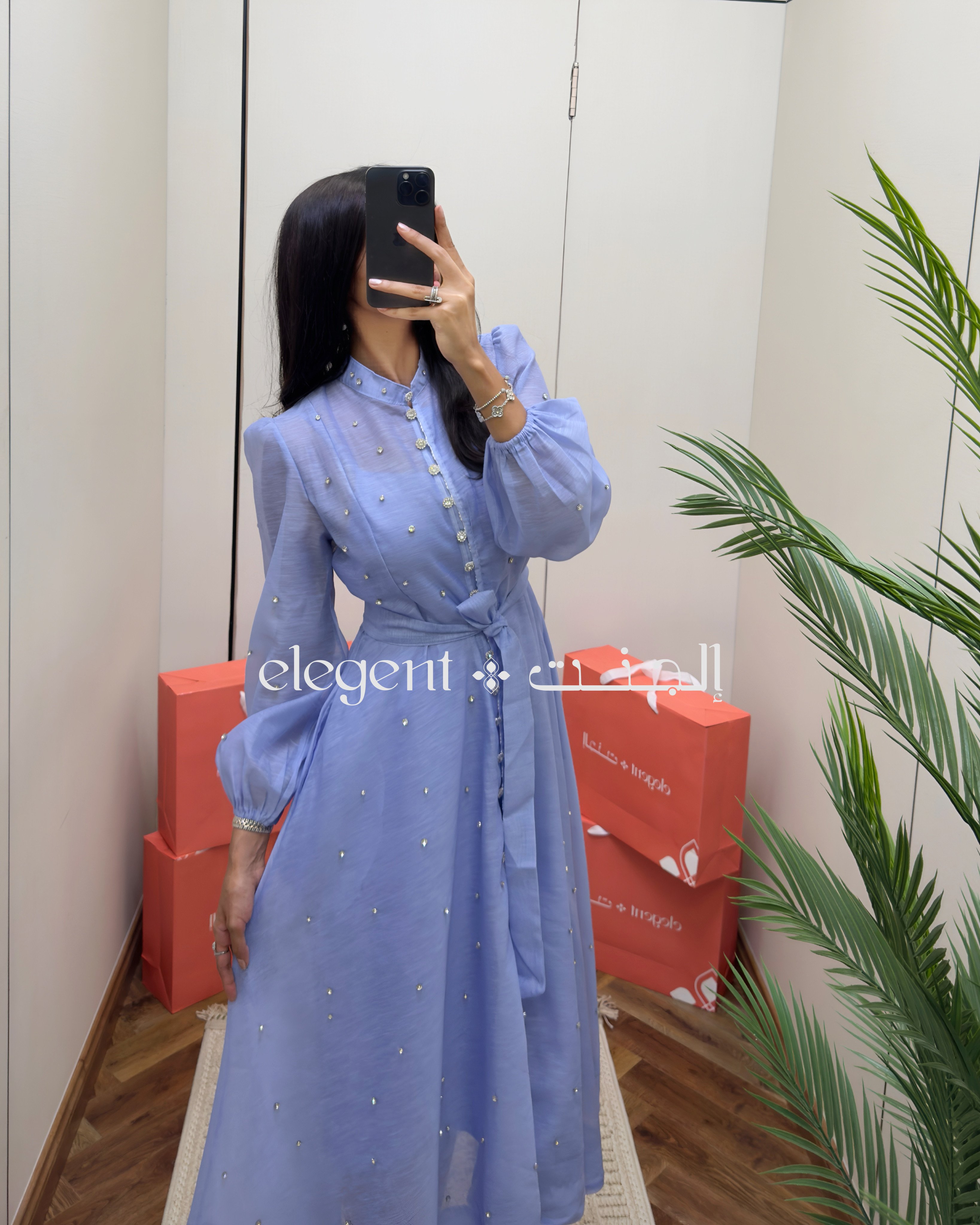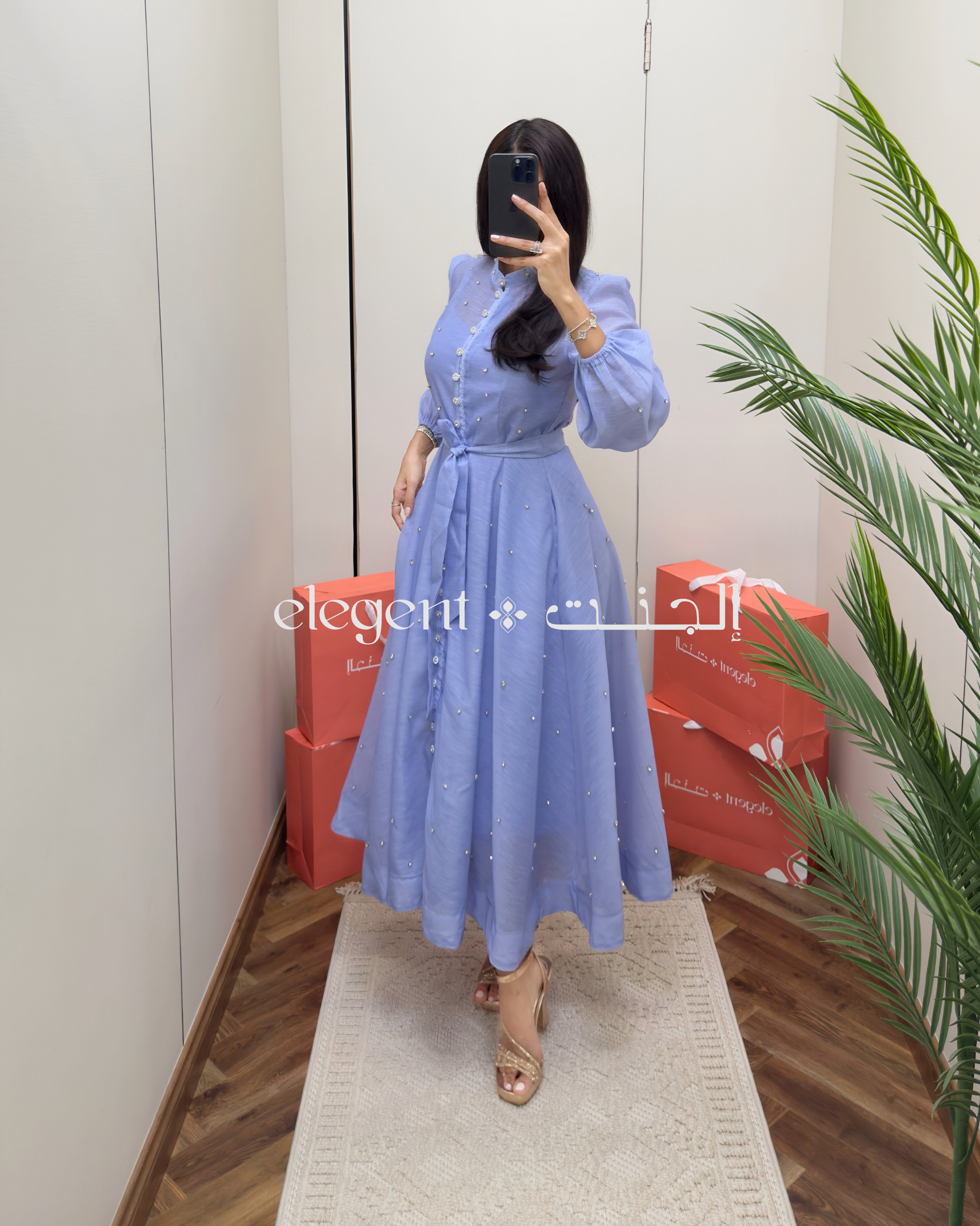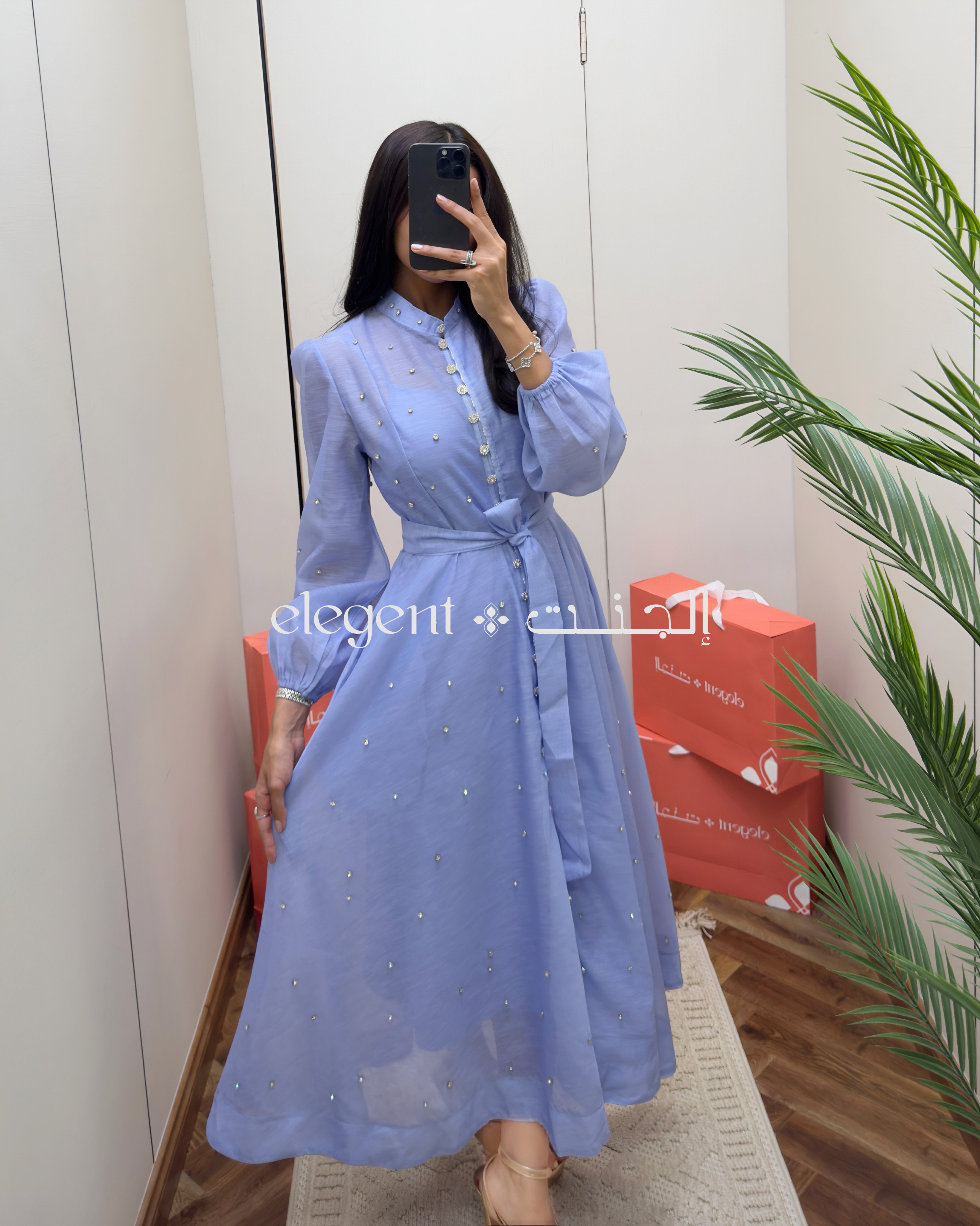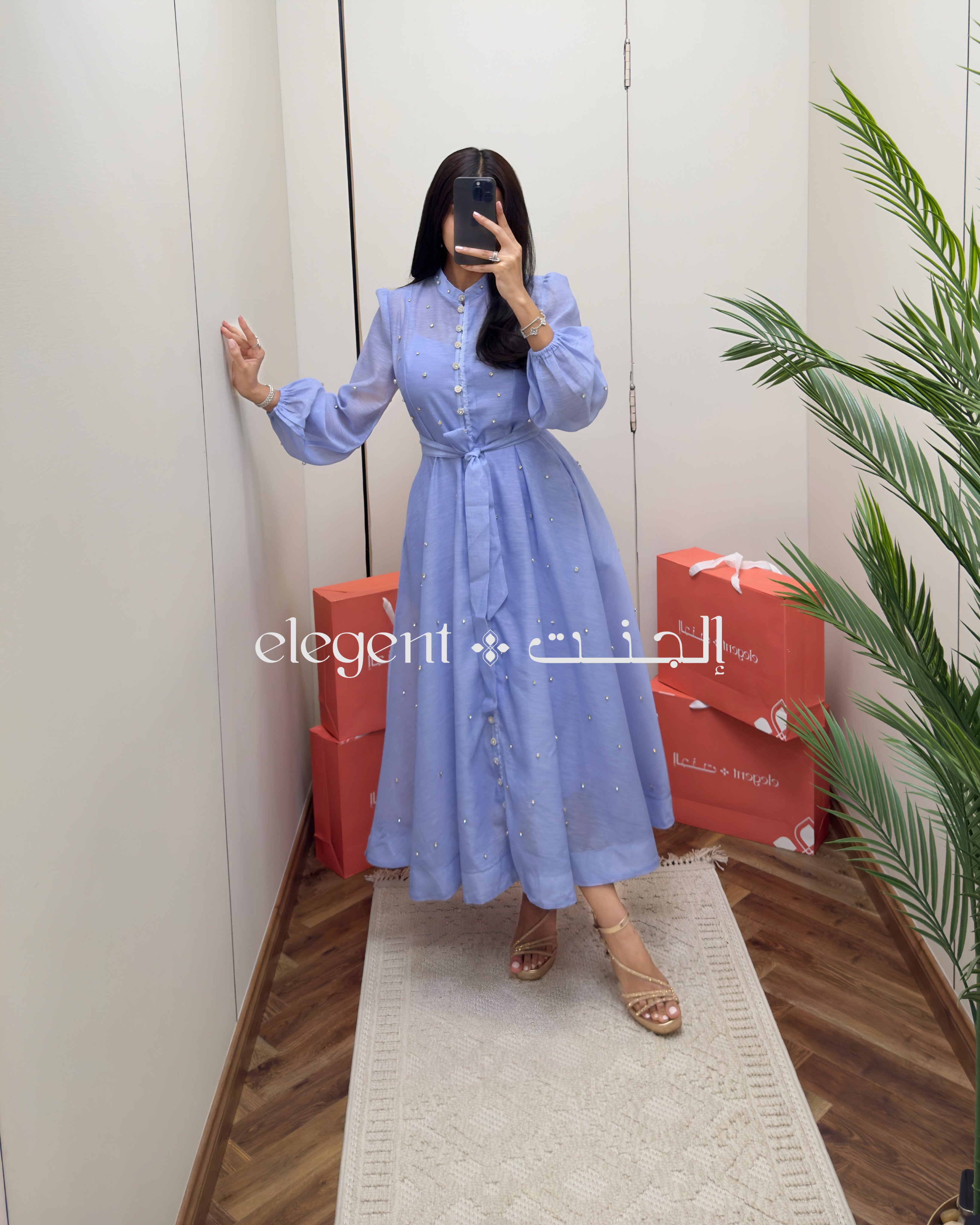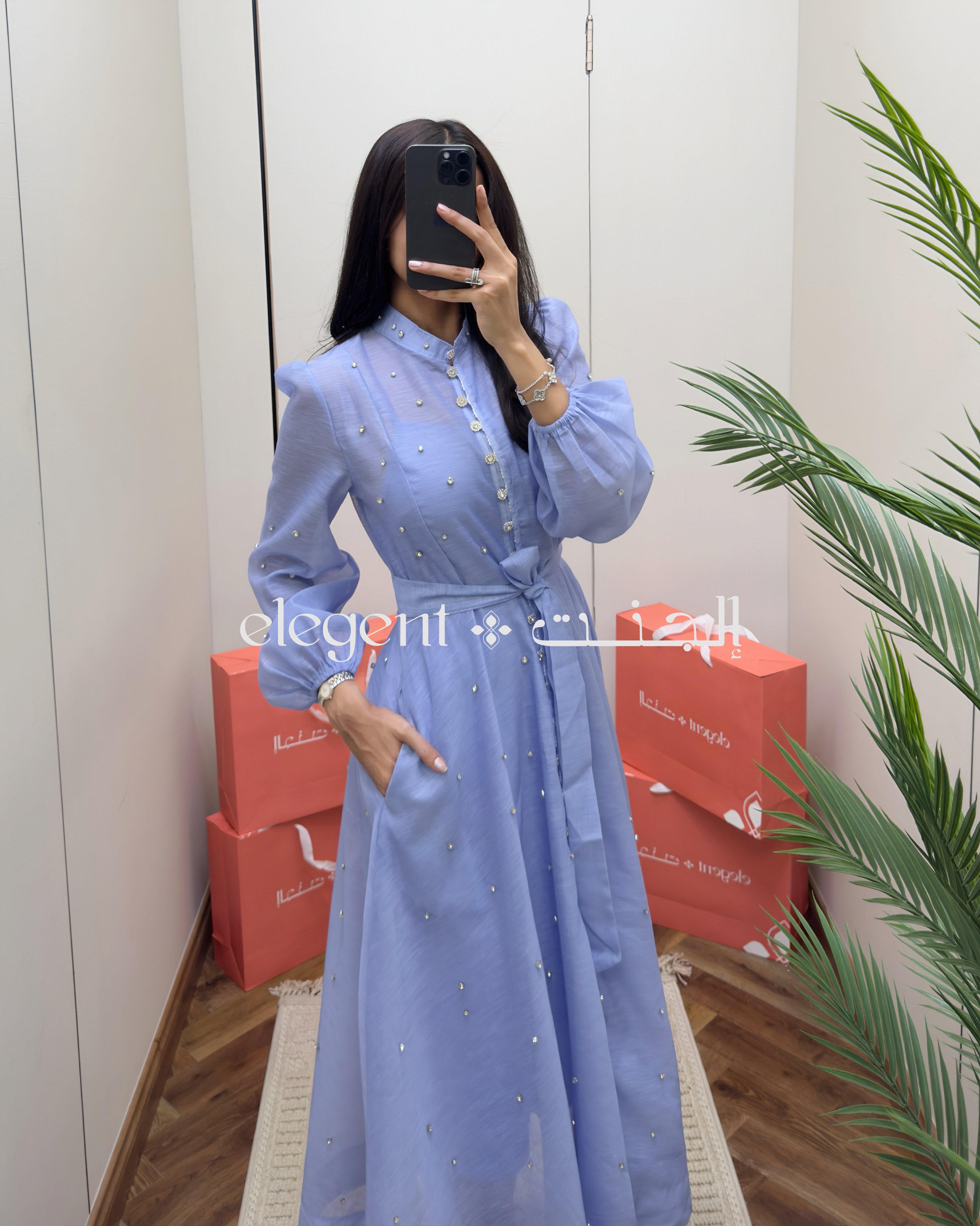 تألقي بإطلالة ناعمة وراقية مع هذا الفستان السماوي الطويل، المصمم بأكمام منفوخة وأزرار أمامية وتفاصيل لؤلؤية تزين القماش بكل أناقة.