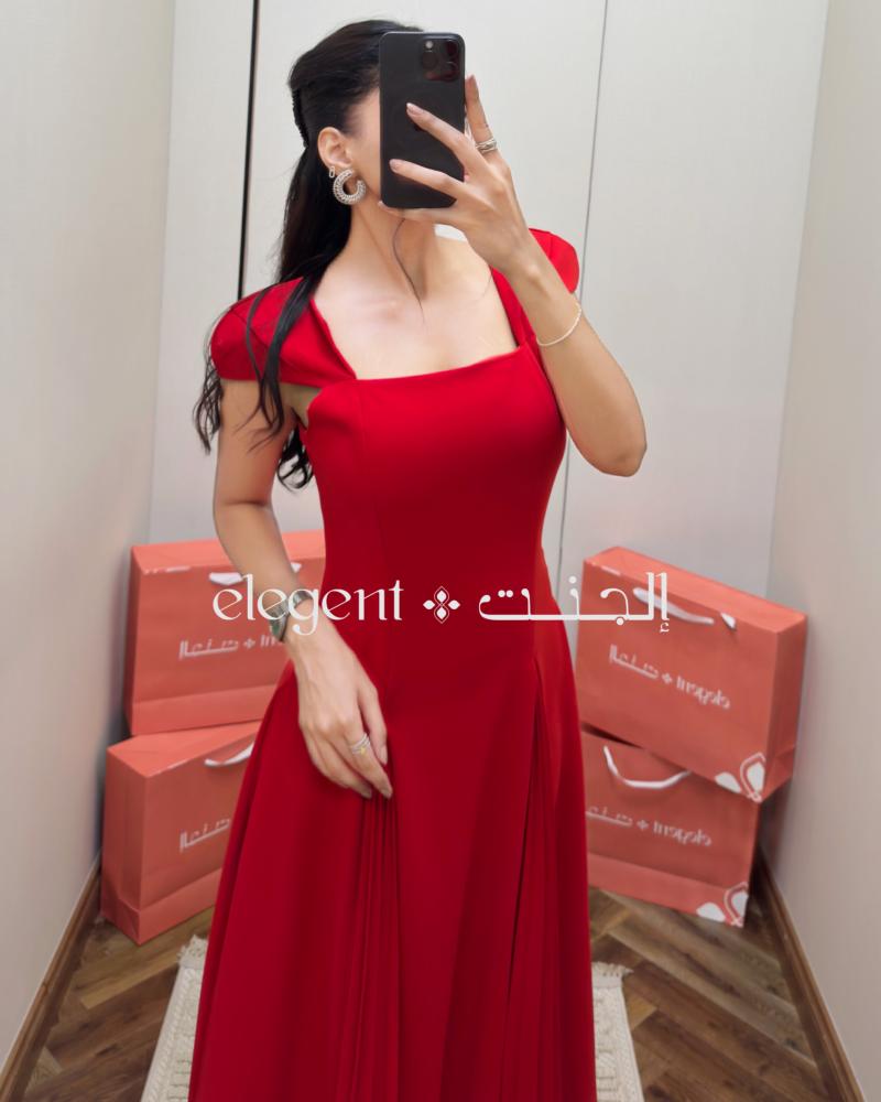 فستان سهرة أحمر ناعم بقصة واسعة وطلقات أكمام فاخرة