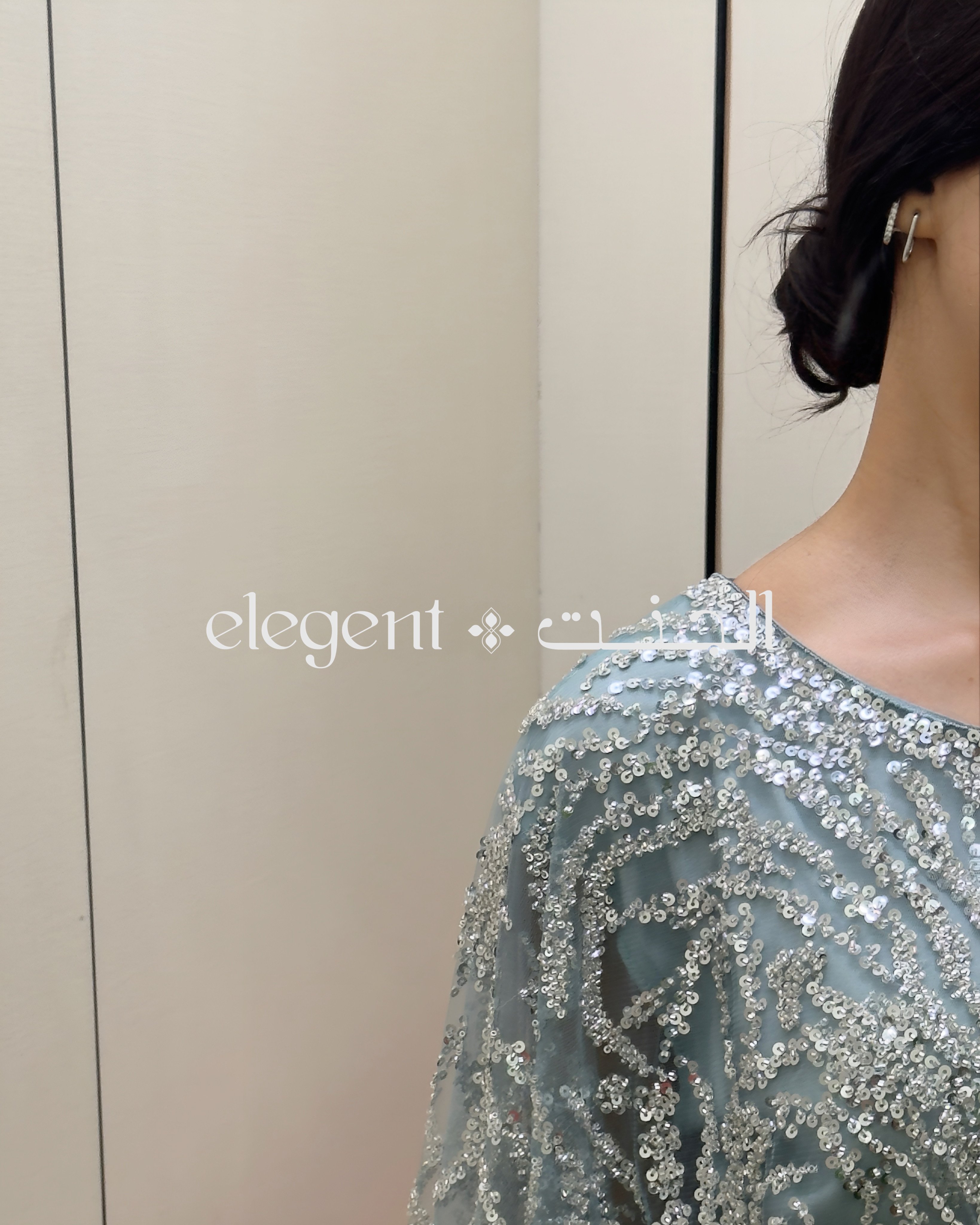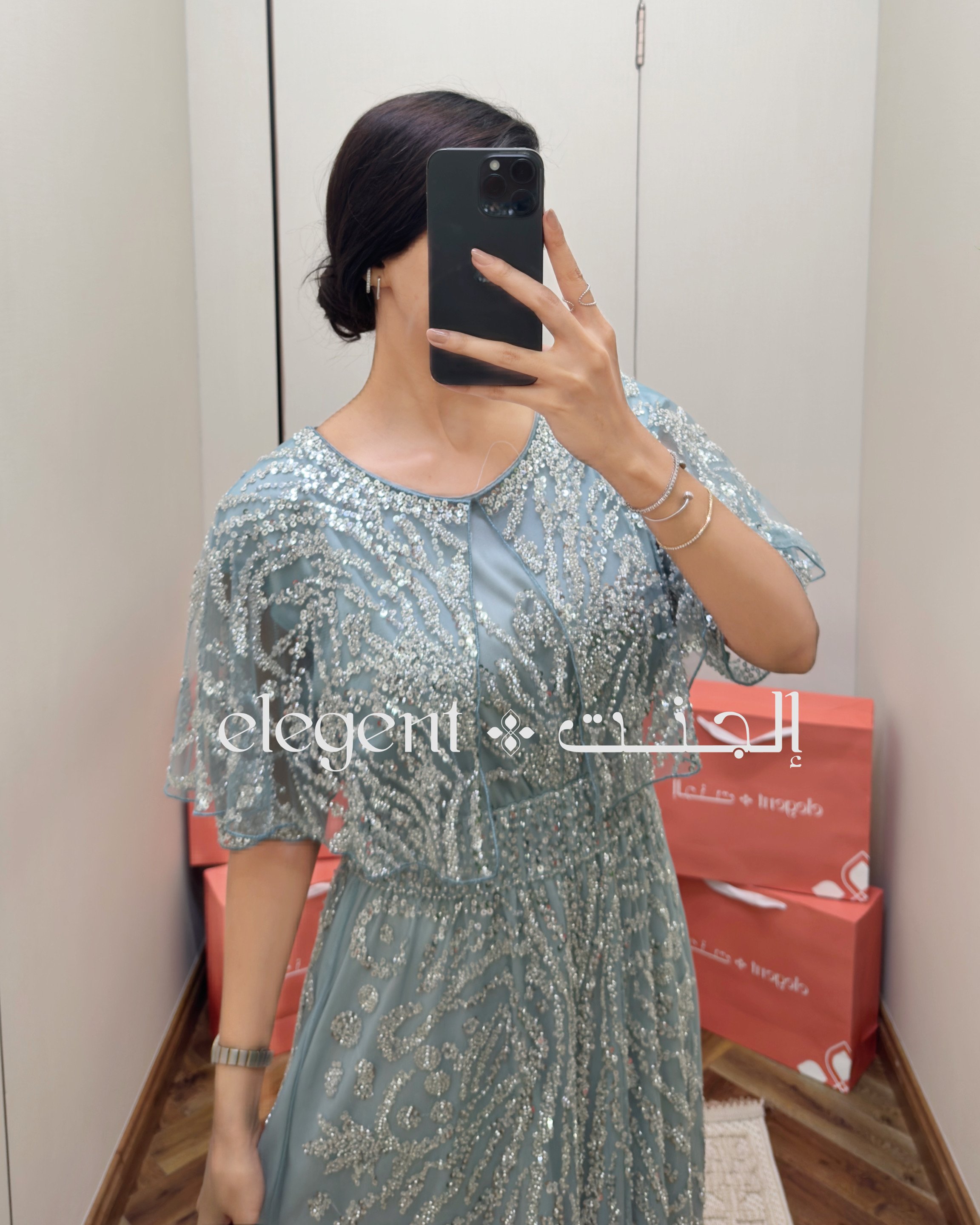 تميزي بإطلالة راقية مع هذا الفستان الأزرق الفاتح المطرز بالكامل بالترتر الفاخر. تصميم كلاسيكي بأكمام كاب أنيقة وخامة فاخرة تعكس أنوثتك في المناسبات الخاصة. مناسب لحفلات الزفاف، والسهرة، والمناسبات الرسمية.