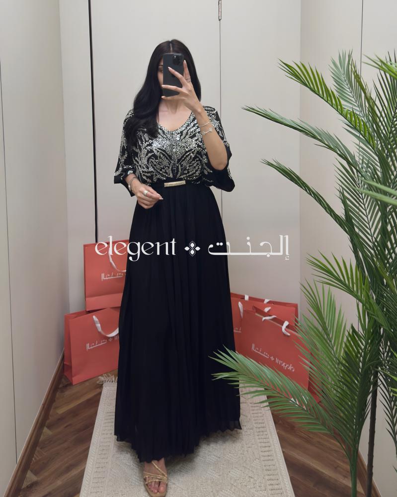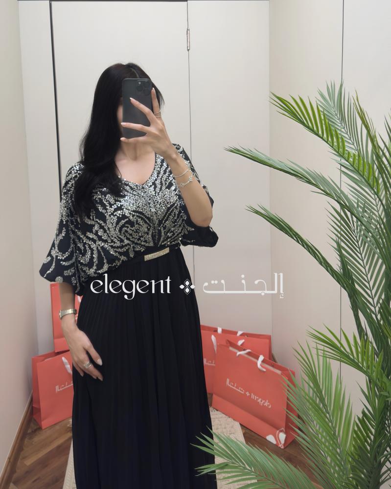 فستان سهرة أنيق بلون أسود ملكي، يتميز بتطريز بارز من الترتر الفضي يغطي كامل الجزء العلوي بتصميم فني جذاب. القصة العلوية تأتي بقَصة فضفاضة مريحة وأكمام متوسطة الطول، مع حزام ذهبي يحدد الخصر. التنورة الطويلة مكسره (بليسيه) تضيف لمسة أنثوية وانسيابية راقية. مناسب لحفلات الزفاف والمناسبات المسائية والسهرات الفخمة.