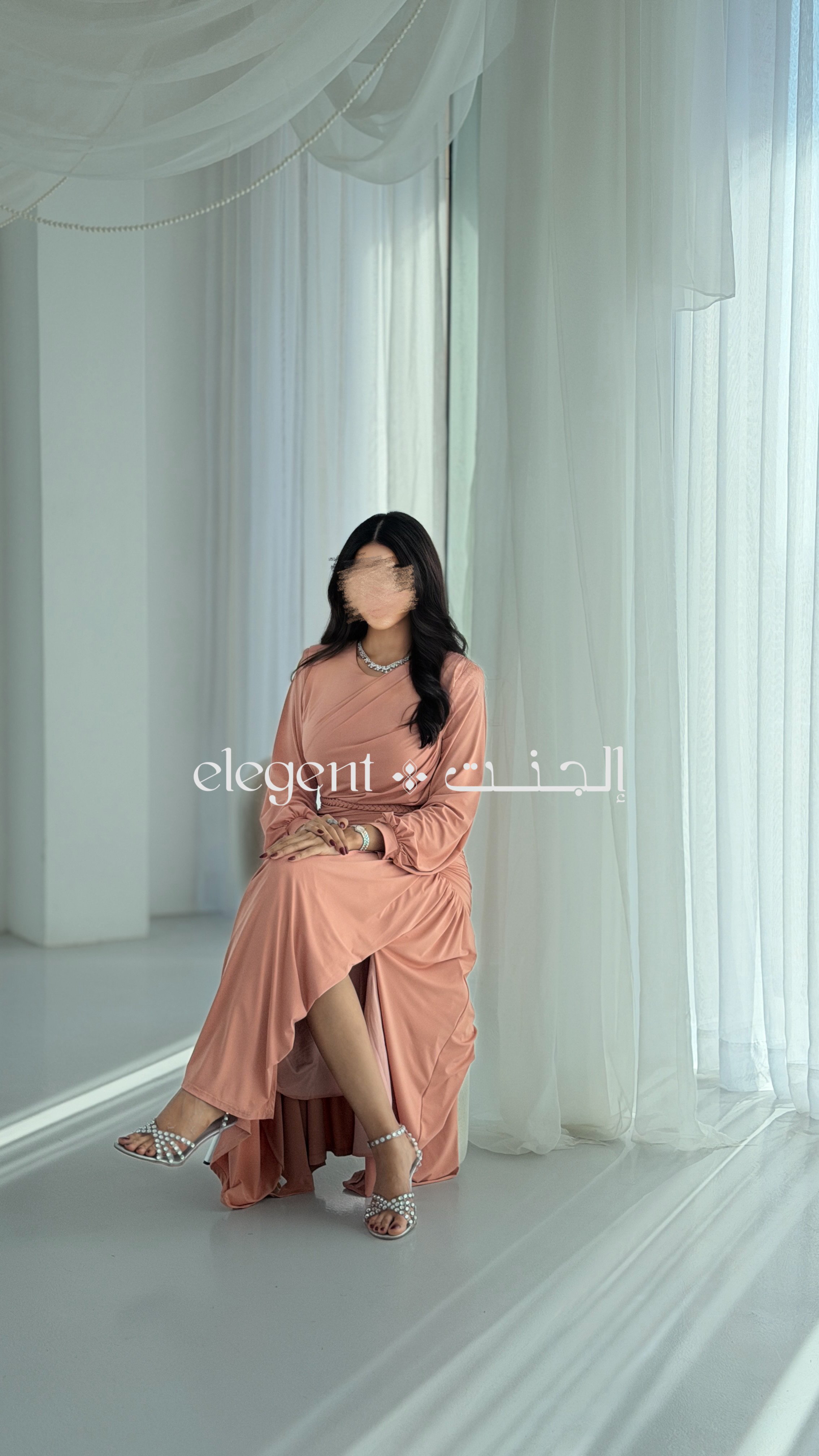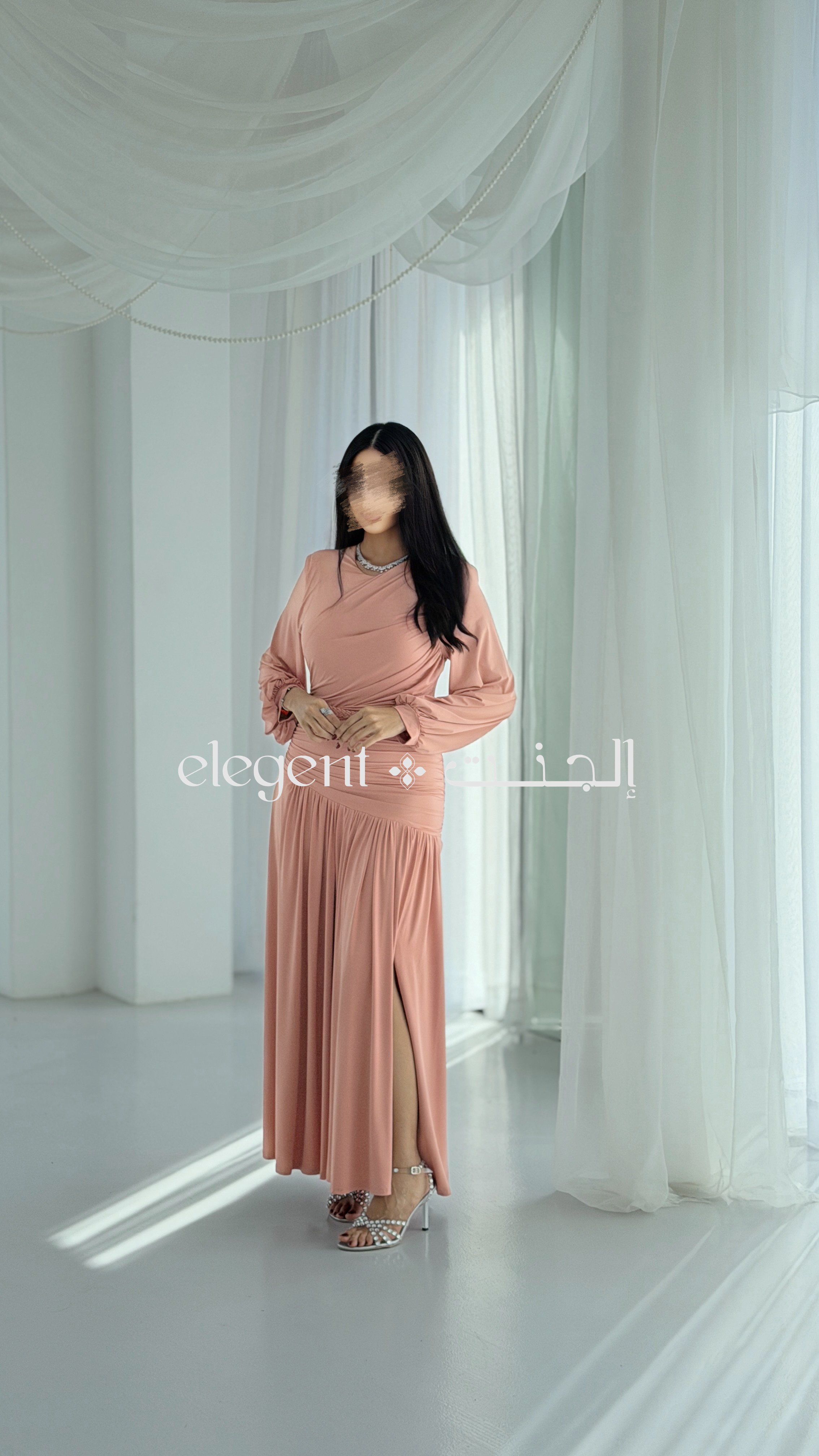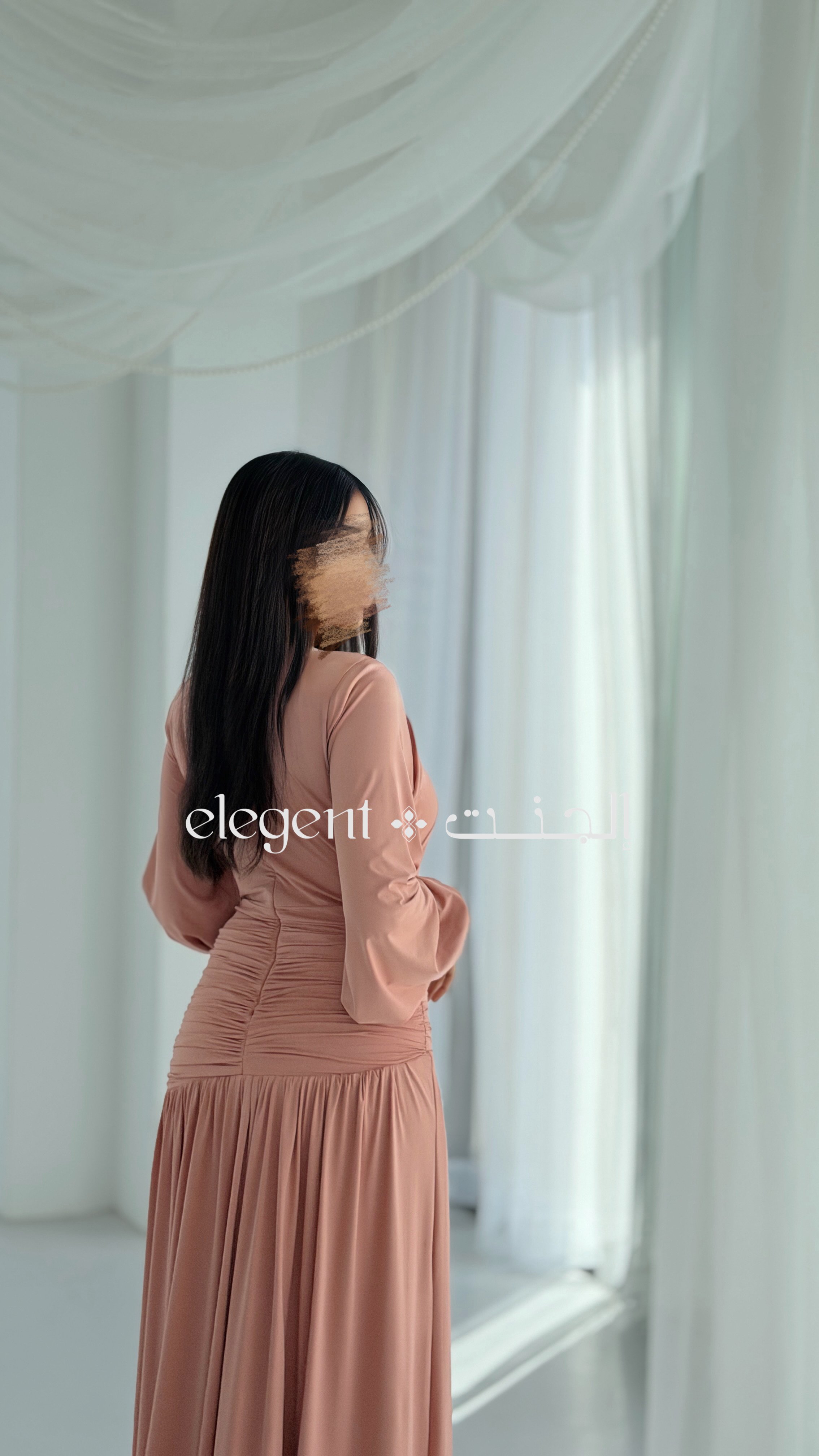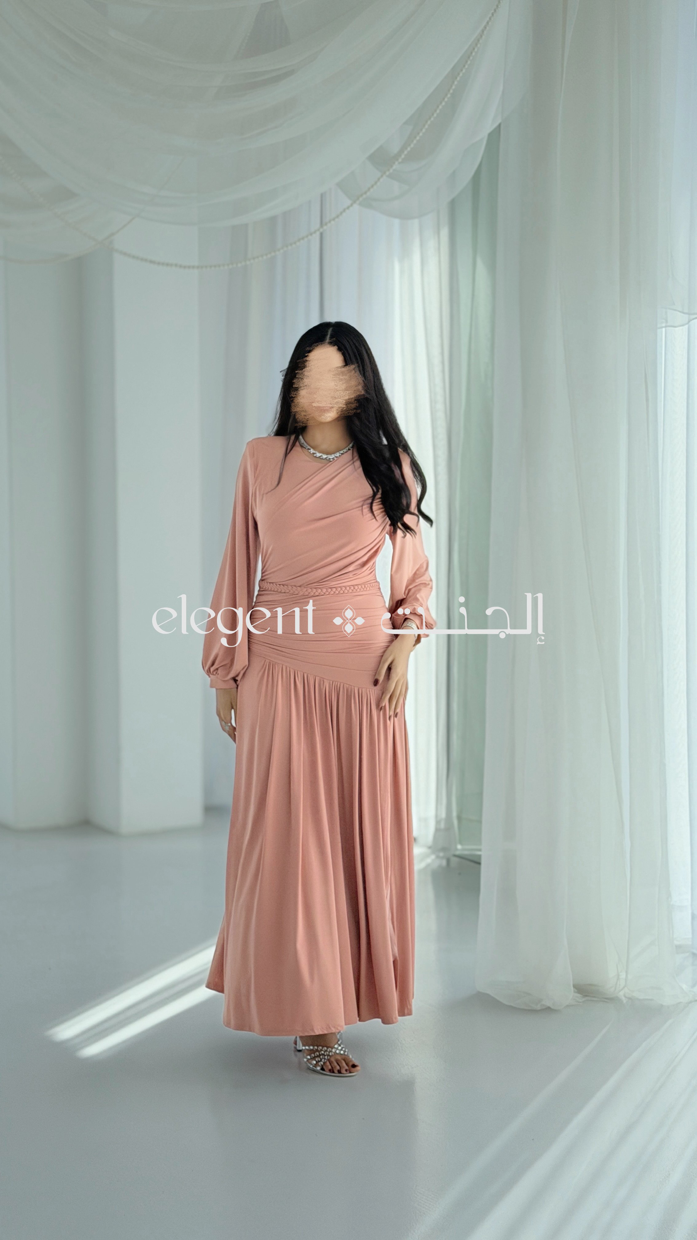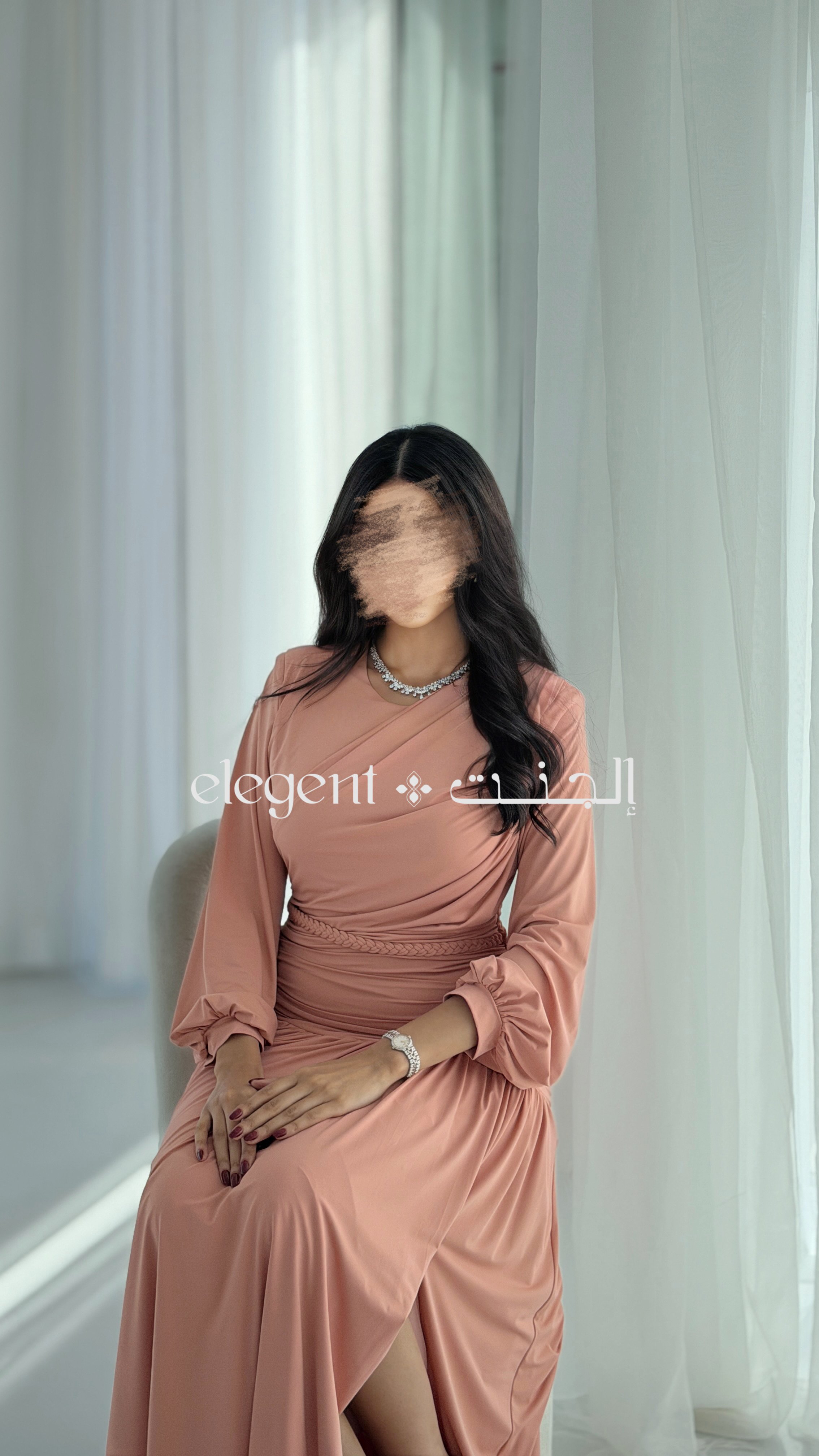 فستان سهرة ناعم باللون اللحمي بتصميم راقٍ يبرز جمال القوام بلمسة أنثوية هادئة. يأتي الفستان بقماش ستريتش مريح مع درابيات أنيقة على الصدر والخصر، إضافة إلى حزام مضفّر يحدد الخصر ويمنح القطعة طابعاً فخماً.