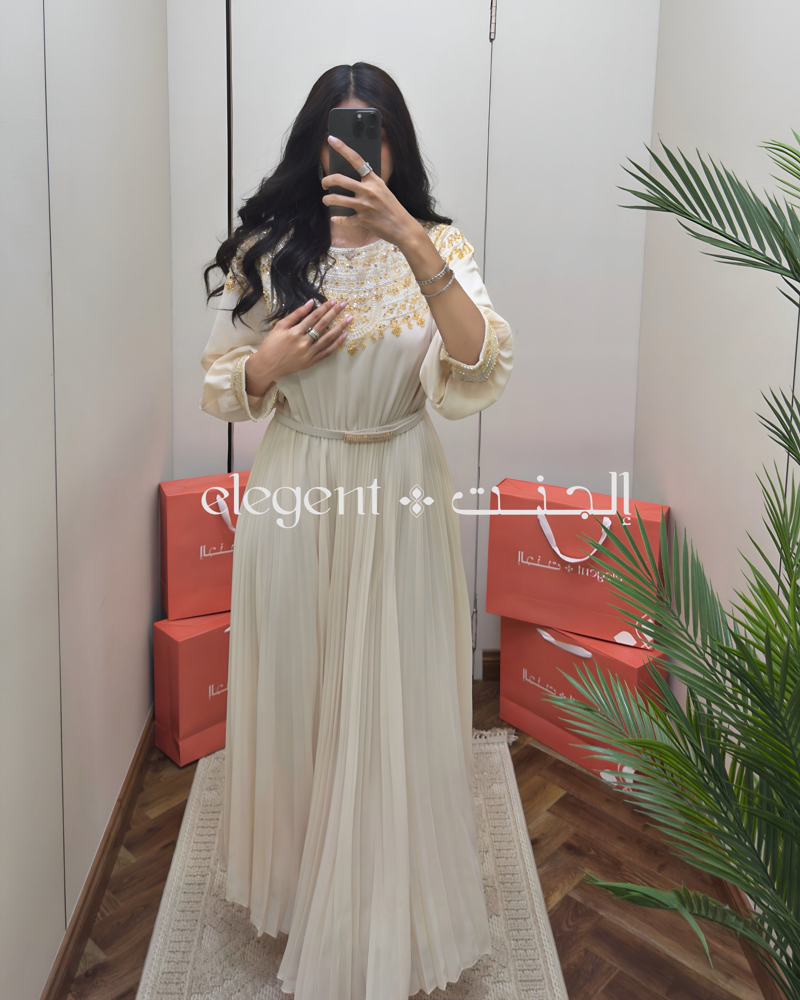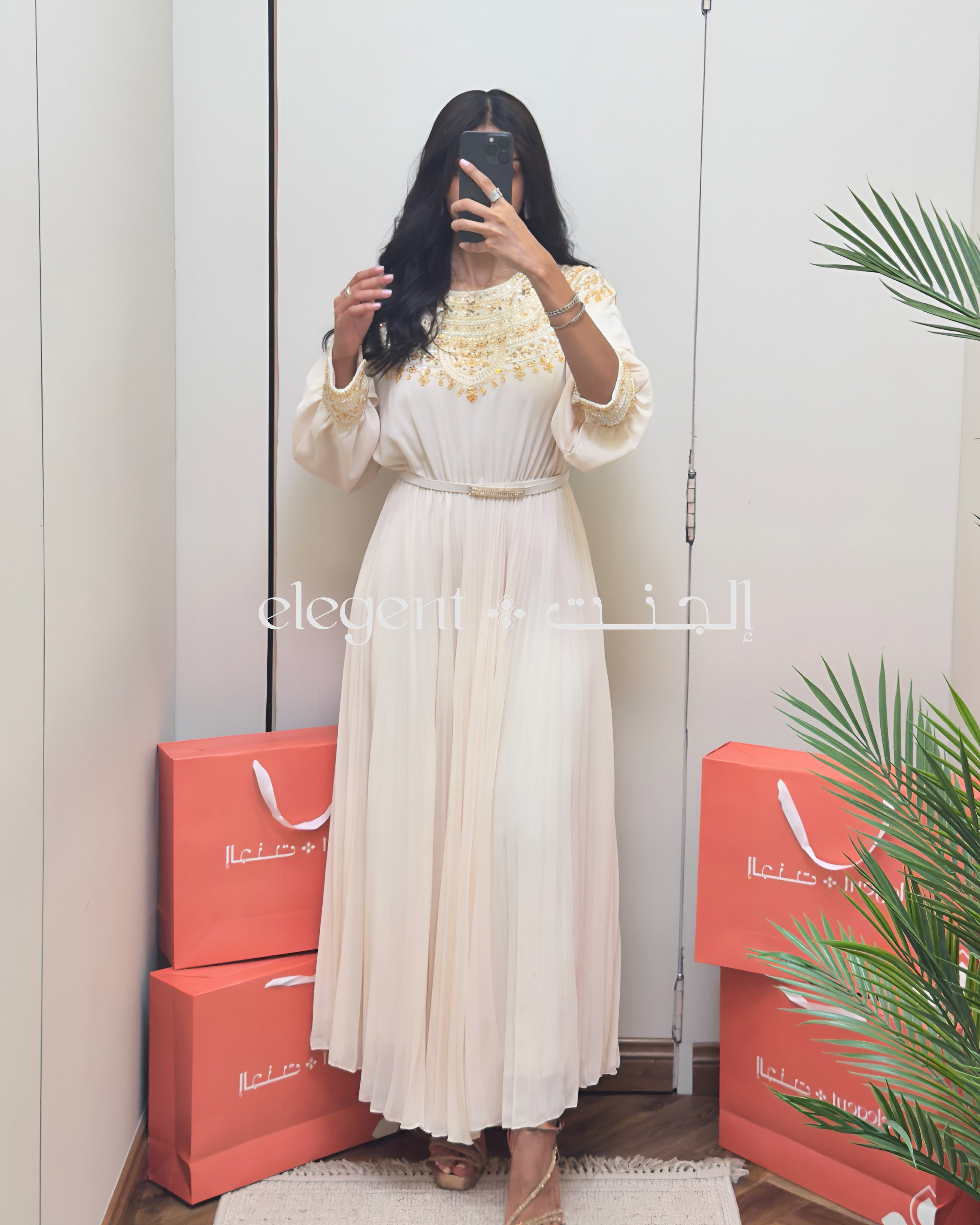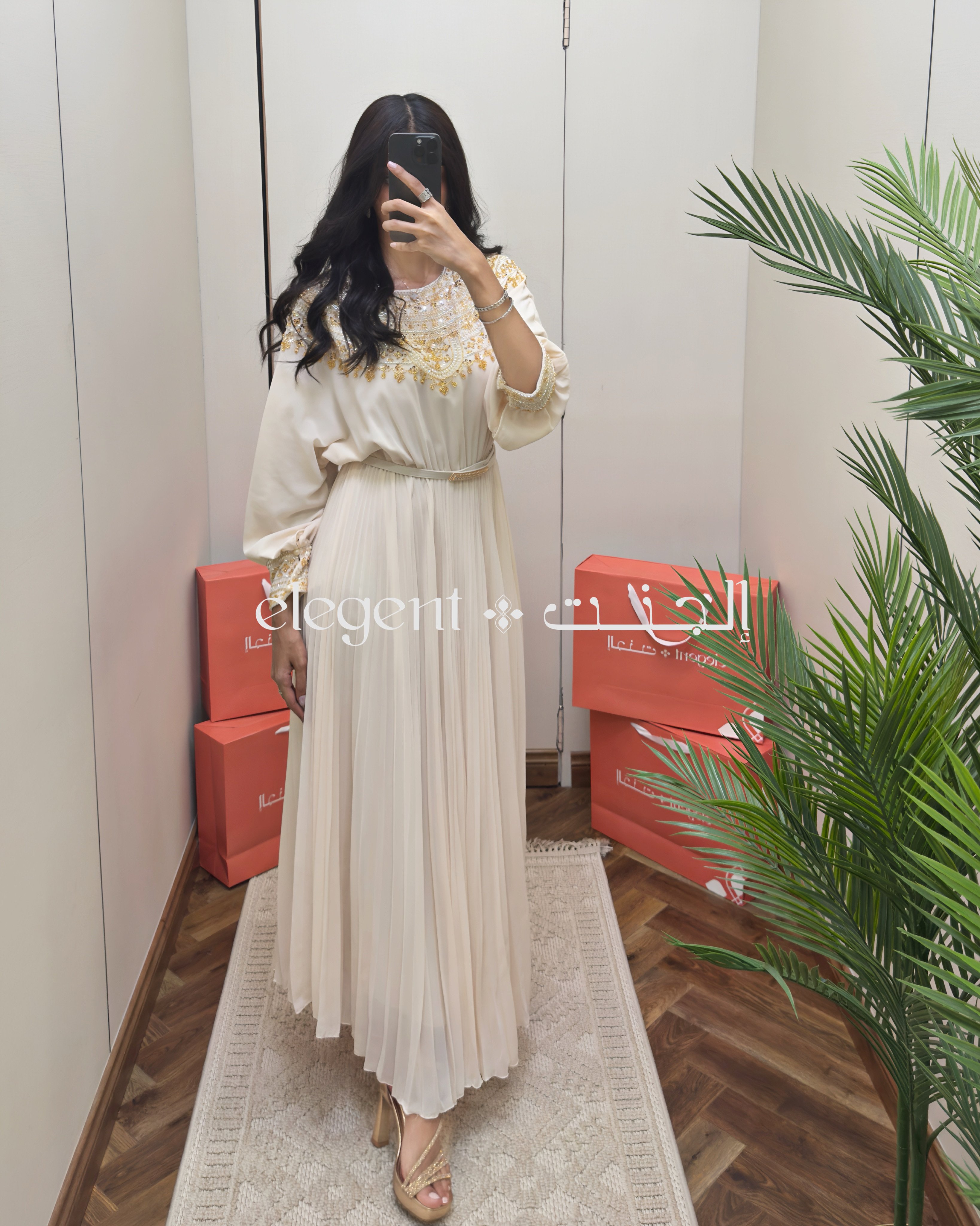 استمتعي بأناقة فريدة مع فستاننا الشيفون البيج المزين بالتطريز الذهبي الفاخر. تصميم واسع بأكمام بلمسة ملكية وتطريز دقيق على الكتف والصدر، يعطيكِ حضور راقٍ في المناسبات الخاصة. خامة شيفون ناعمة وخفيفة تنسدل بجمال مع حزام خصر يبرز القوام.