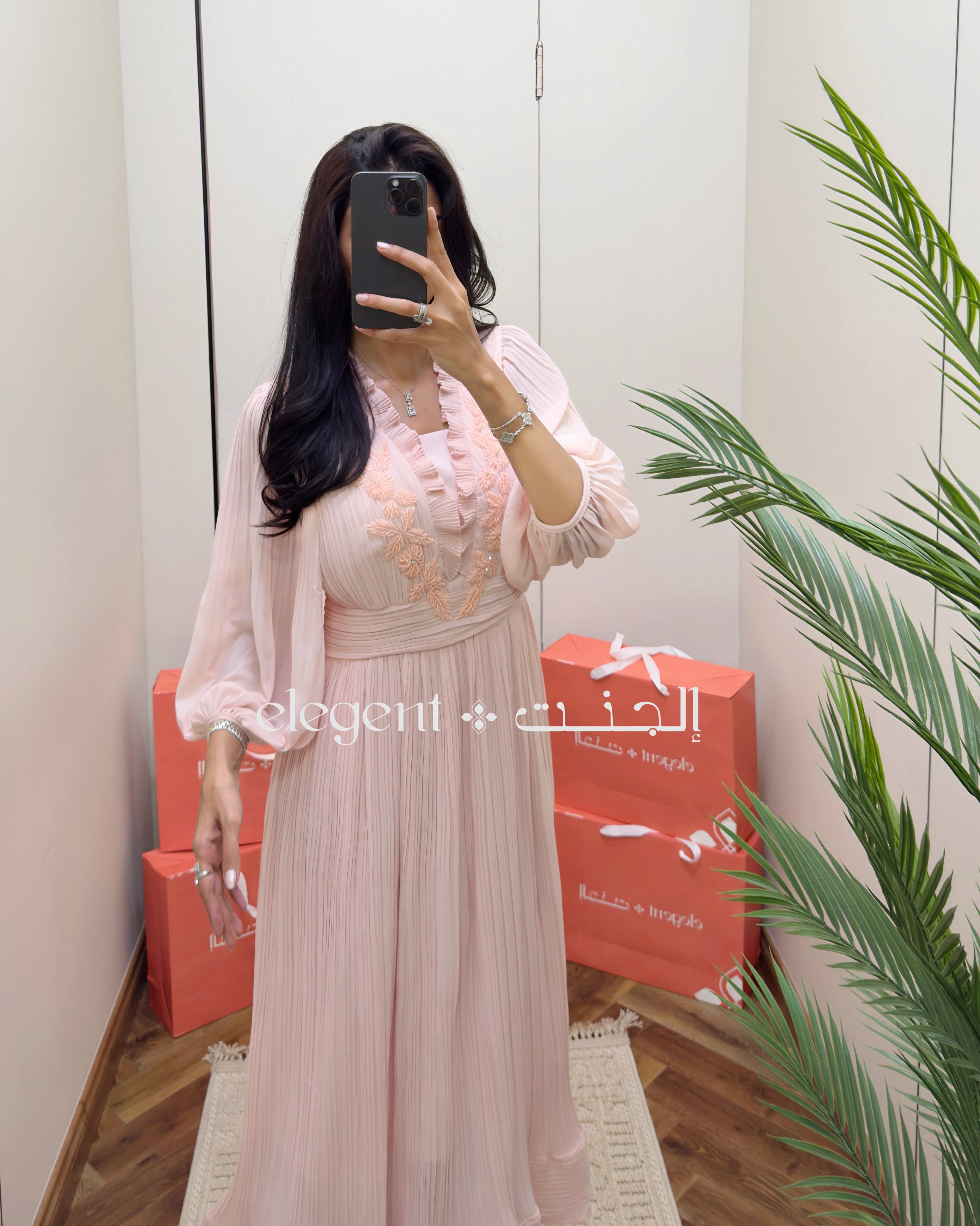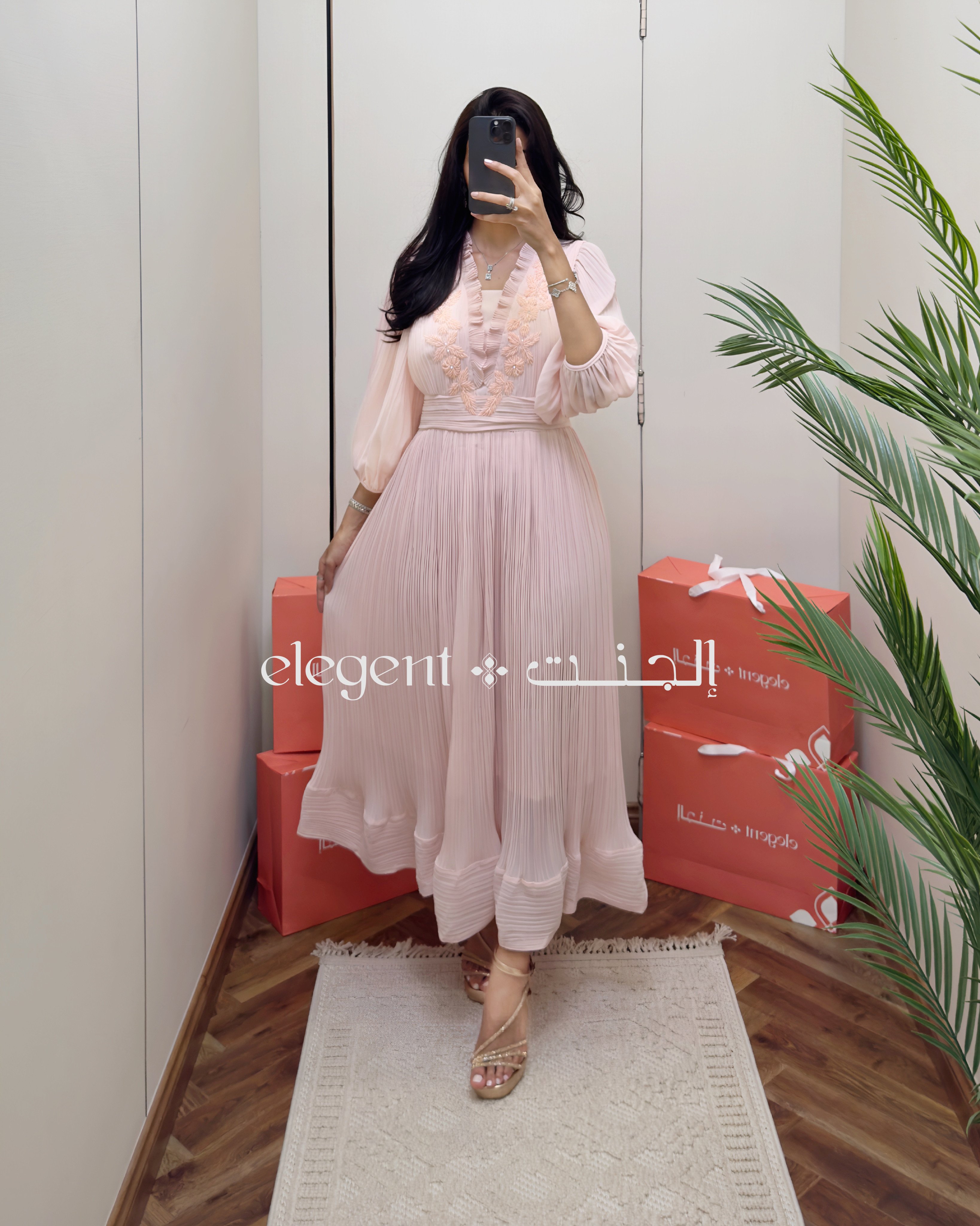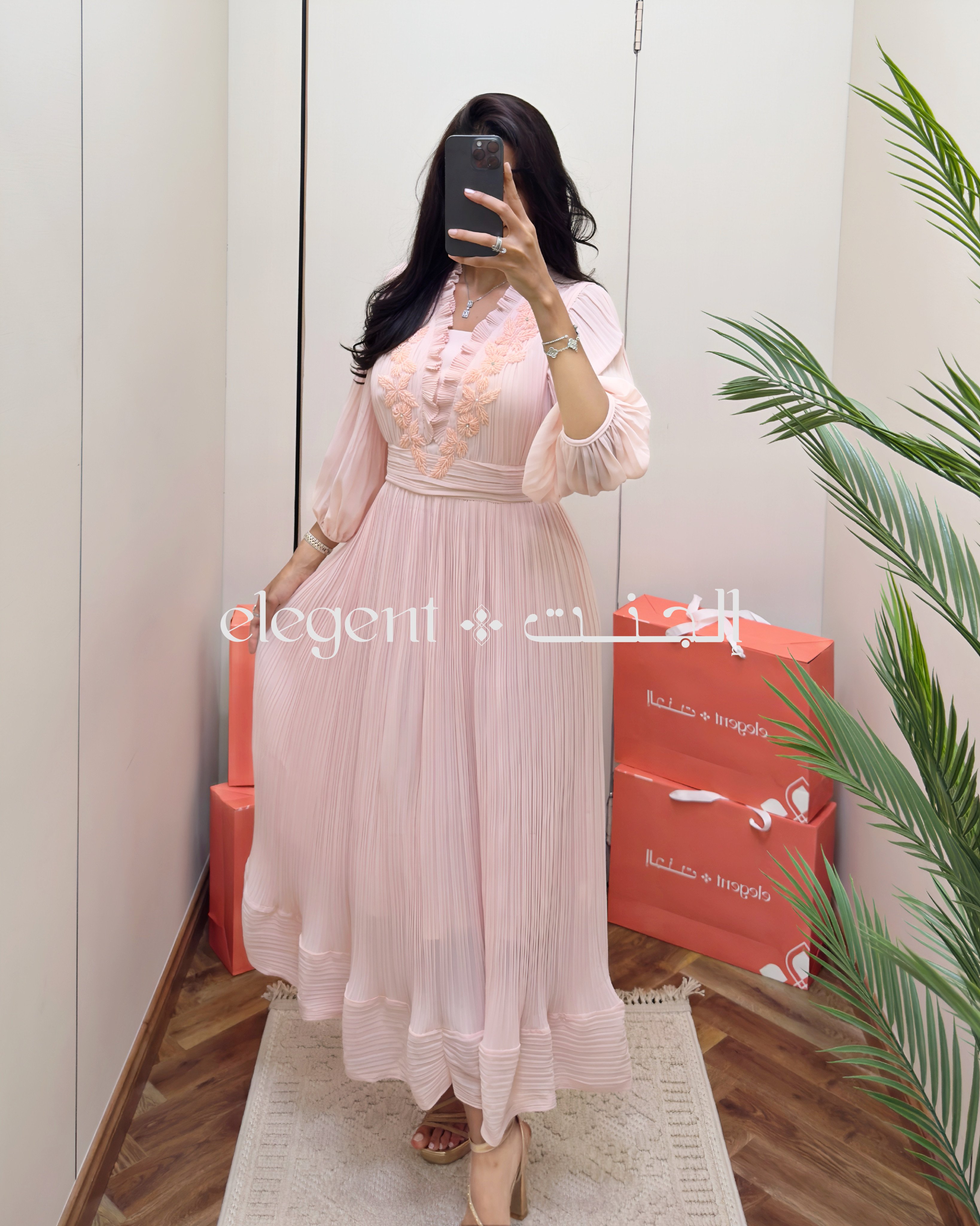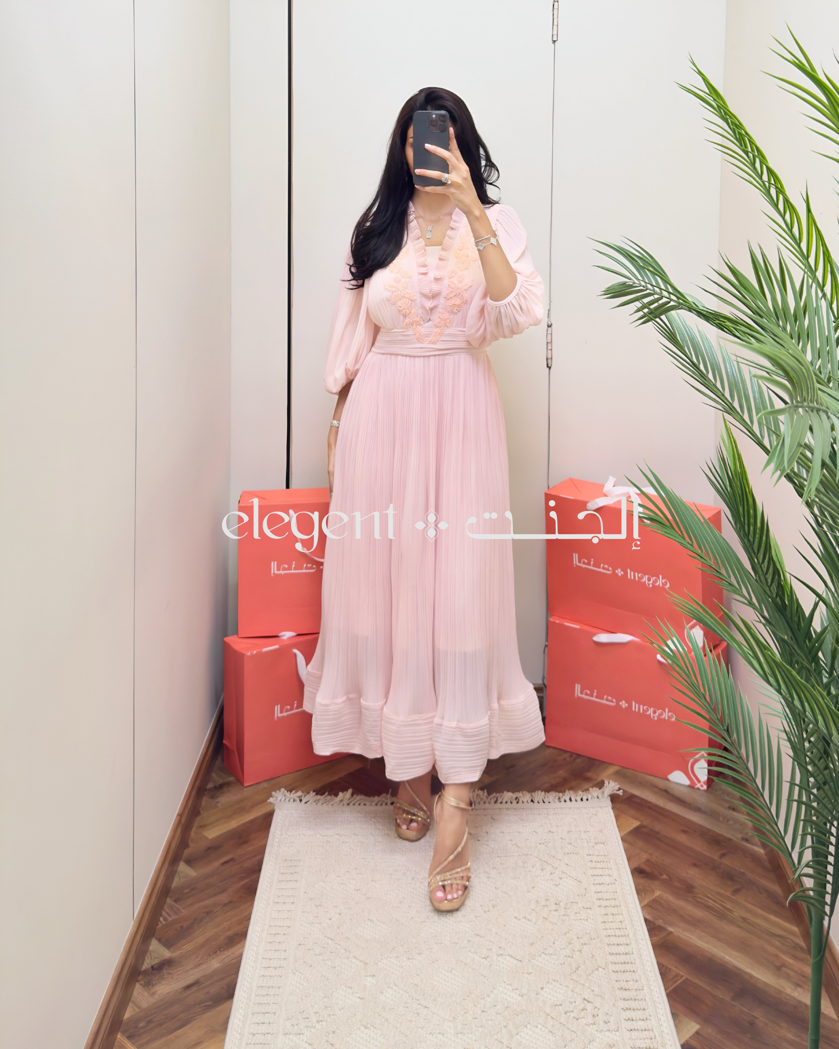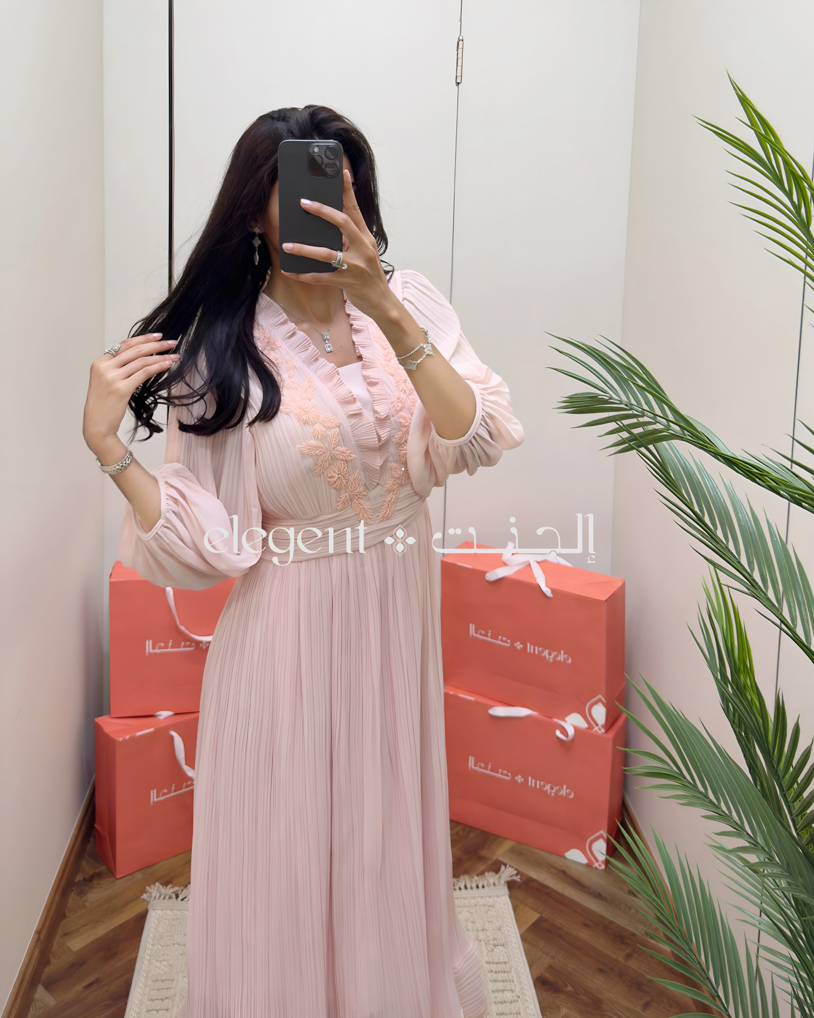 فستان وردي ناعم بتصميم مميز بكسرات رقيقة وتطريز ورود أنثوي على الصدر.