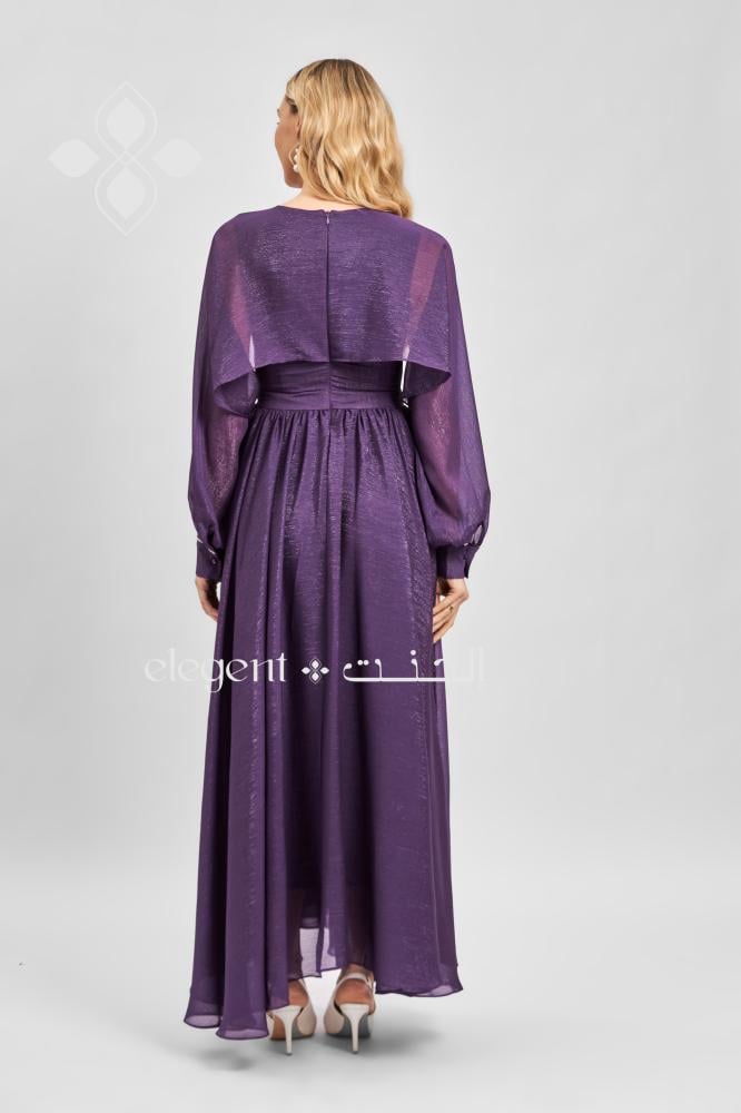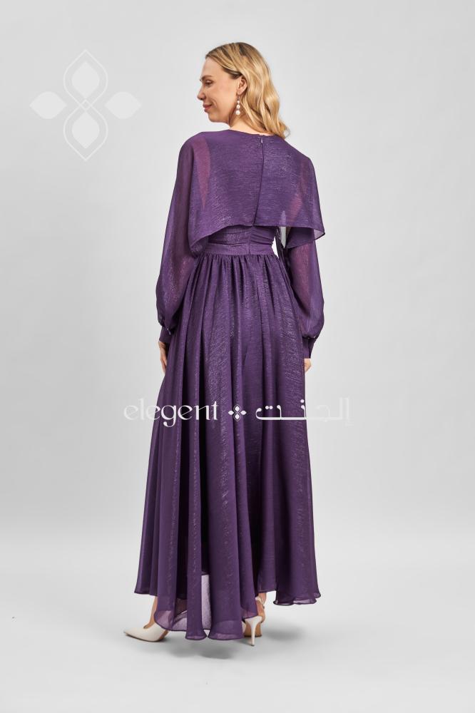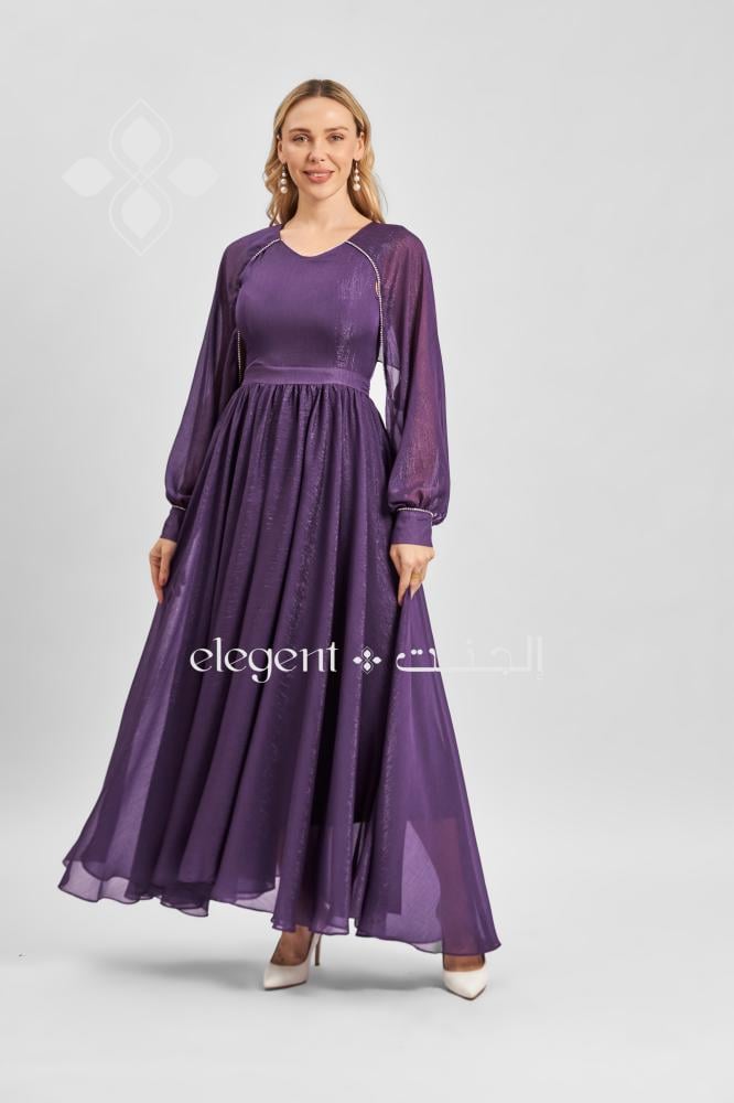فستان بنفسجي أنيق بتصميم مميز وأكمام طويلة شفافة تضيف لمسة من النعومة والرقي. يتميز بقصة واسعة من الأسفل لإطلالة أنثوية مفعمة بالجمال، مع تفاصيل على الأكتاف تعزز من فخامته. مثالي للمناسبات الخاصة والسهرة.